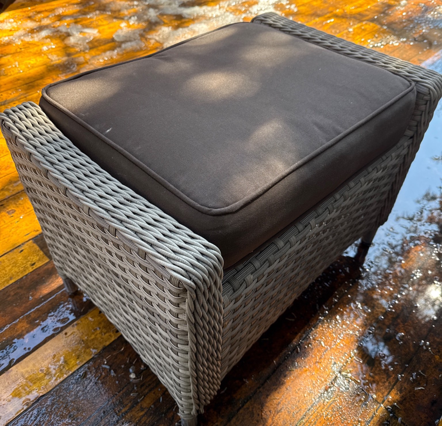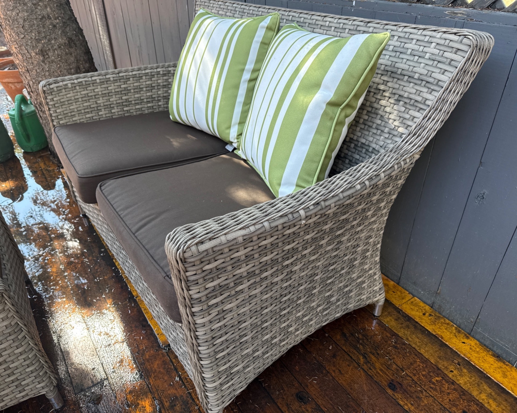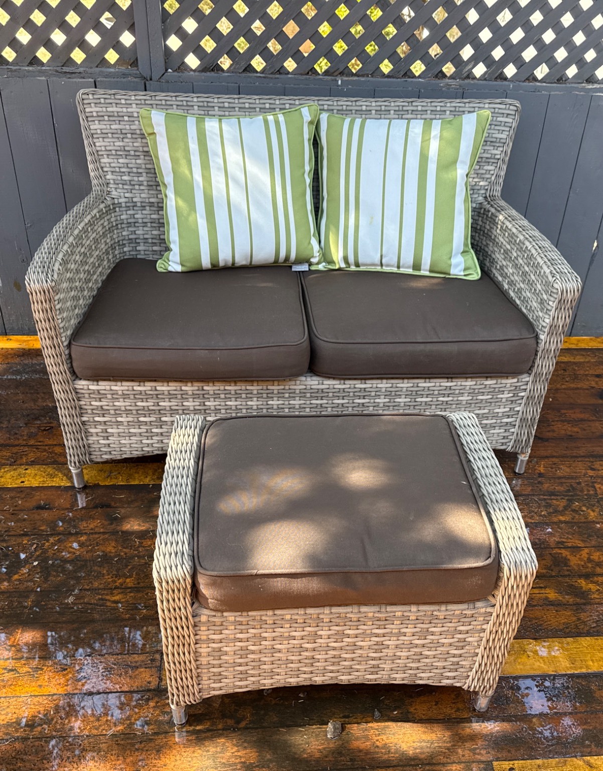 This charming outdoor set includes a woven wicker loveseat and a matching ottoman, perfect for patios, decks, or gardens. Both pieces come with removable brown cushions and the loveseat includes two striped lime-green and white accent pillows. The loveseat measures 50†W x 30†D x 35†H, and the ottoman measures around 24†W x 18†D x 15†H. Its neutral tones and functional design make it an ideal addition to any outdoor living space.