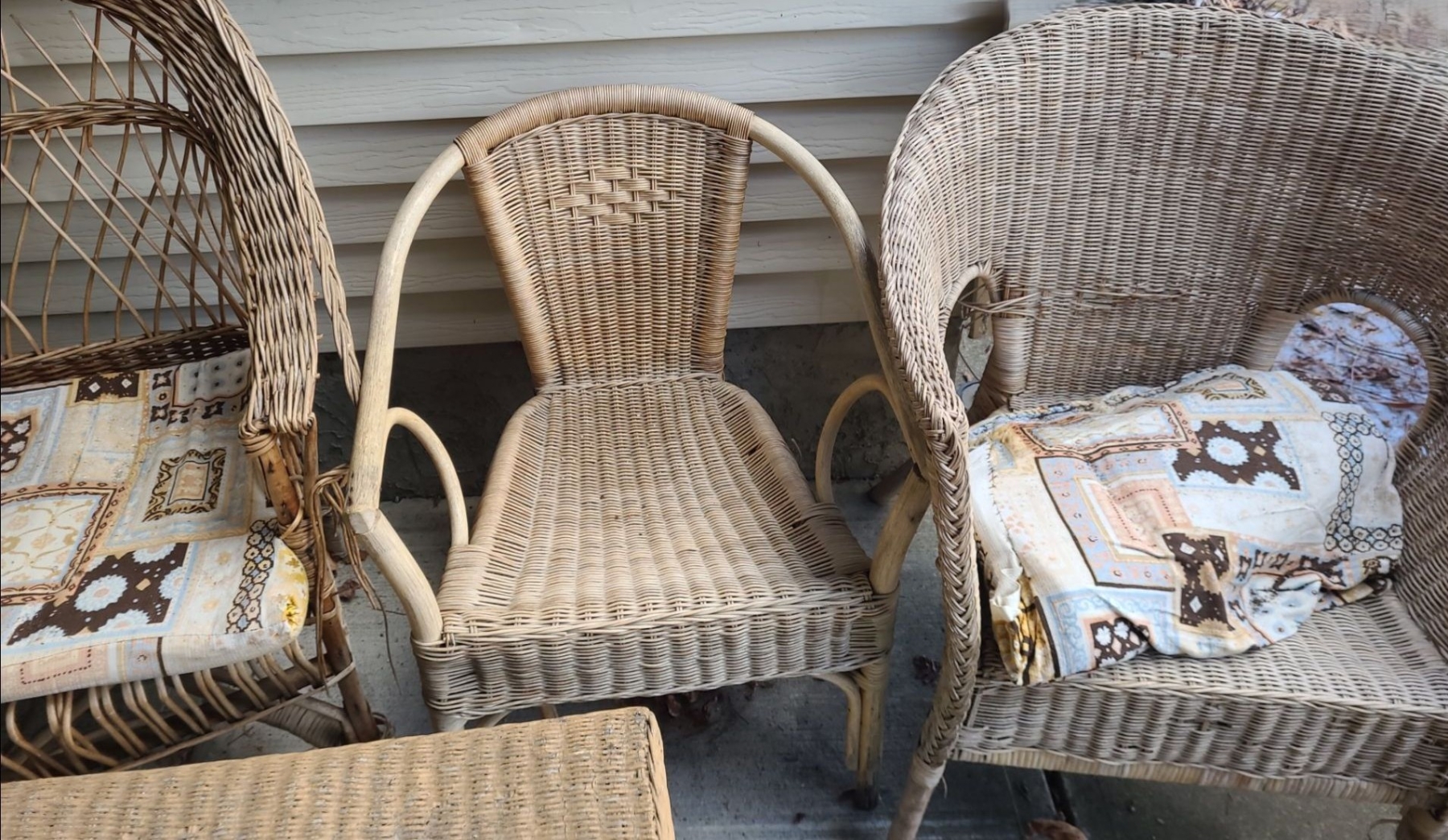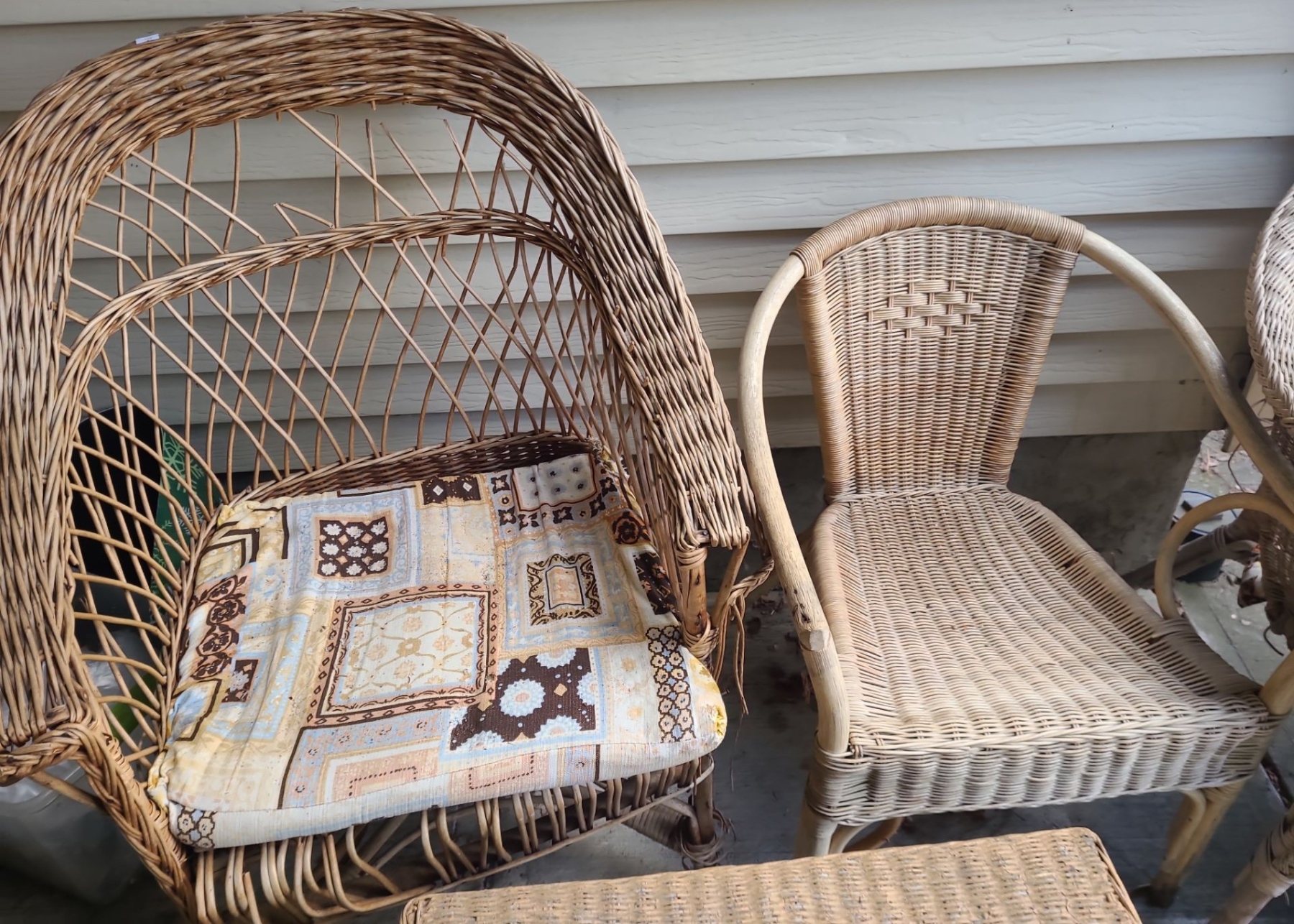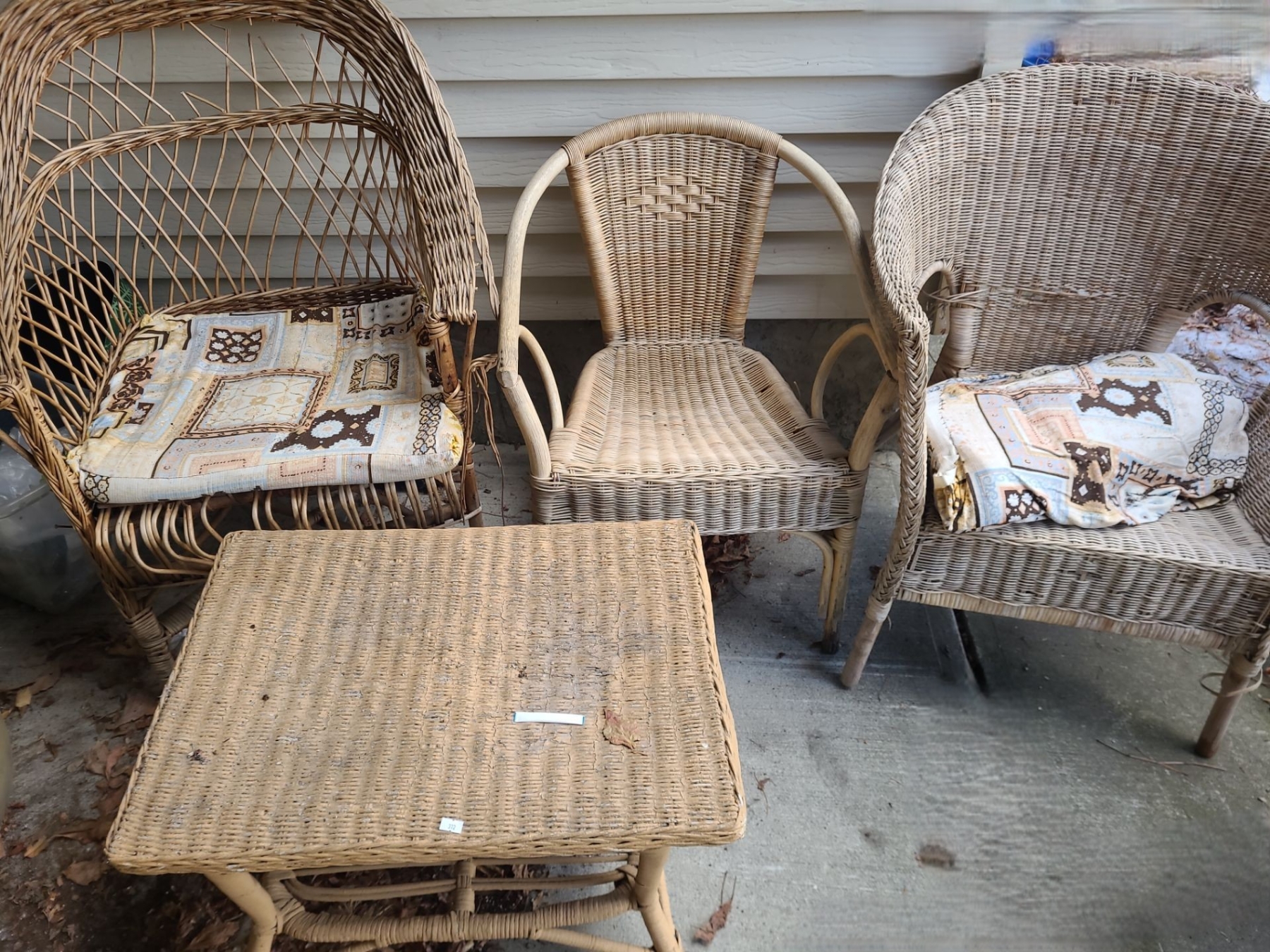Outdoor Wicker Table 25 W, 18 D, 18 T and Chairs- Tallest: 26 W, 20 D, 40 T