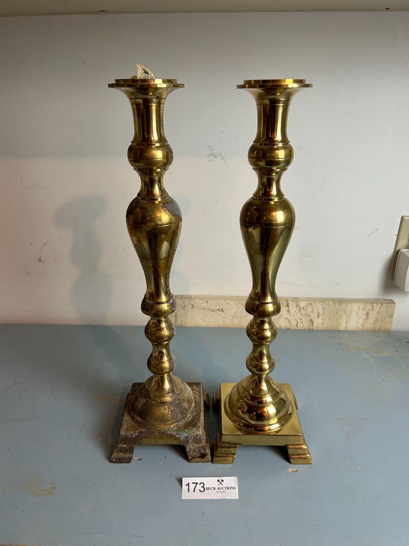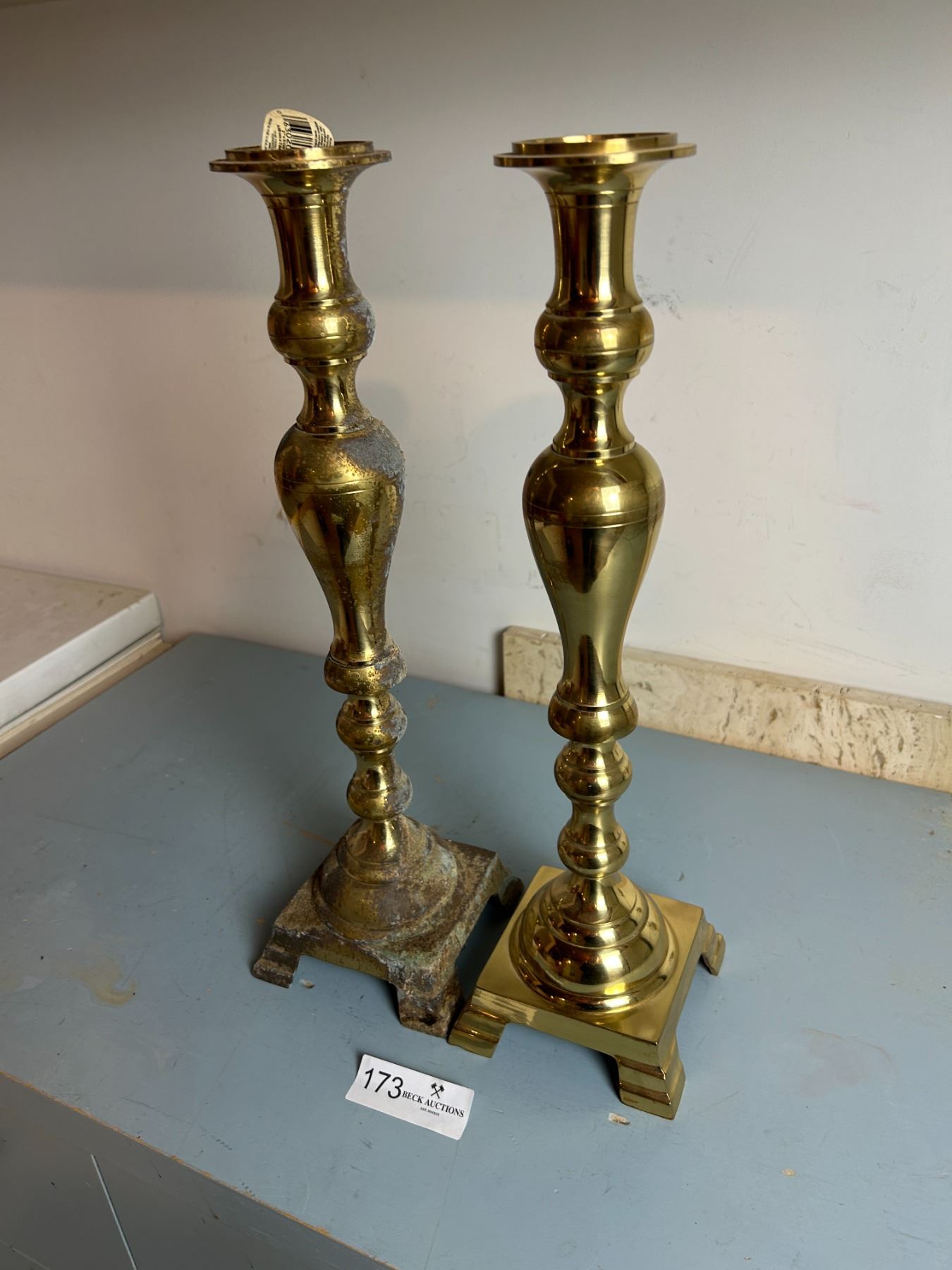 Pair Of Tall Brass Candle Holders One With Age Damage 18H