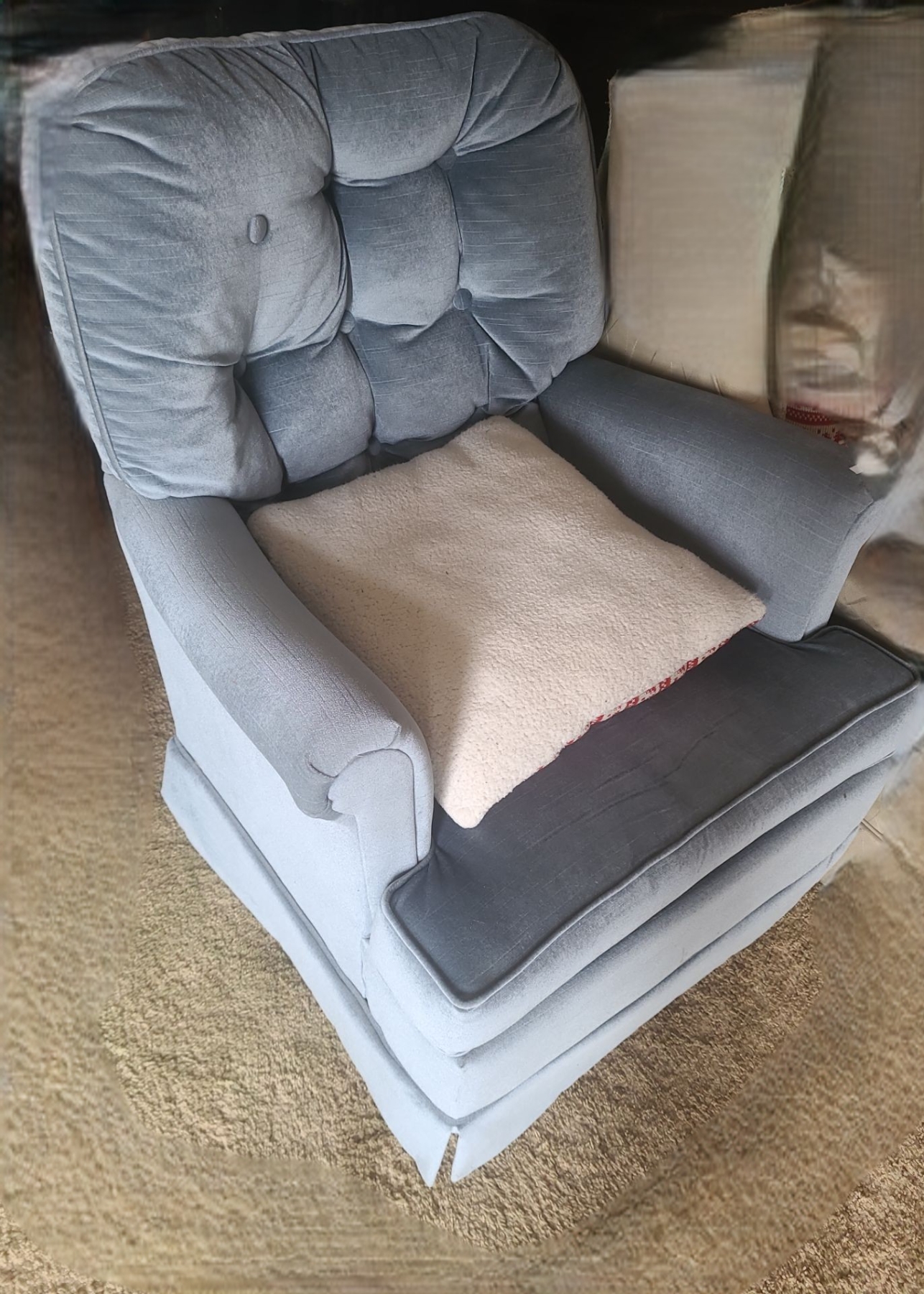 Pair of Chairs- Blue Rocking 29 W, 27 D, 31 T and Beige Microfibre 31 W, 30 D, 33 T
