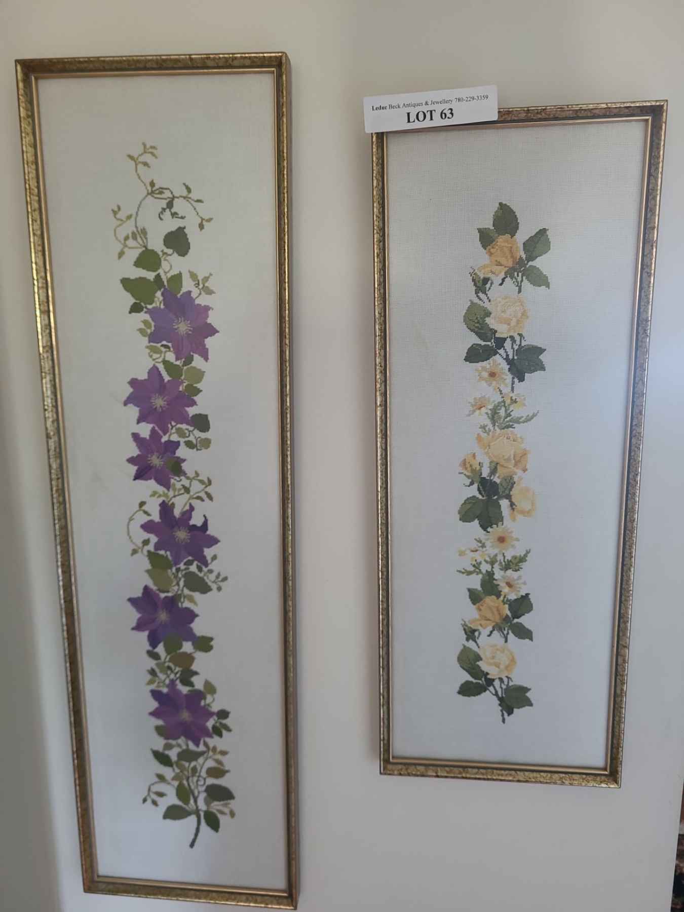 Pair of Framed Floral Needlepoint Pictures. 8 1/2 w, 23 h & 8 1/2 w, 31 h
