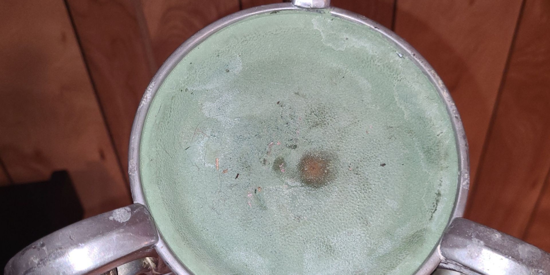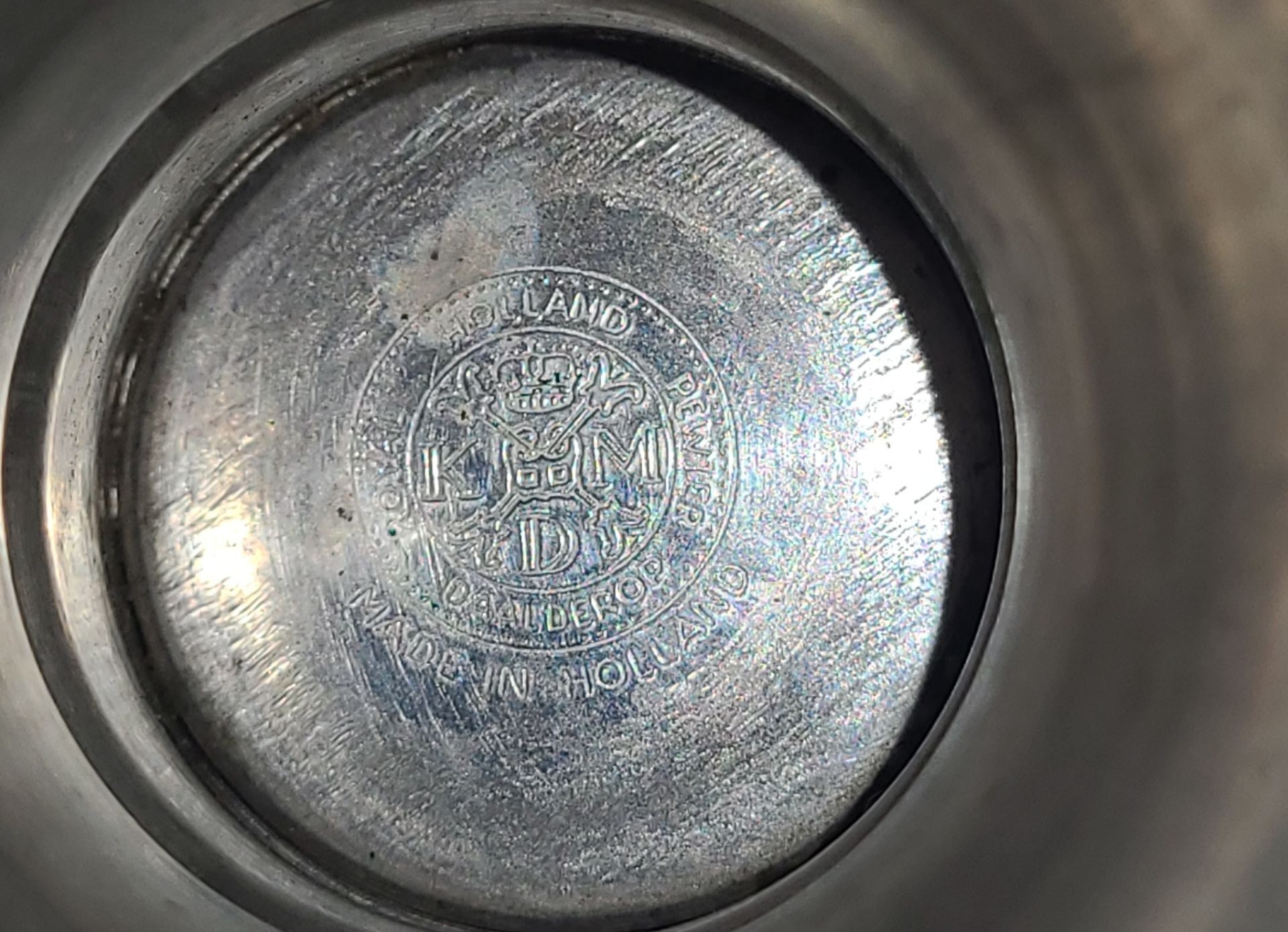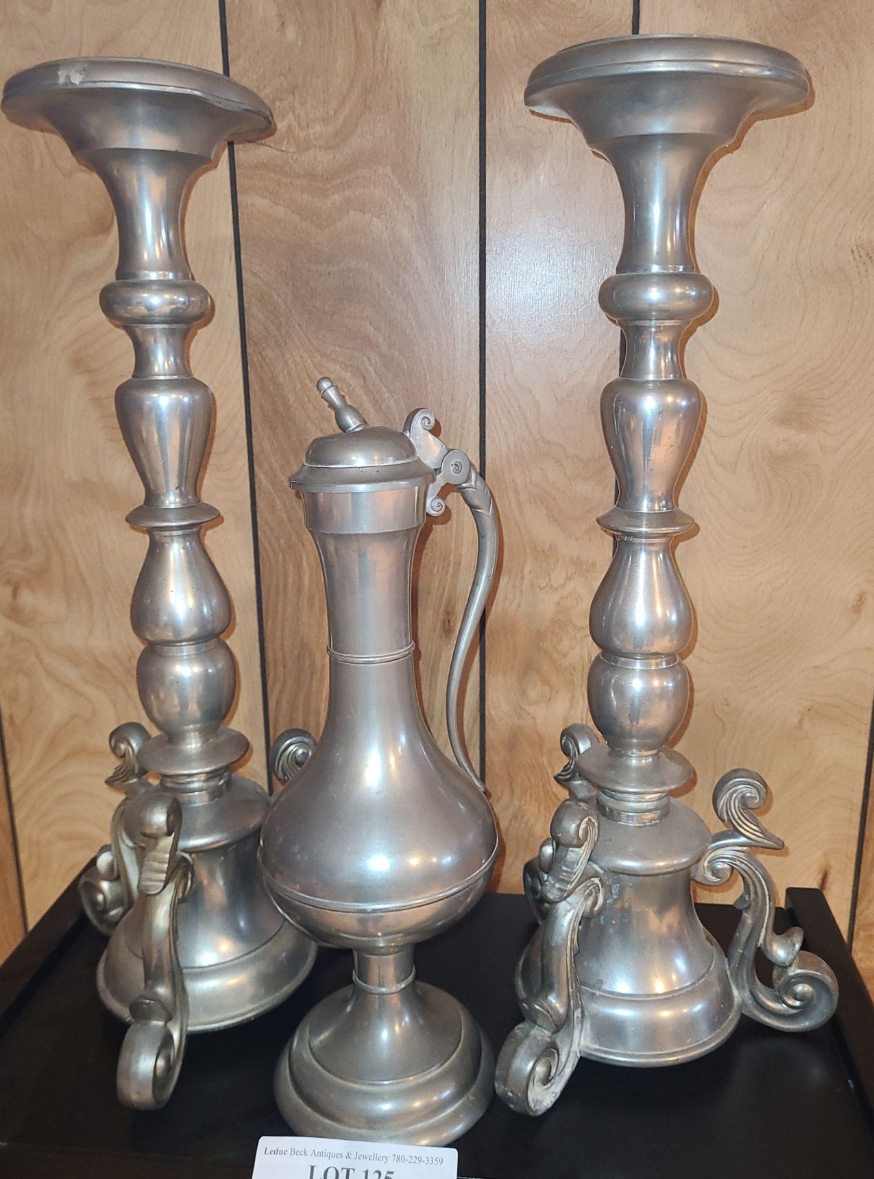Decanter has a bent finial and small dent on candle holders