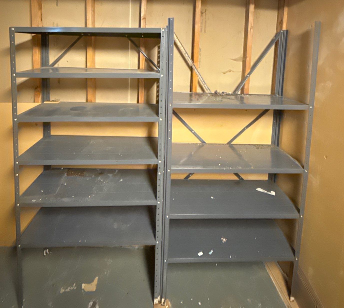 Pair of Metal (36W, 71T) Shelving Units w/ Wooden Shelf