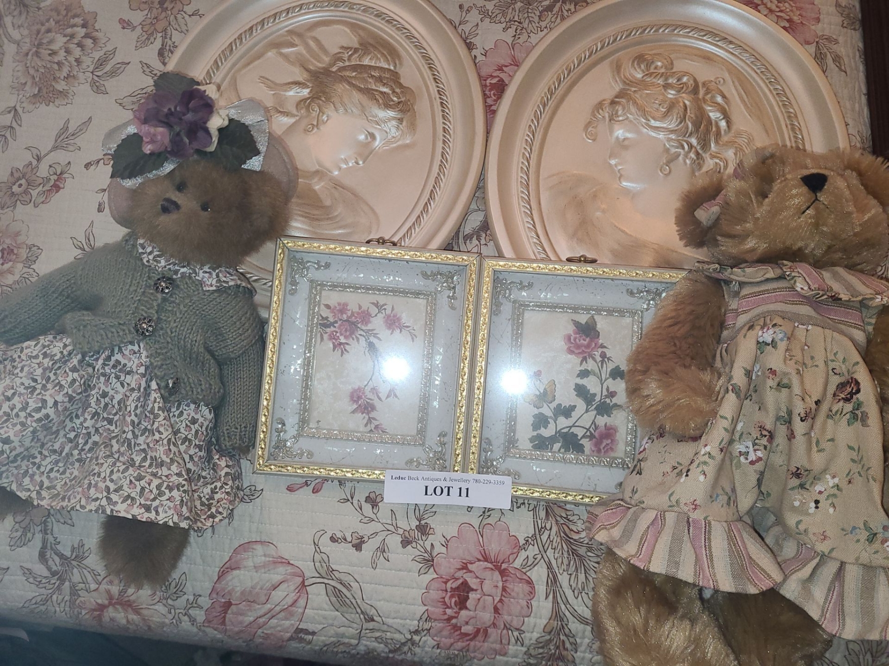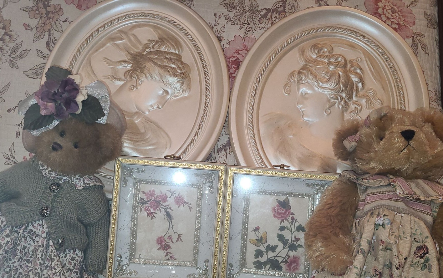 Pair of Oval Plaster Plaque 12 1/2 w 15 1/h, Teddy Bears & Small Floral Wall Decor 6 1/2 w 7 1/2 h