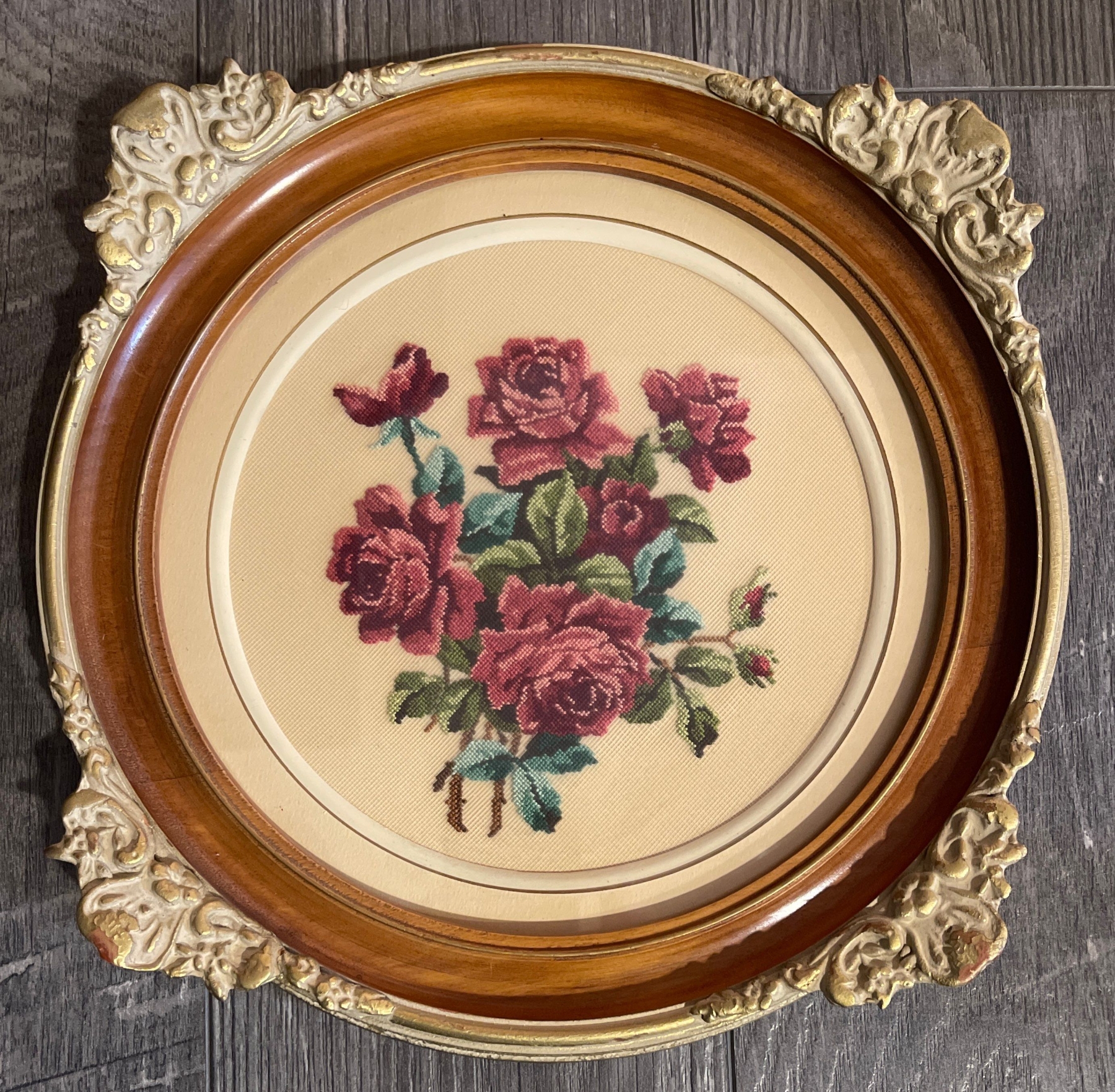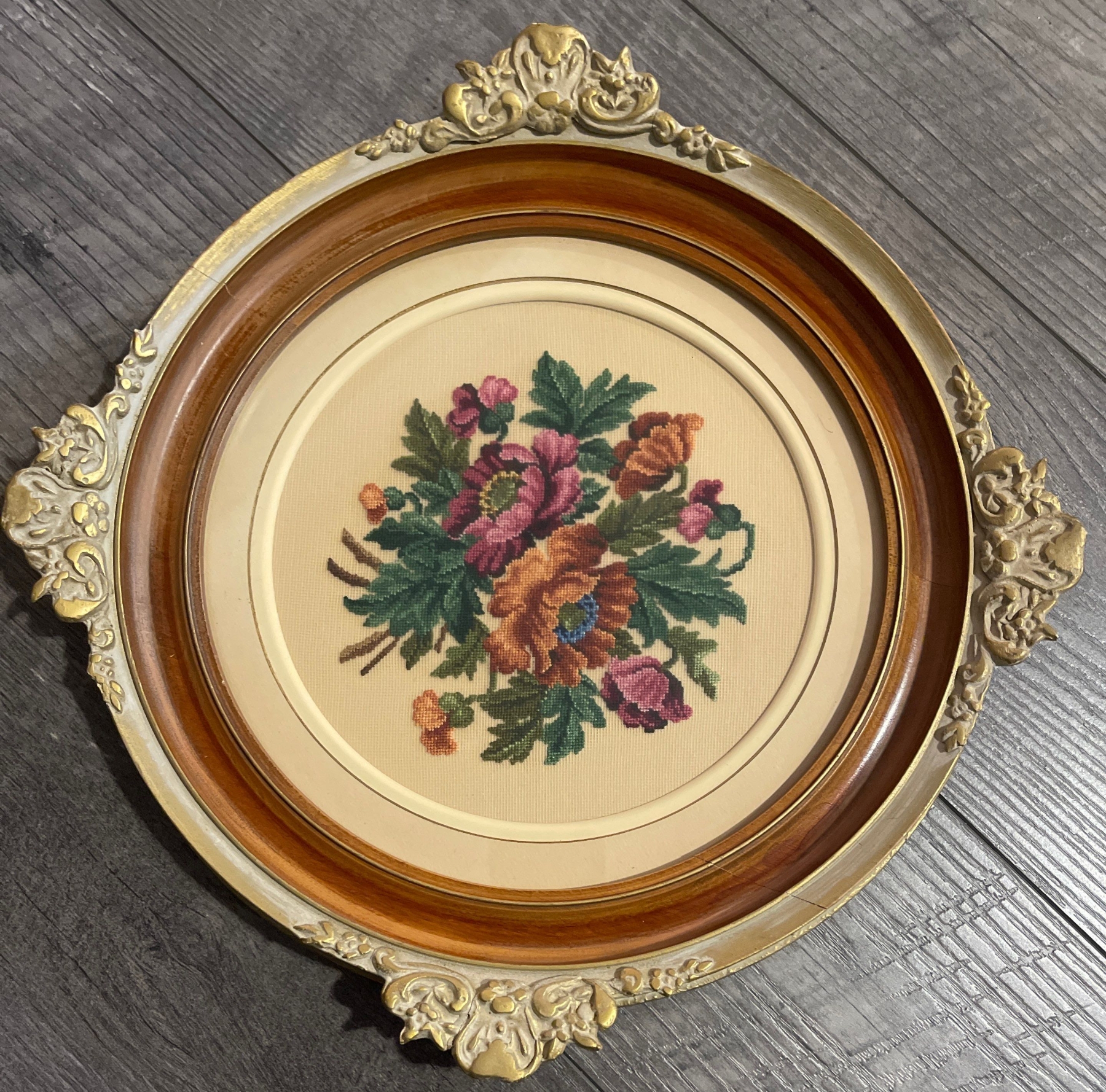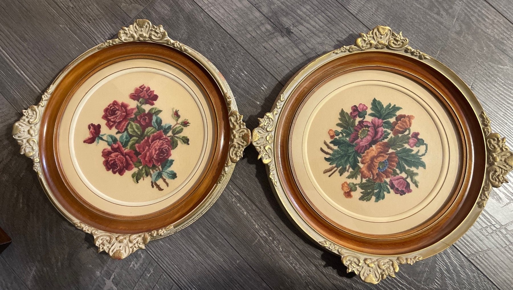 Pair of Petite Point Floral Embroideries in Ornate Round Frames 14T