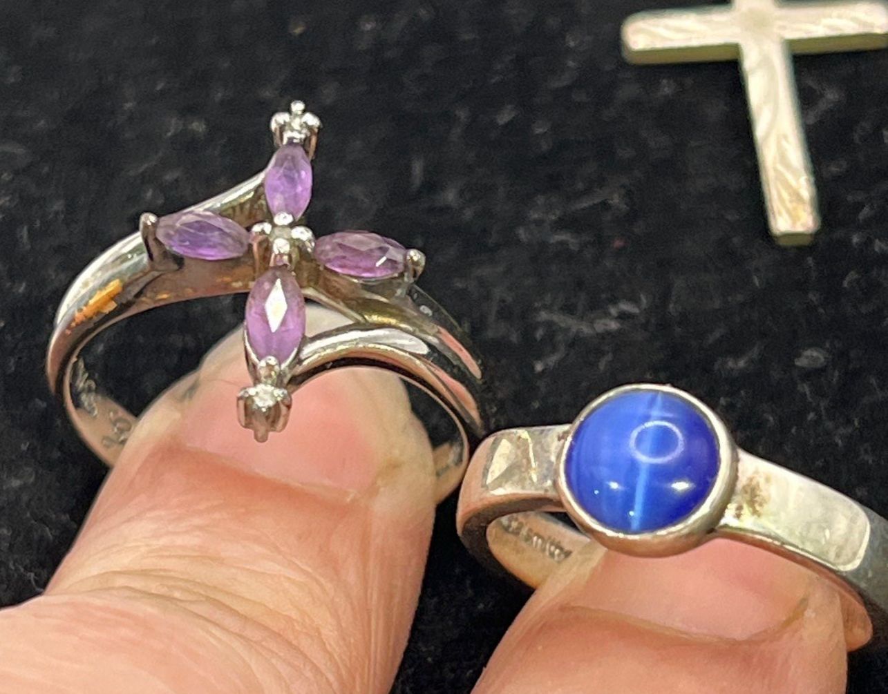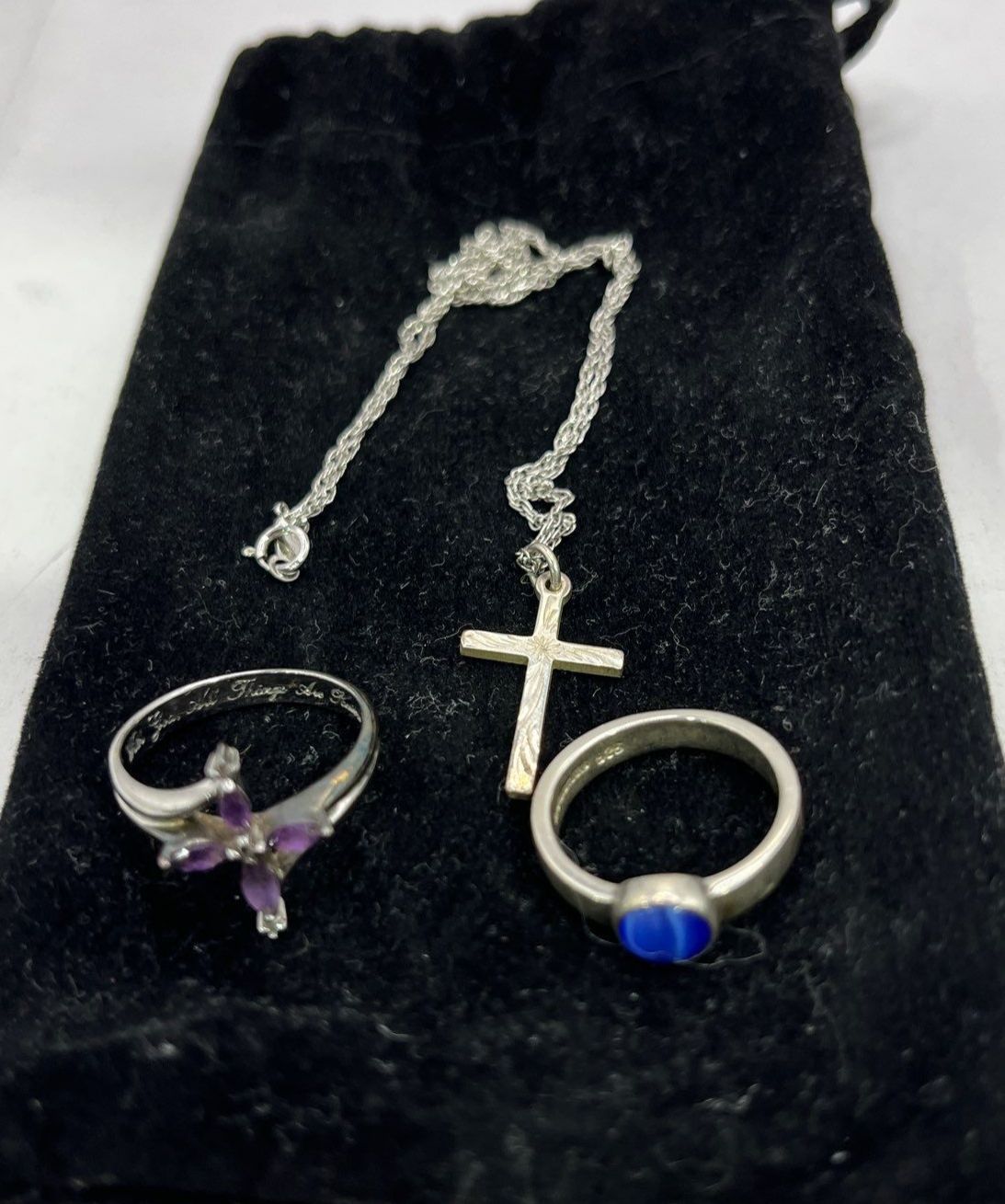 Pair of Sterling Silver Rings, and Cross Necklace (total weight 6.9g)
