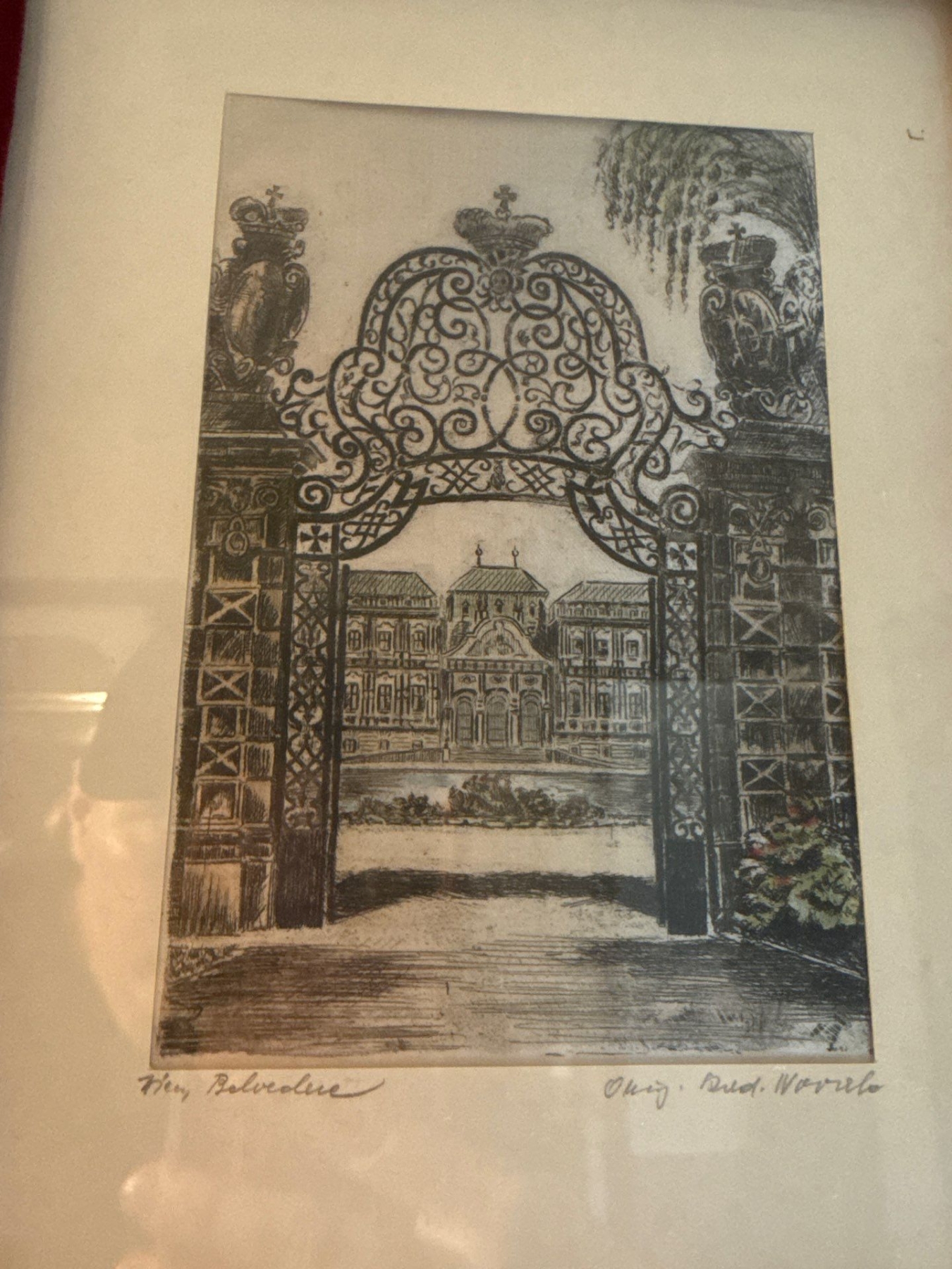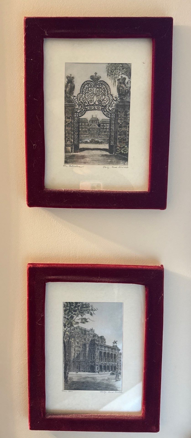 Pair of Velvet Trimmed Prints on Fabric, Signed - 10x12.5 Each