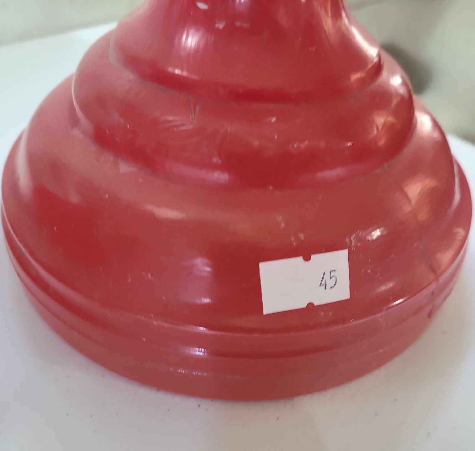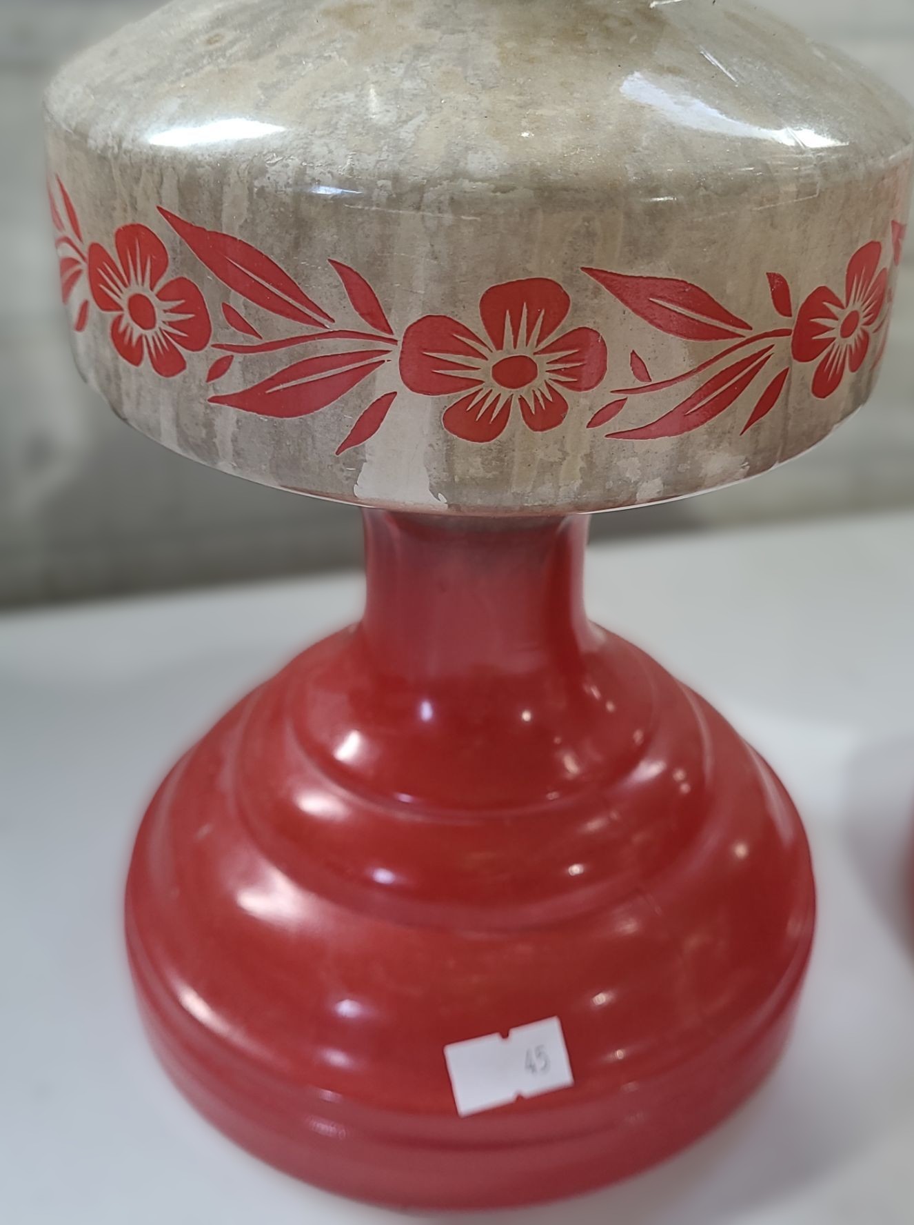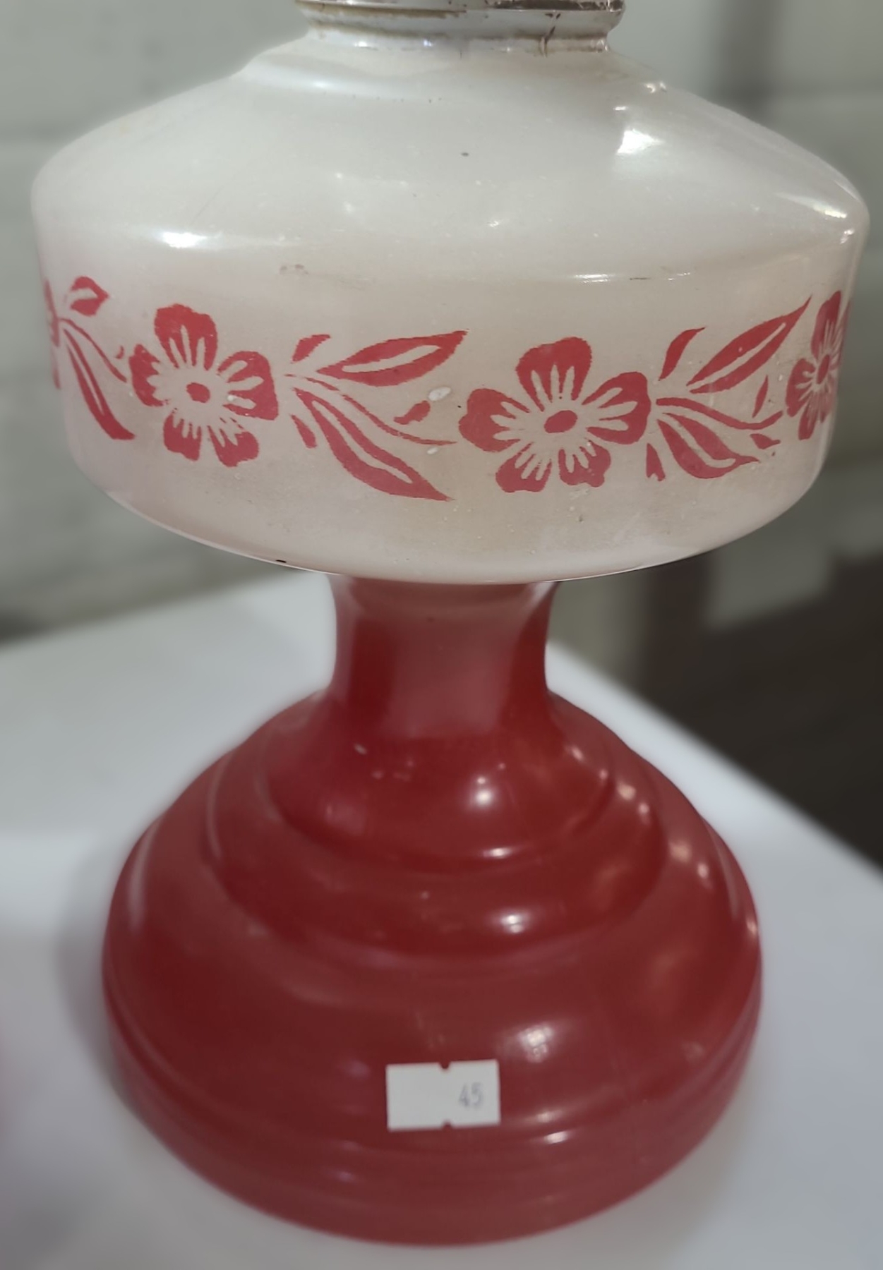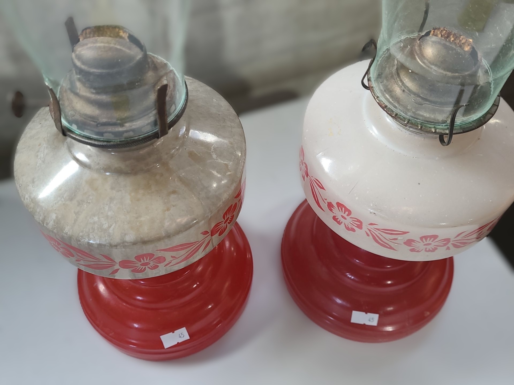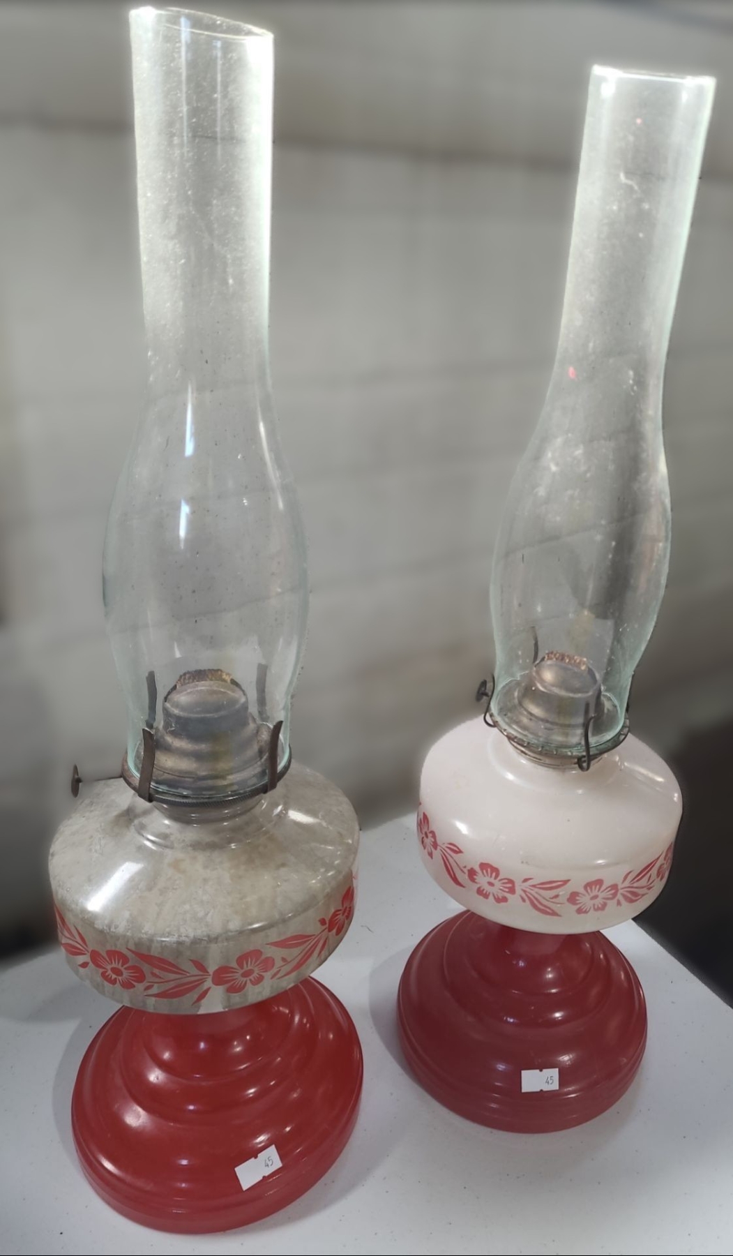 Pair of Vintage Glass Oil Lamps w/ Red Bases 6.5 W, 21 T