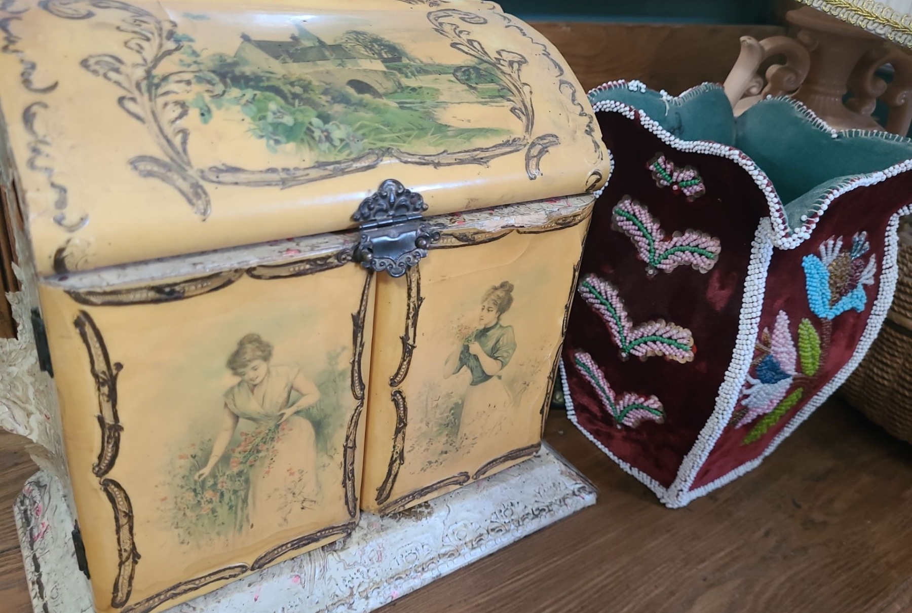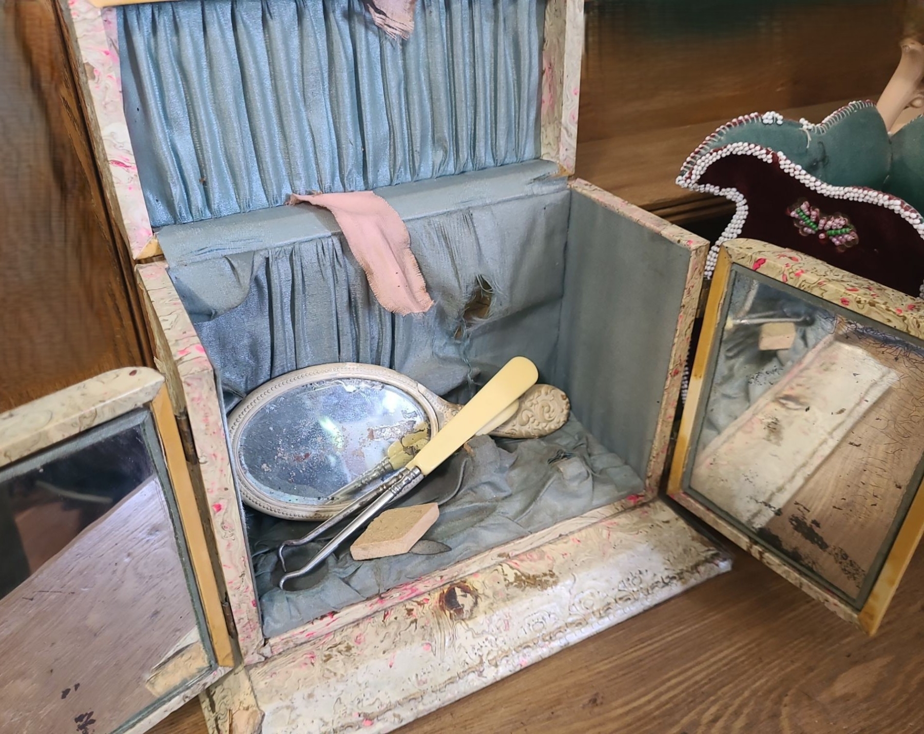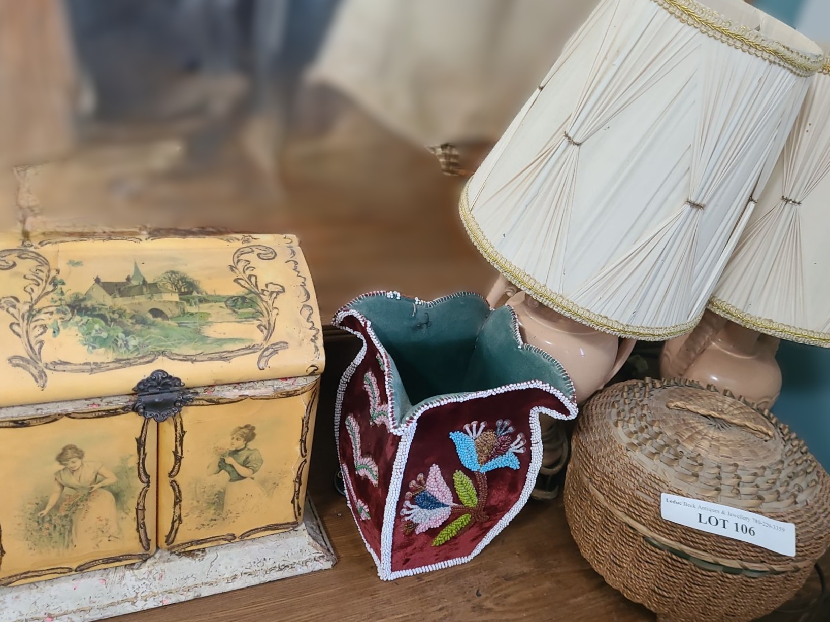 Incl Mirro & Lace Pulls. Beaded Vase missing beads. Broken metal on 1 peach vase. Laquer is peeling on Jewellery Box