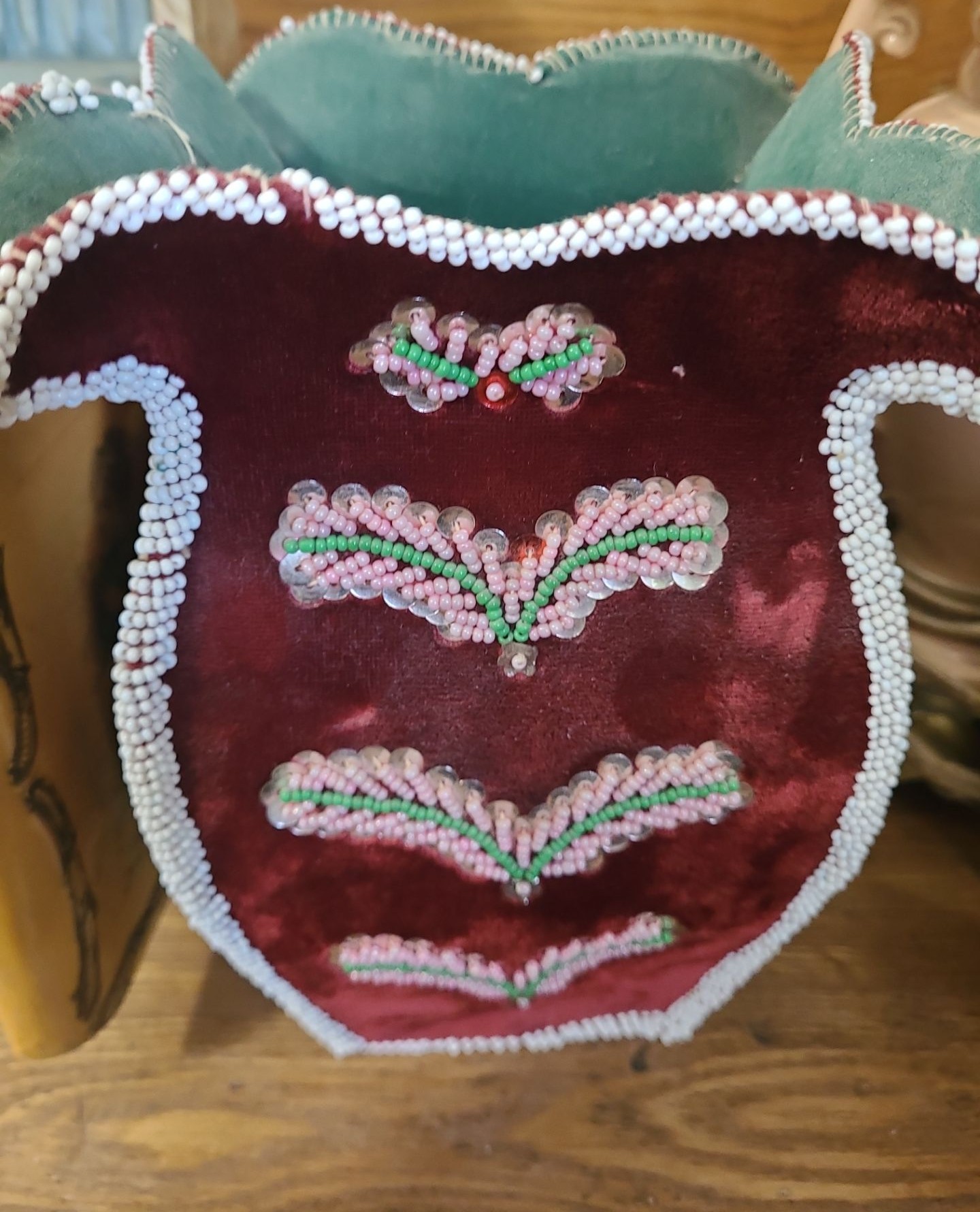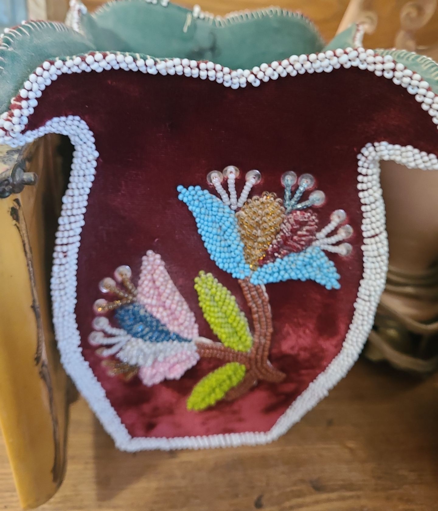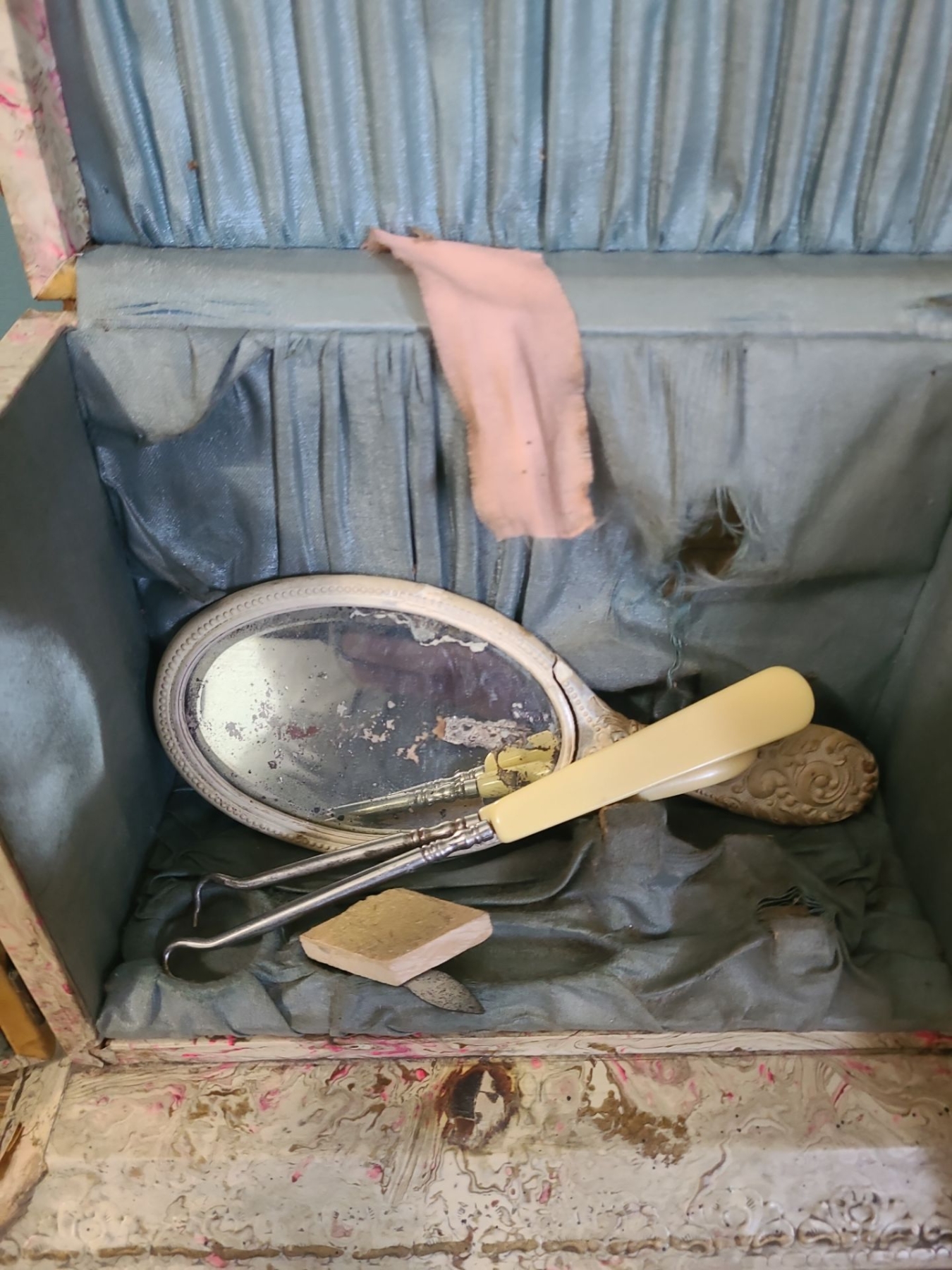 Incl Mirro & Lace Pulls. Beaded Vase missing beads. Broken metal on 1 peach vase. Laquer is peeling on Jewellery Box