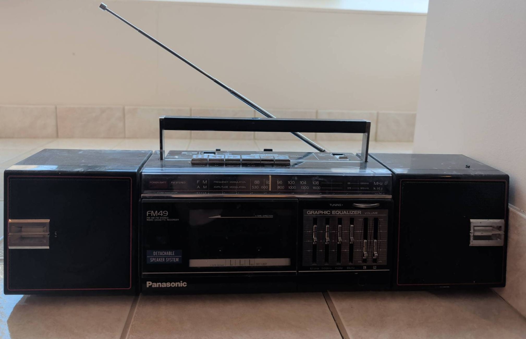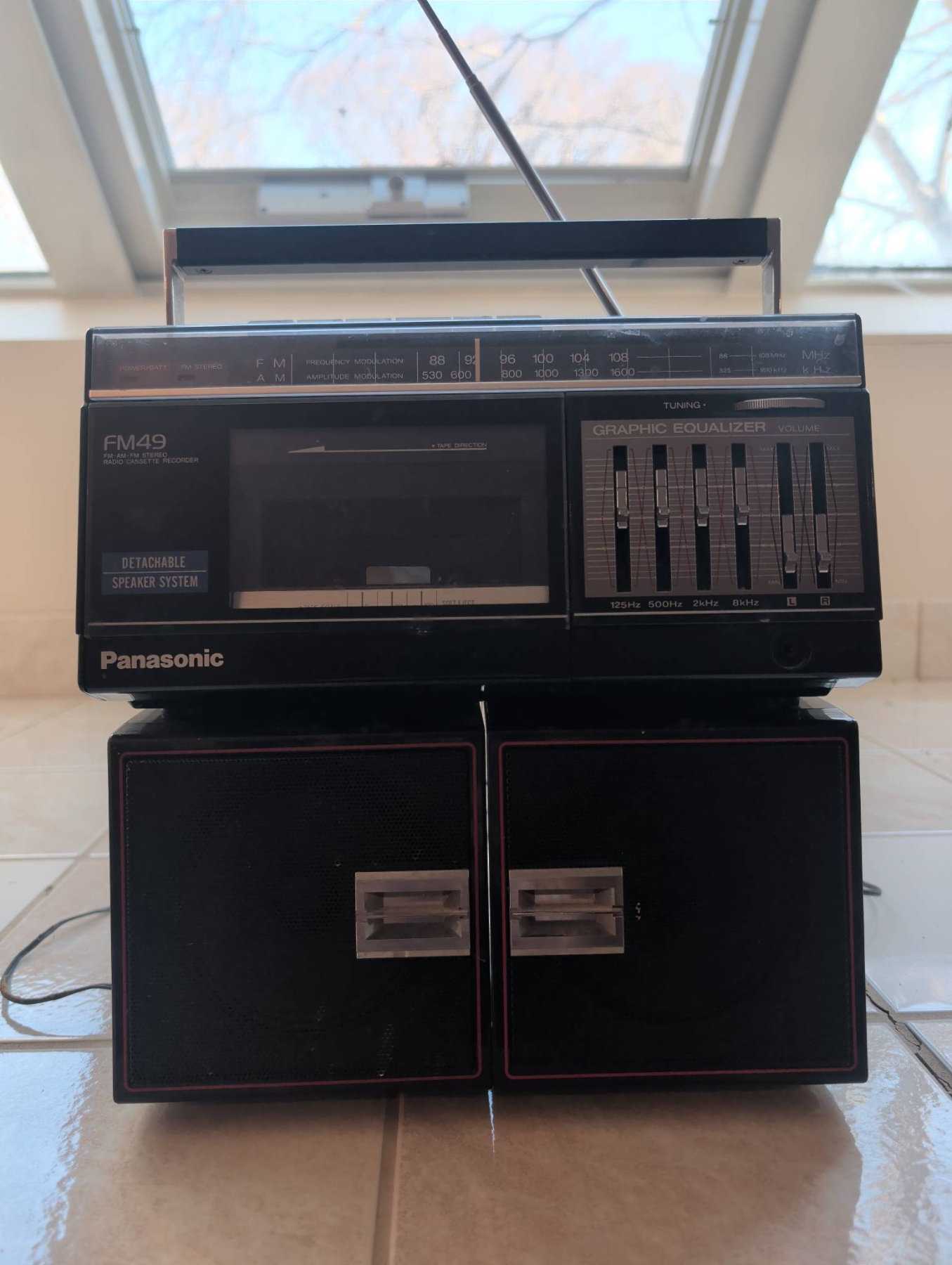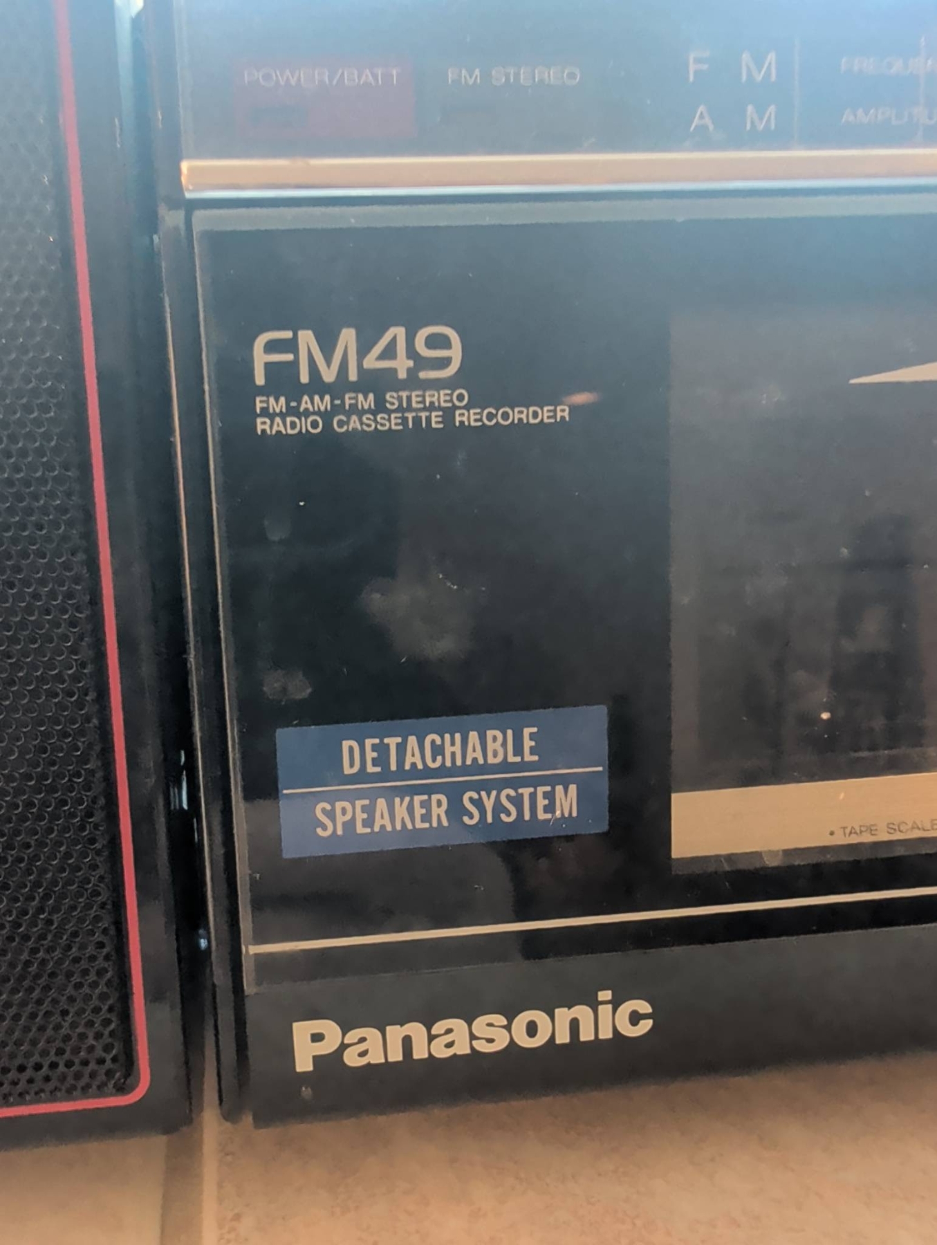 Panasonic FM49 FM-AM-FM stereo radio cassette recorder featuring a detachable speaker system. Includes graphic equalizer controls for customizable sound settings and a compact design with a built-in handle for portability. The unit has an AC/Battery power option for flexible use. The detachable speakers and sturdy construction make it a versatile audio device.