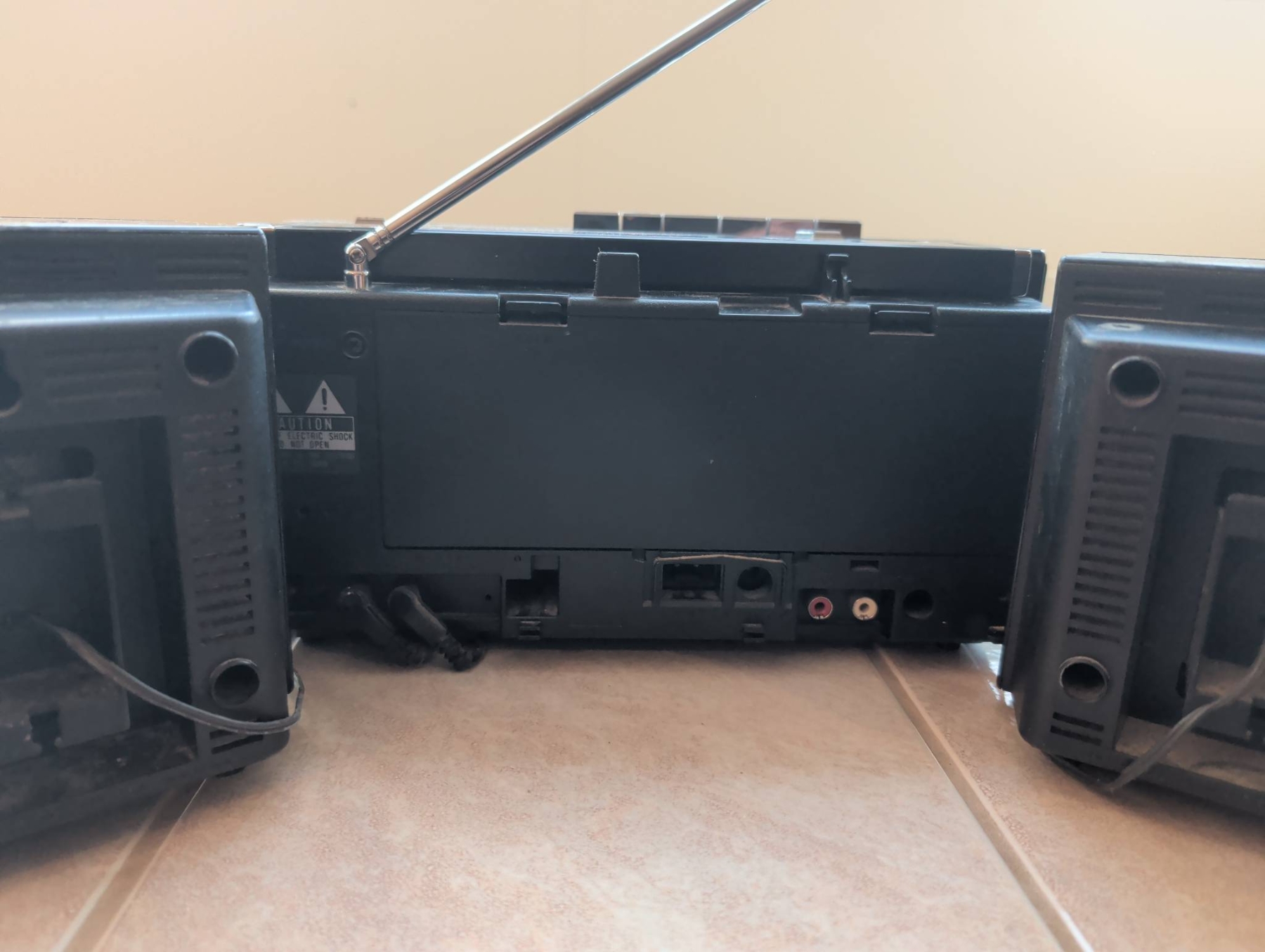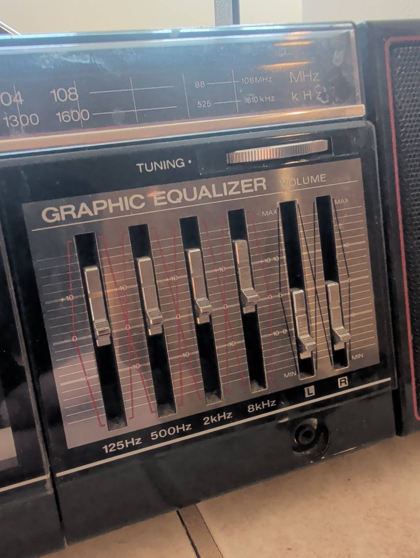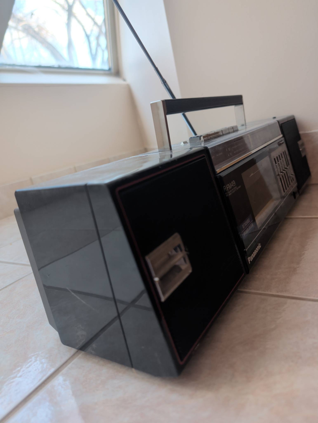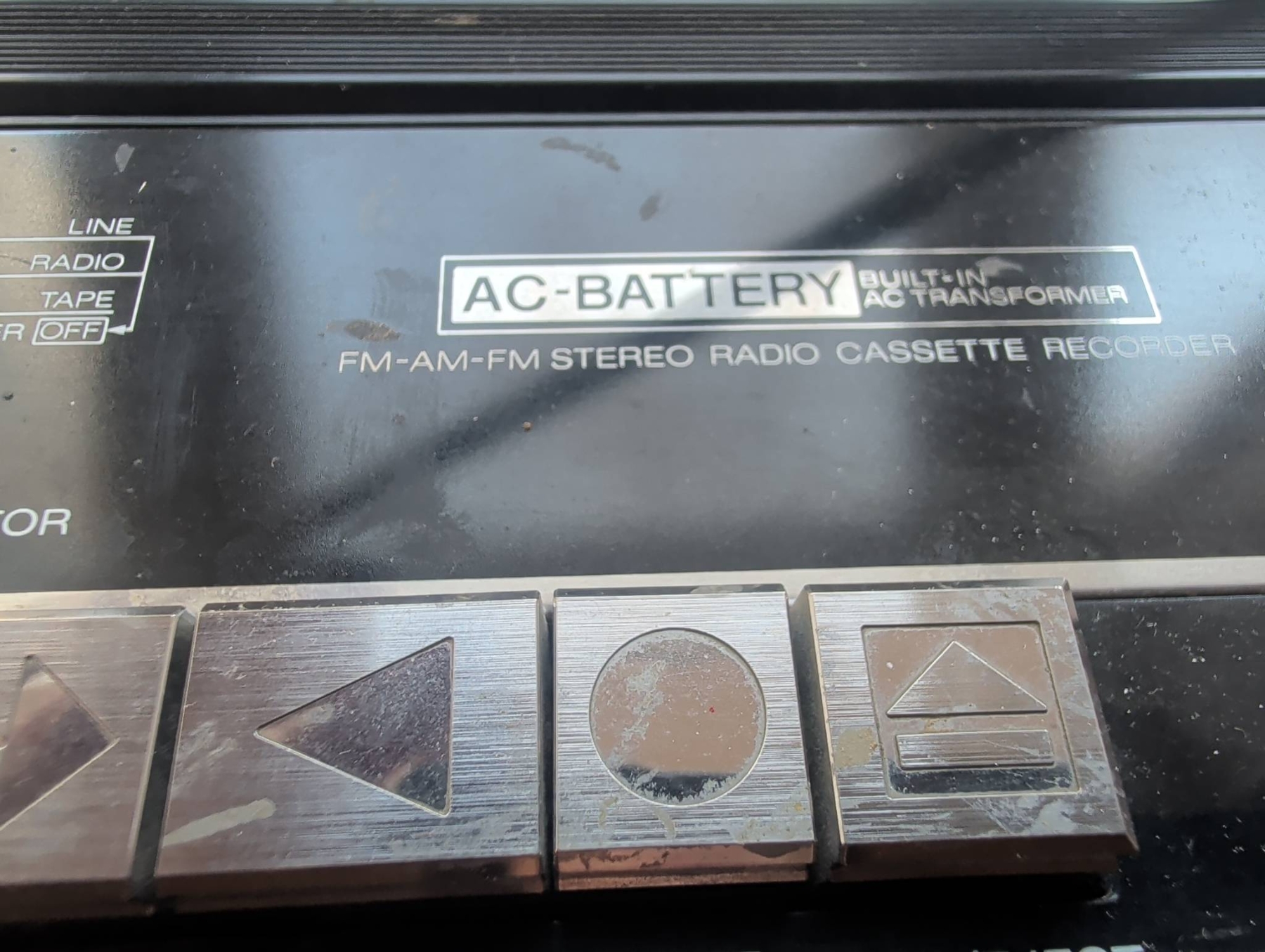 Panasonic FM49 FM-AM-FM stereo radio cassette recorder featuring a detachable speaker system. Includes graphic equalizer controls for customizable sound settings and a compact design with a built-in handle for portability. The unit has an AC/Battery power option for flexible use. The detachable speakers and sturdy construction make it a versatile audio device.