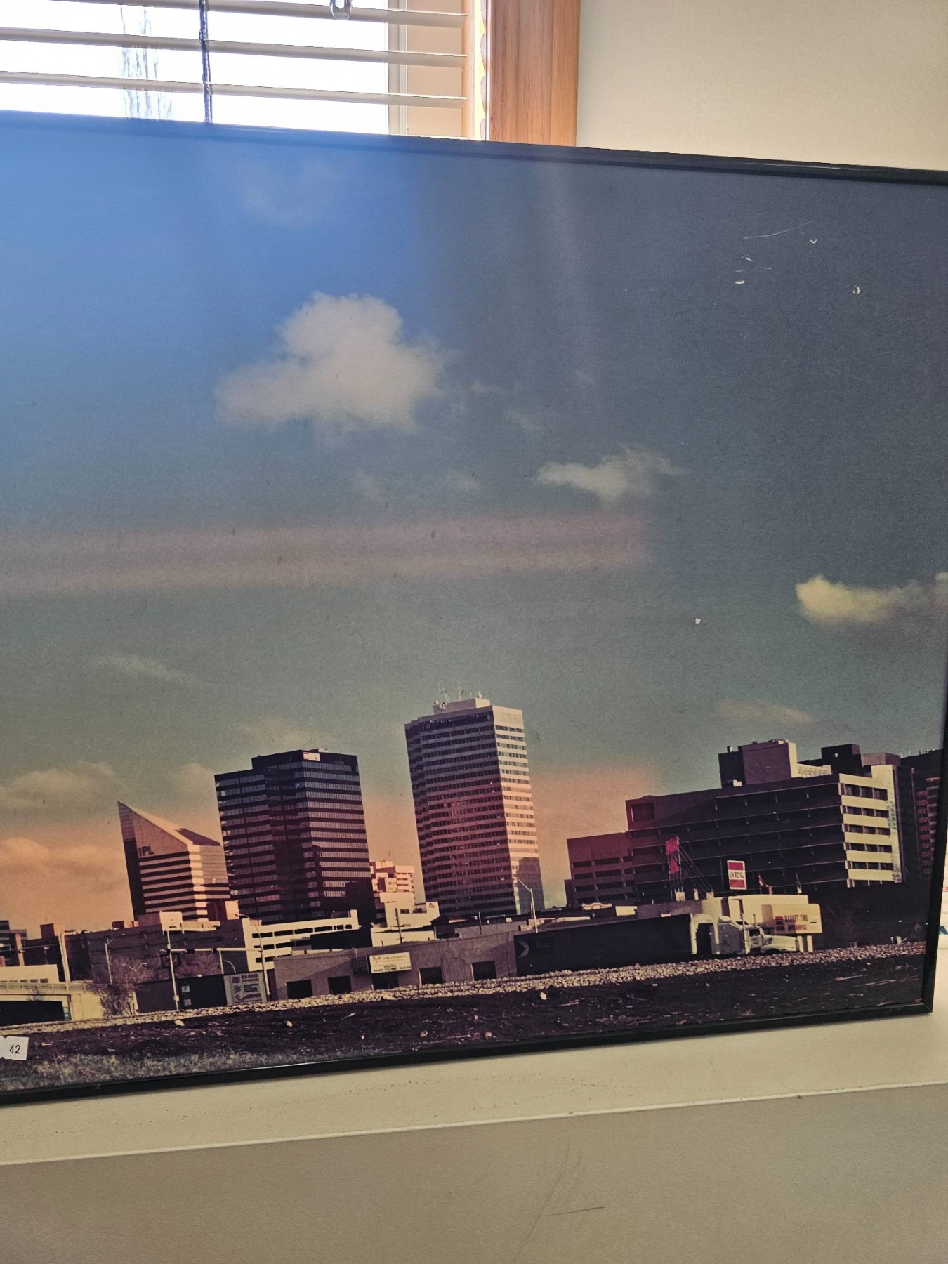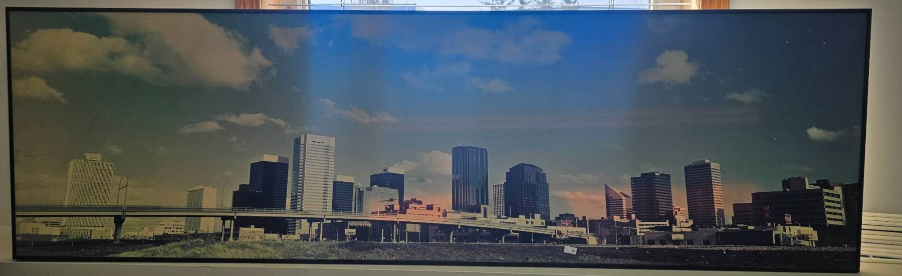 Panoramic cityscape art print featuring modern high-rise buildings under a partly cloudy sky. Dimensions are 60x18 inches, suitable for large wall spaces. Framed with a black edge and ready for display. Potentially lightweight construction, suitable for indoor decoration.