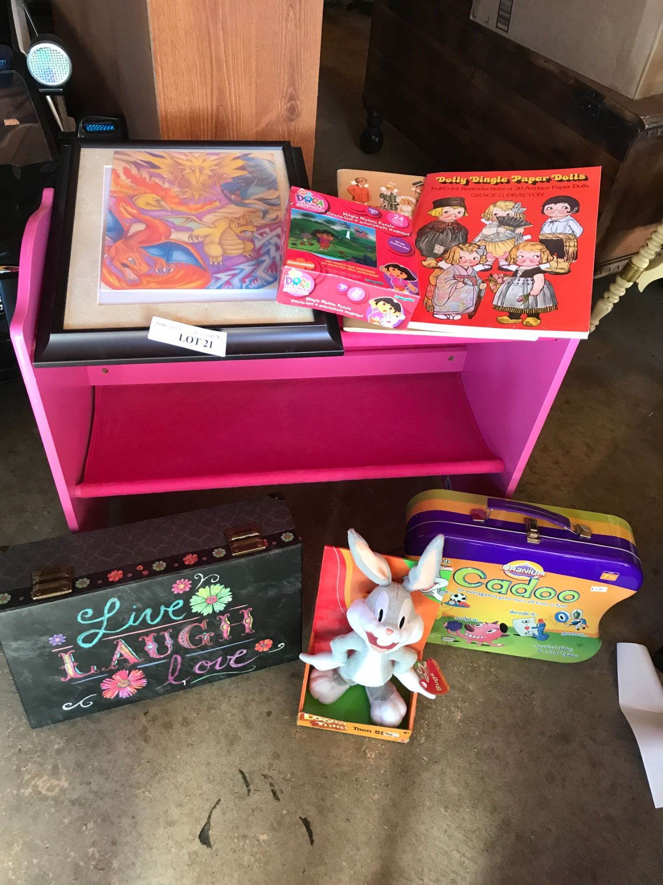 Paper dolls, Dora shoe rack, Bugs Bunny toy, dragon picture, Asst games