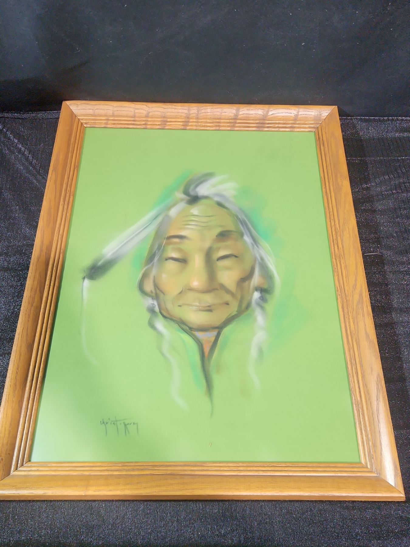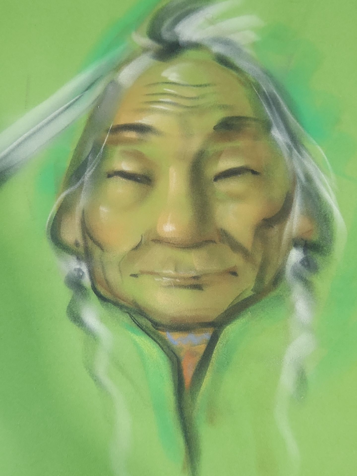 Picture of elderly Indigenous woman by Danish-born Canadian artist, Gerda Christoffersen. This medium seems to be pastel