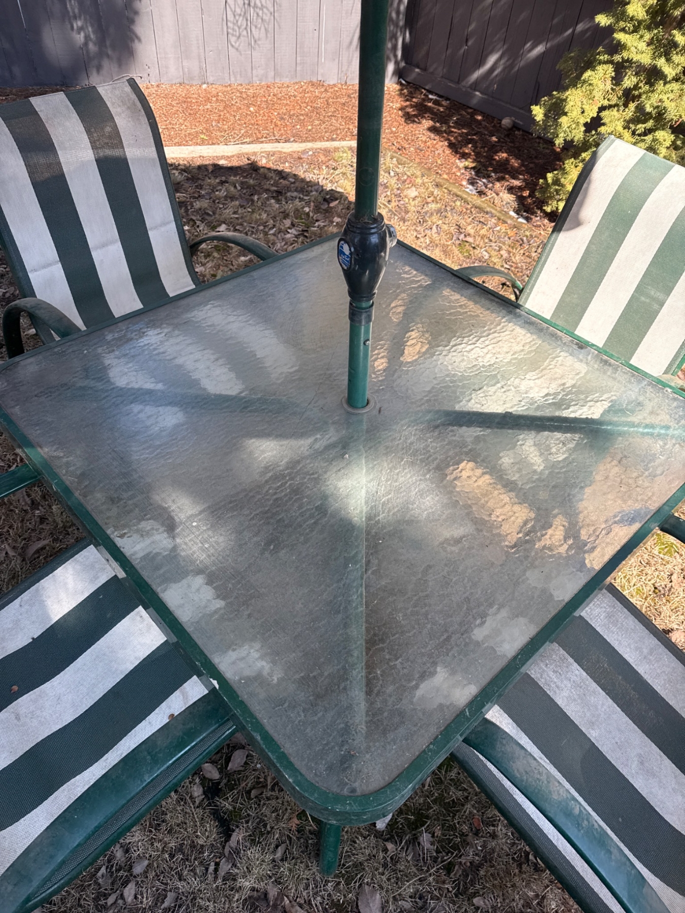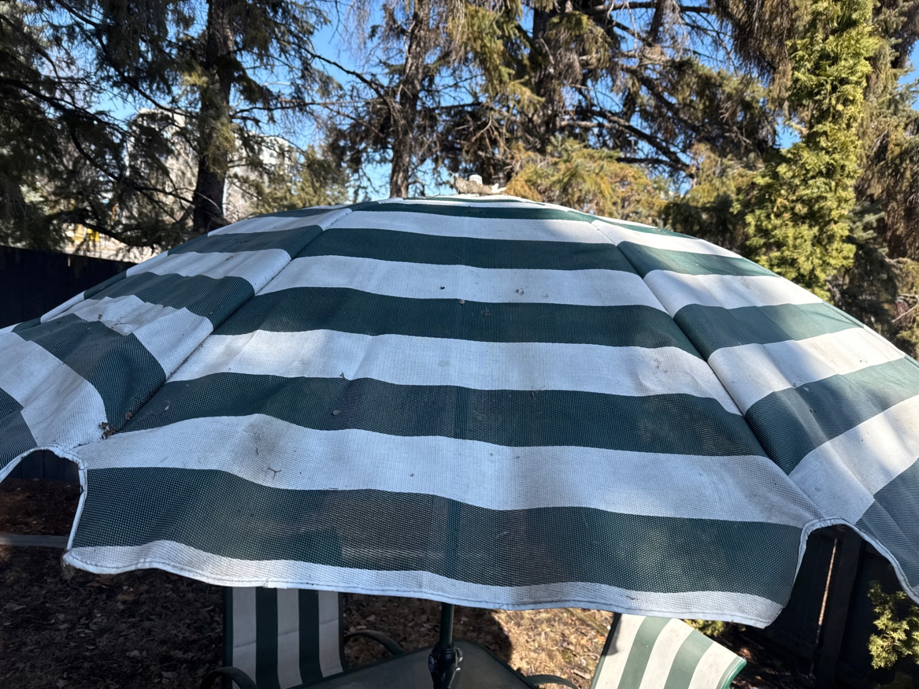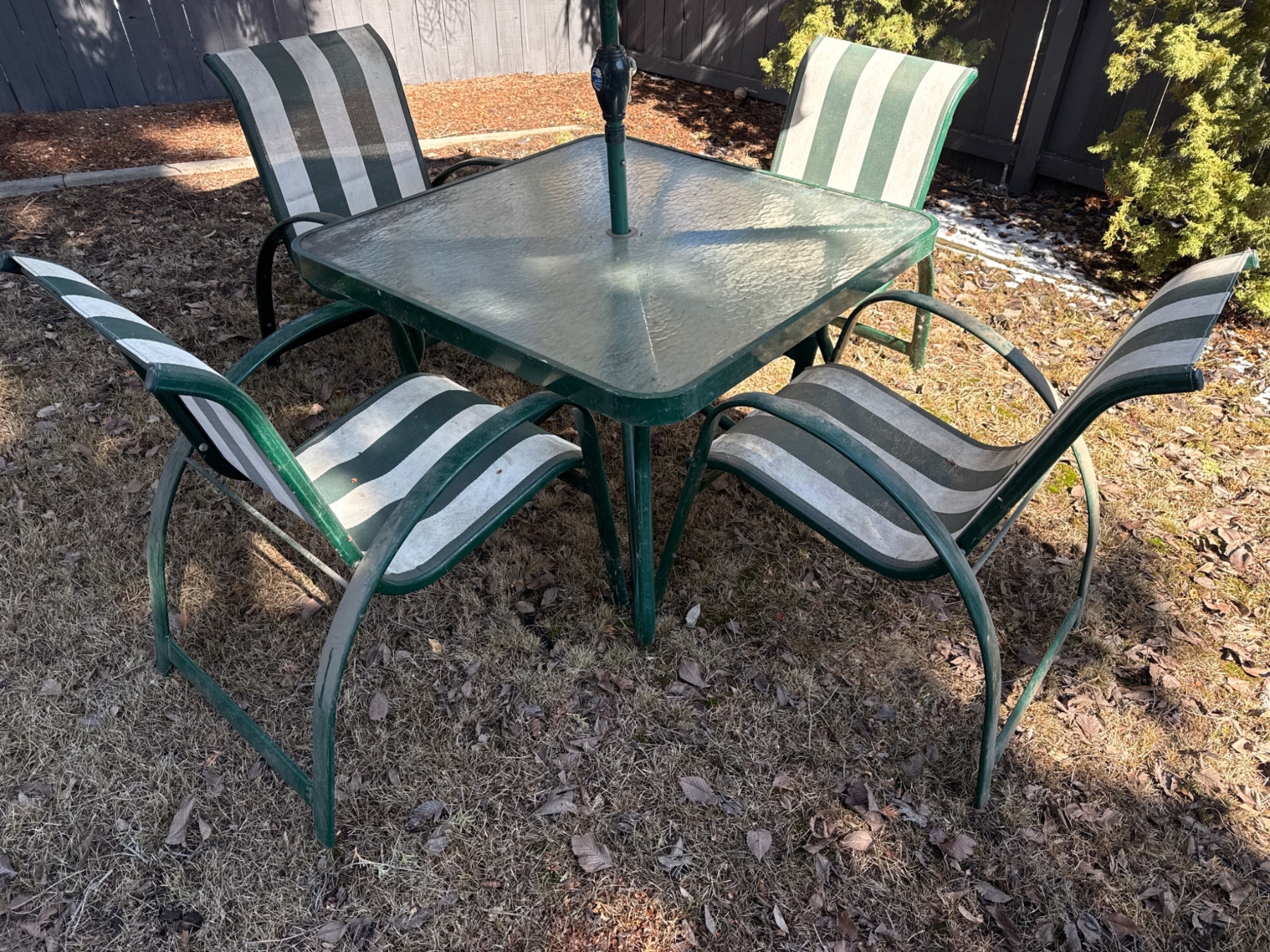 Outdoor patio dining set featuring a green and white striped design. Includes a square glass-top table with dimensions approximately 38in x 38in and four matching chairs with durable metal frames and breathable mesh seats. The set comes with a coordinating umbrella with a crank mechanism for shade. Shows signs of use and weathering but remains functional, ideal for garden or backyard lounging.