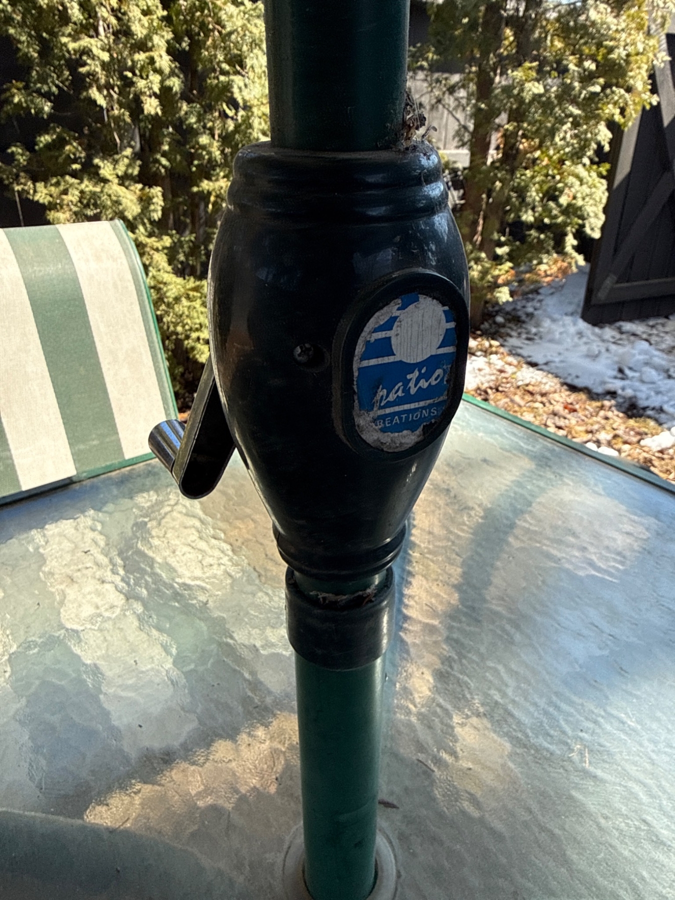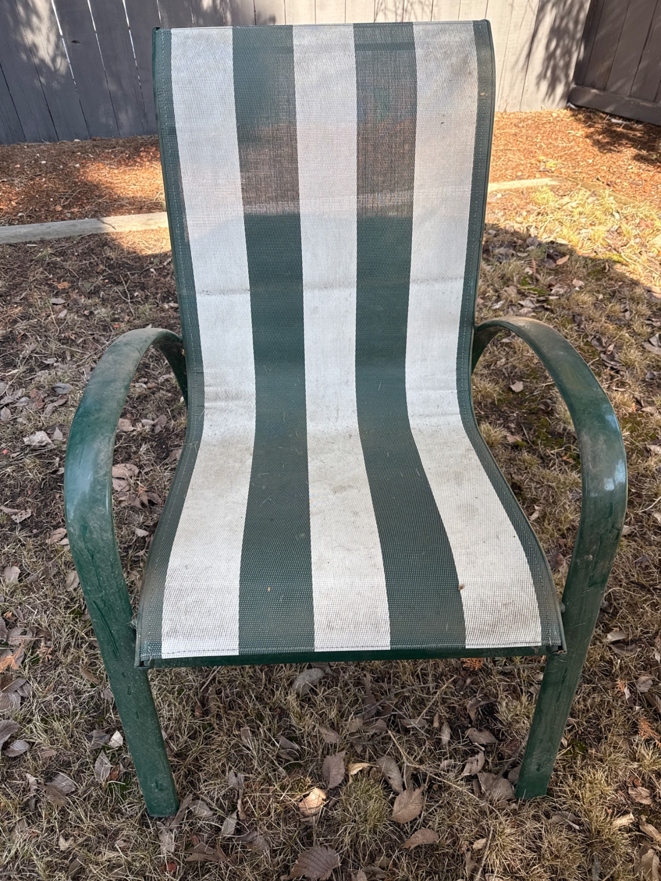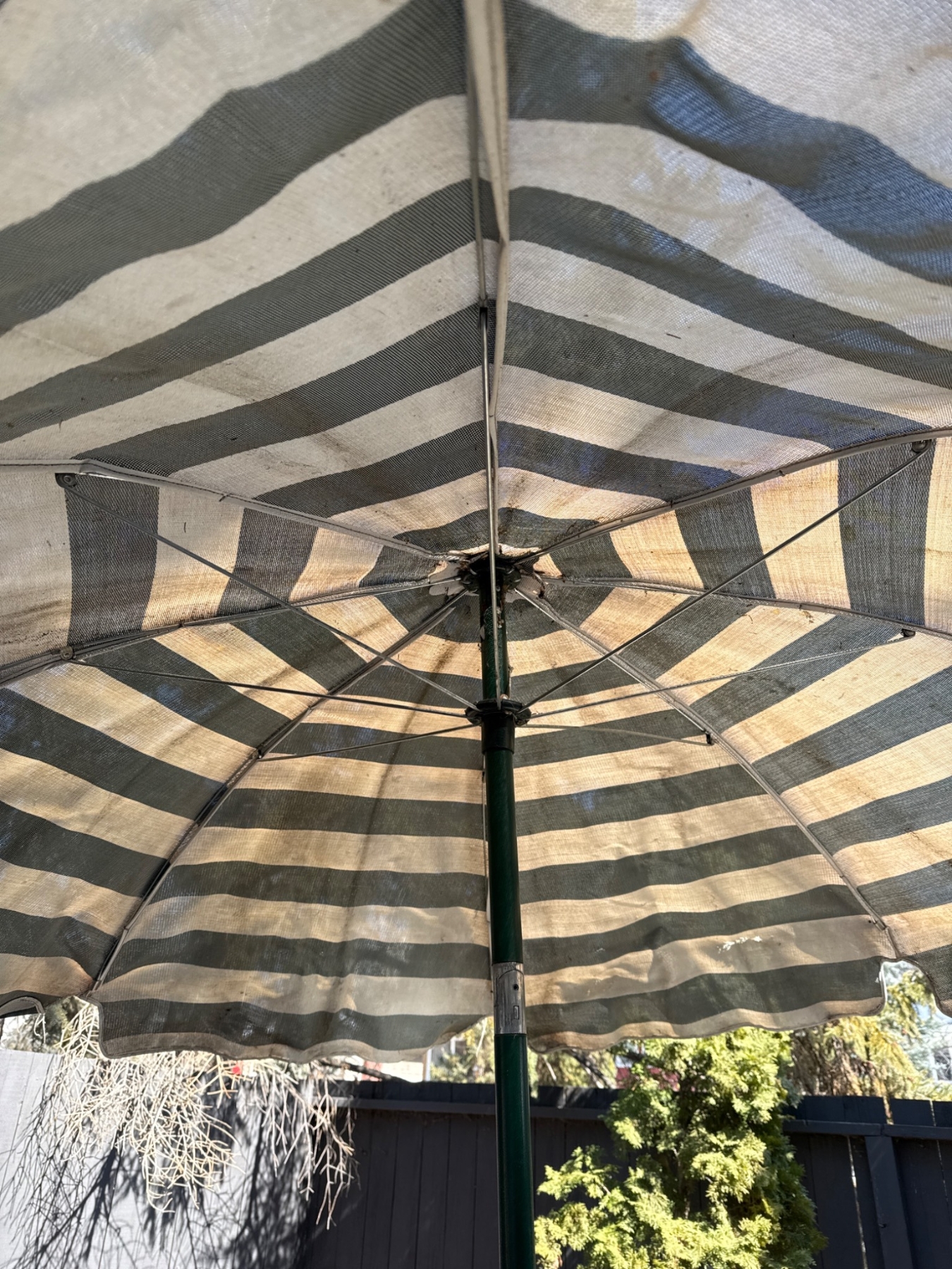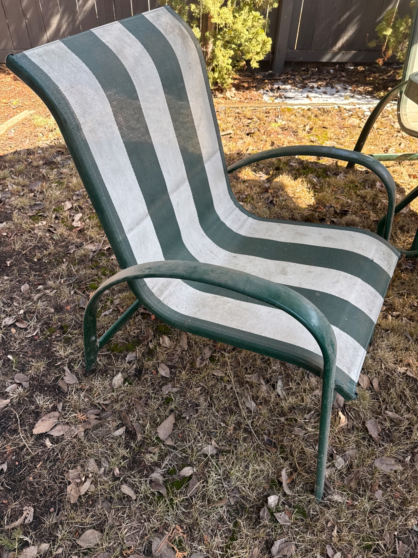 Outdoor patio dining set featuring a green and white striped design. Includes a square glass-top table with dimensions approximately 38in x 38in and four matching chairs with durable metal frames and breathable mesh seats. The set comes with a coordinating umbrella with a crank mechanism for shade. Shows signs of use and weathering but remains functional, ideal for garden or backyard lounging.