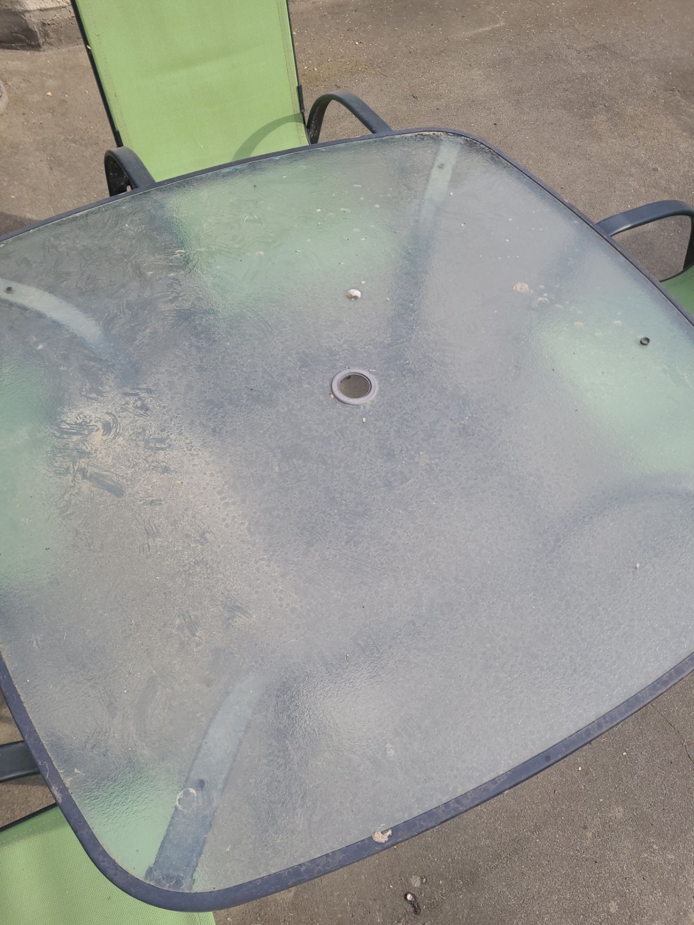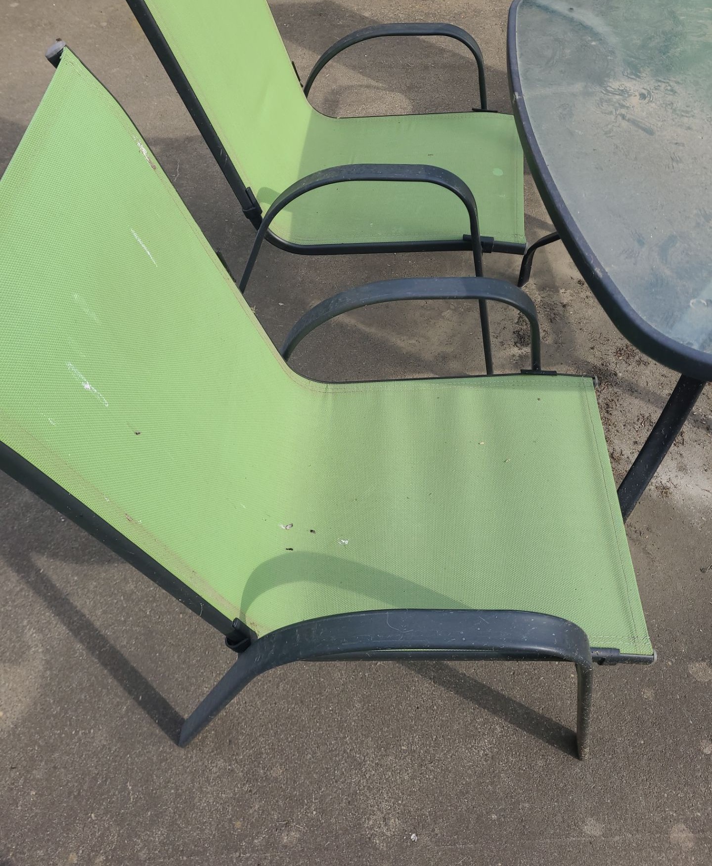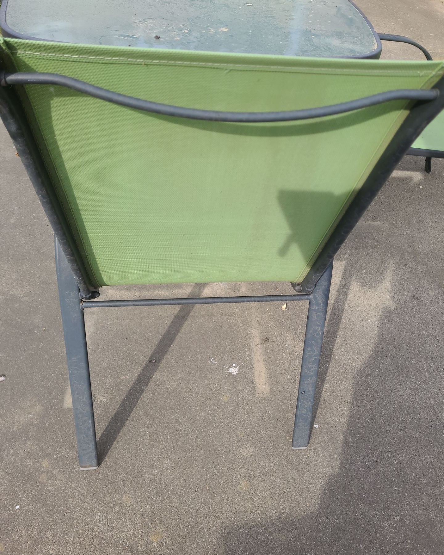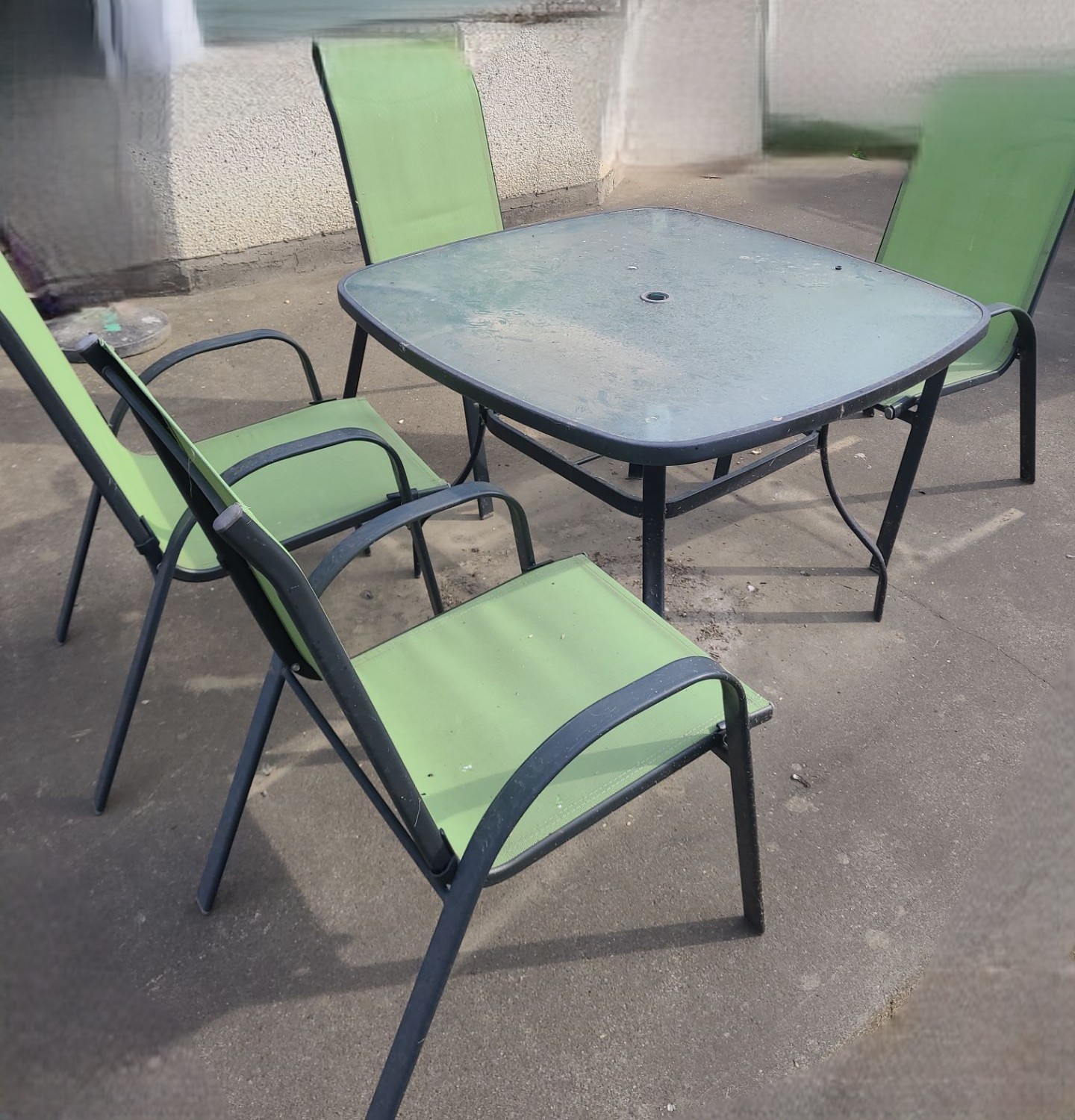 Patio Table 41 W, 41 D, 28.5 T and Four Chairs 22 W, 26 D, 37.5 T