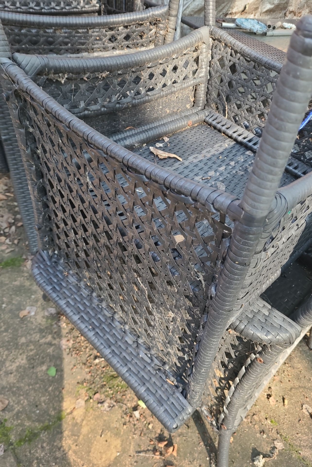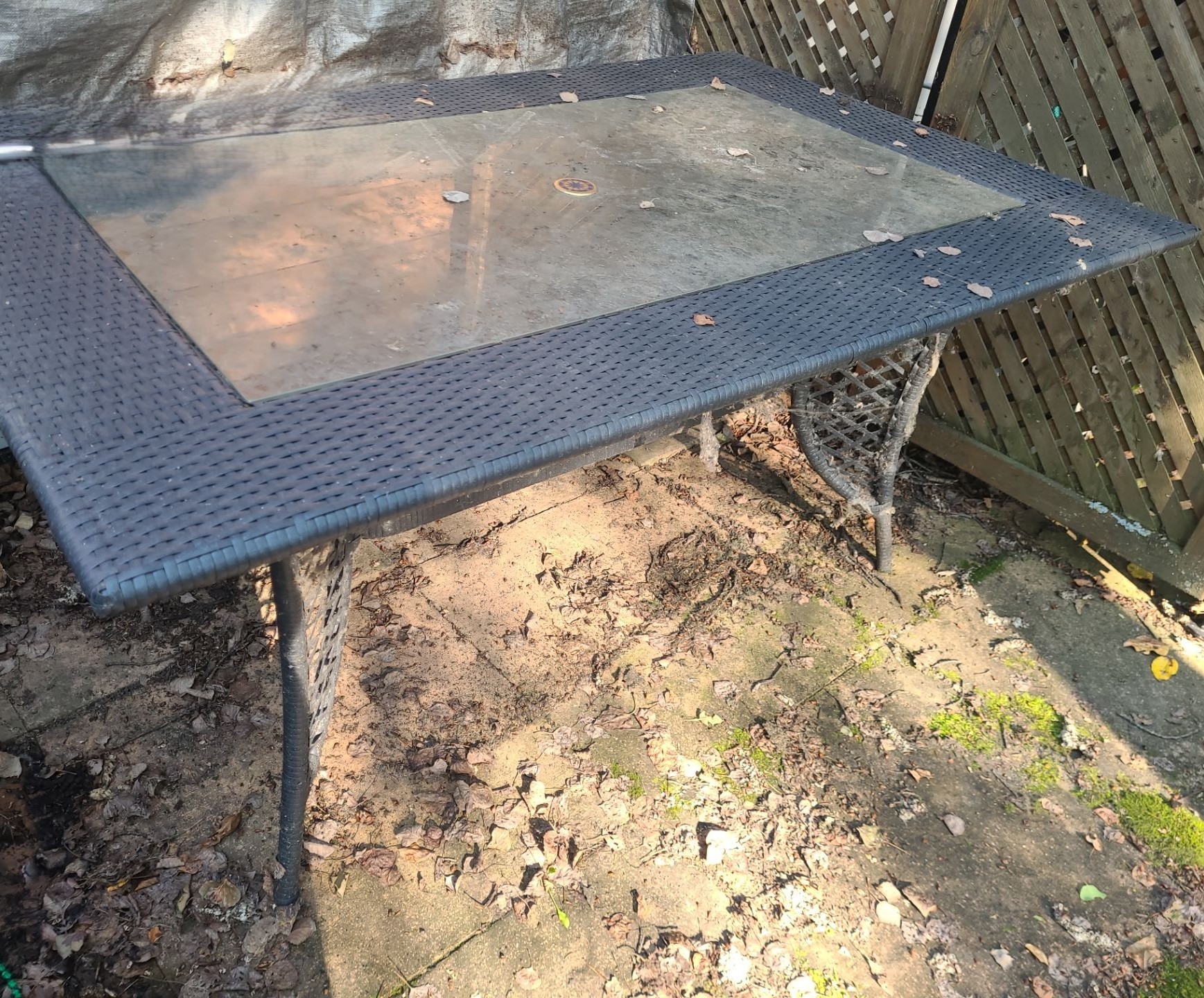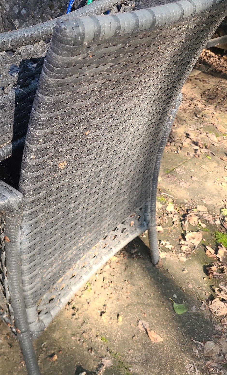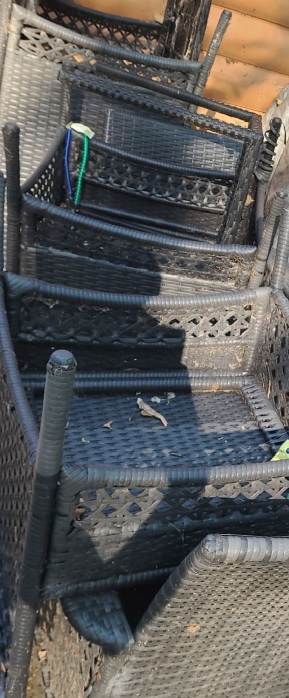 Patio Table 60 W, 38 D, 28 T, Six Chairs 26 W, 20 D, 35 T, and Two Side Tables 16 W, 16 D, 17 T