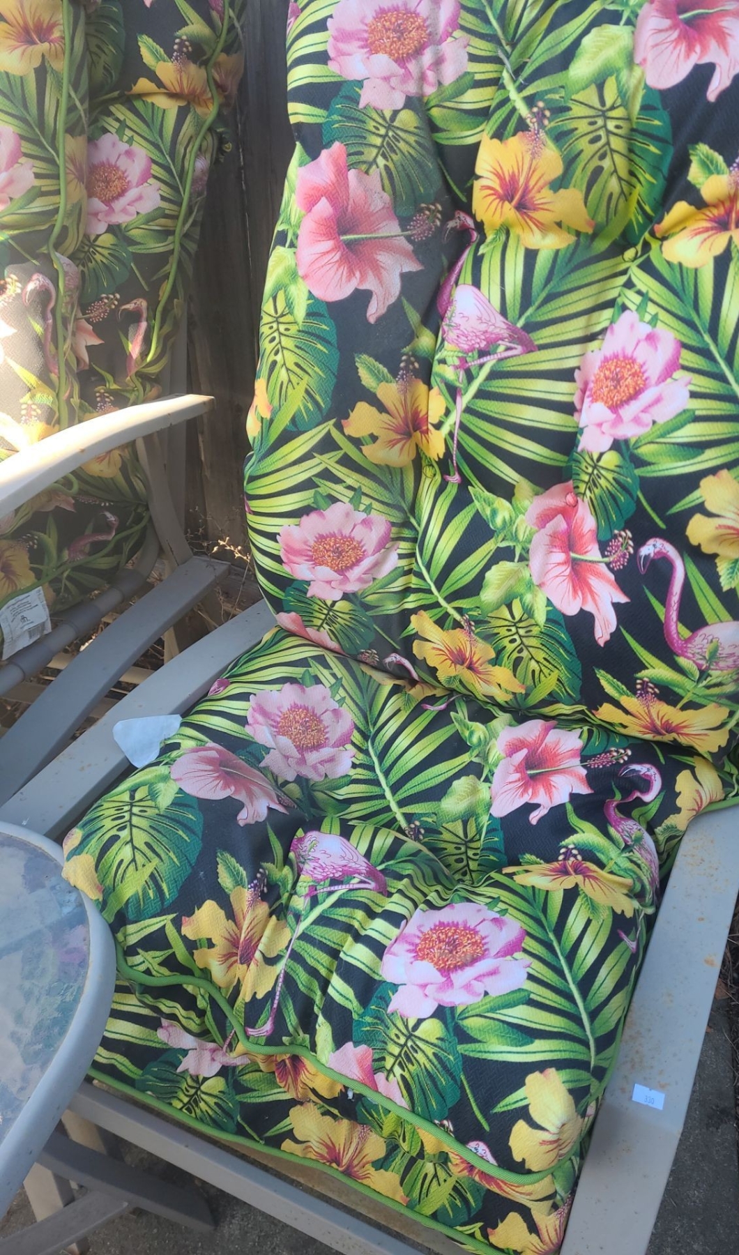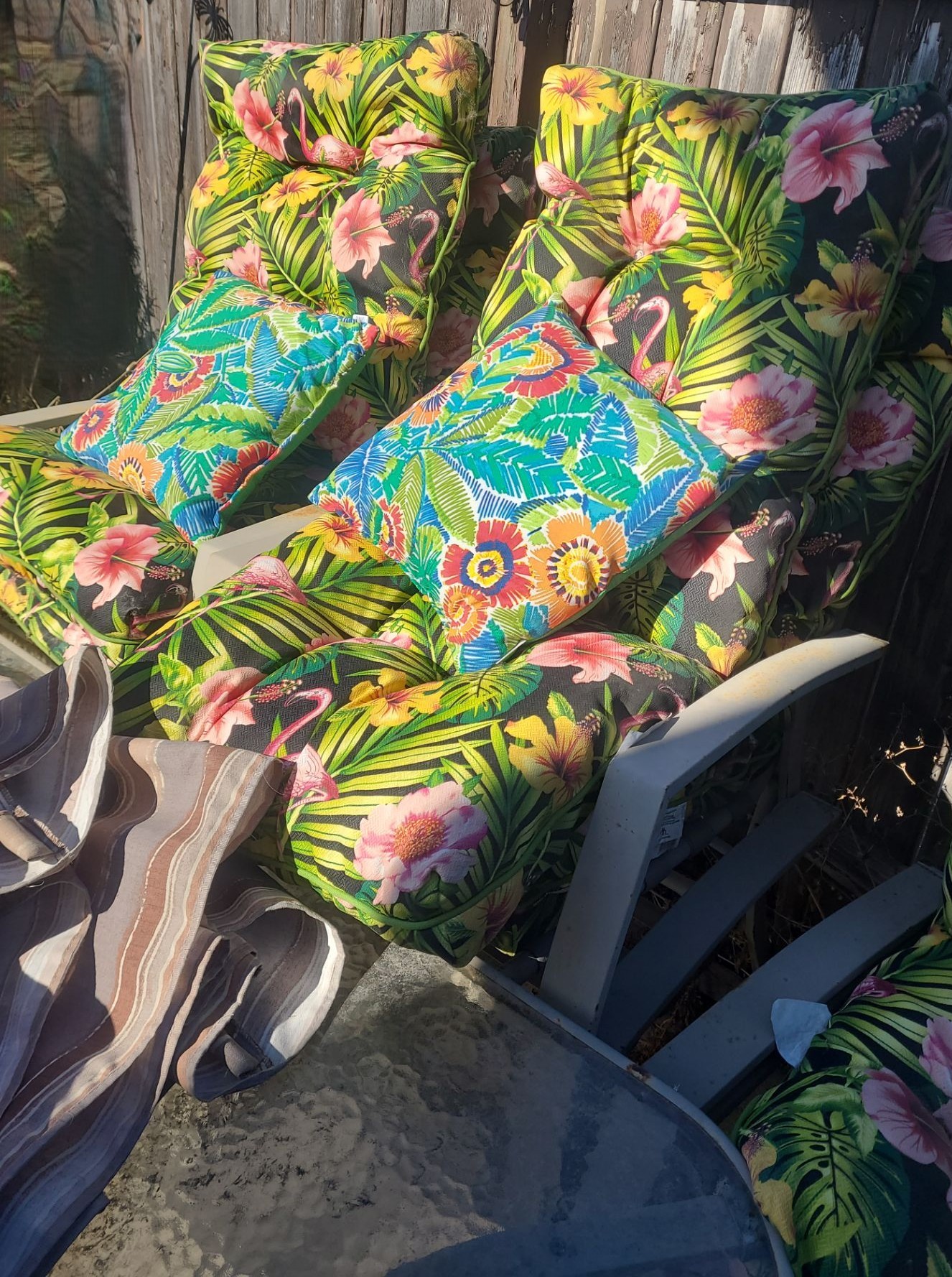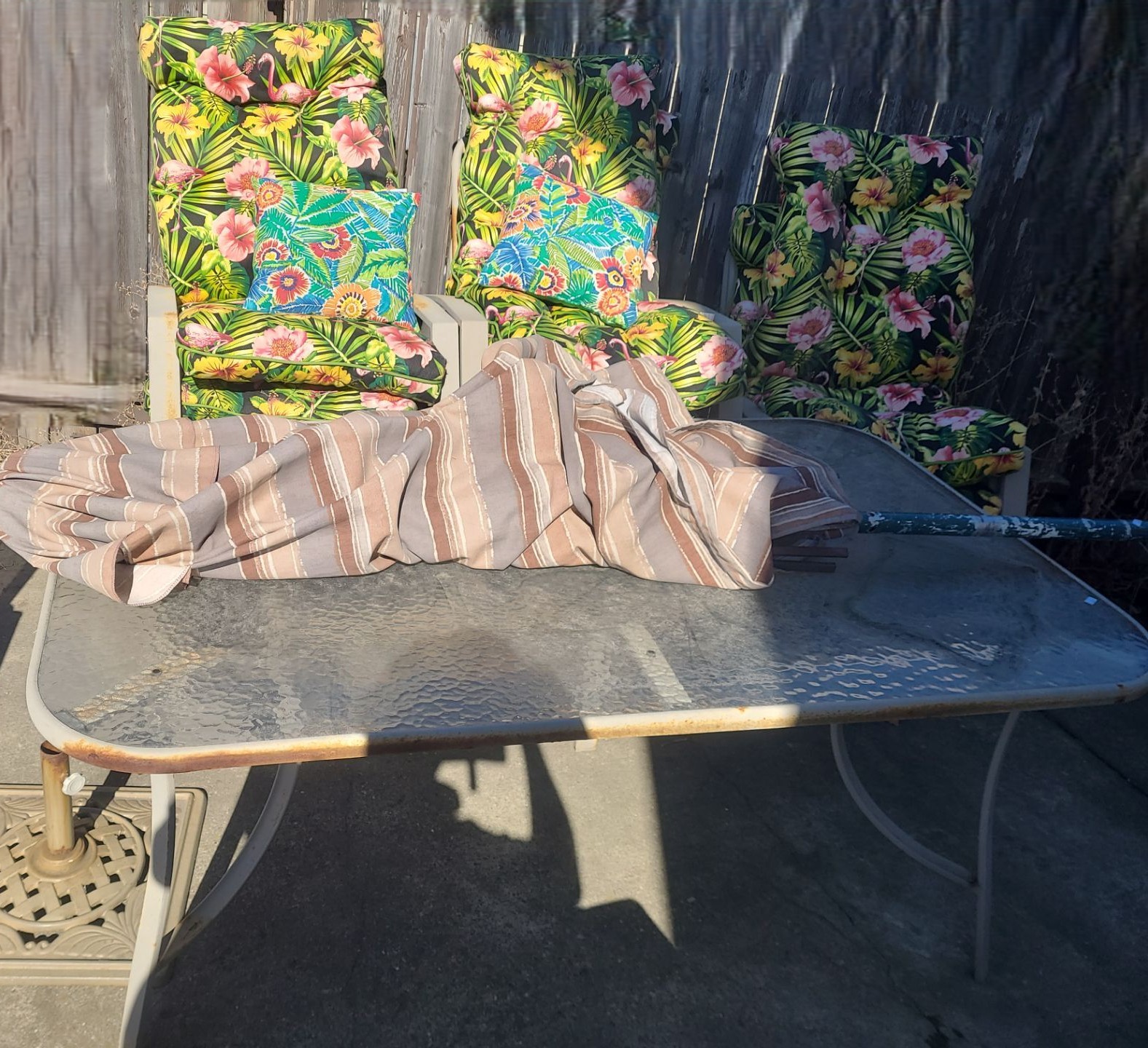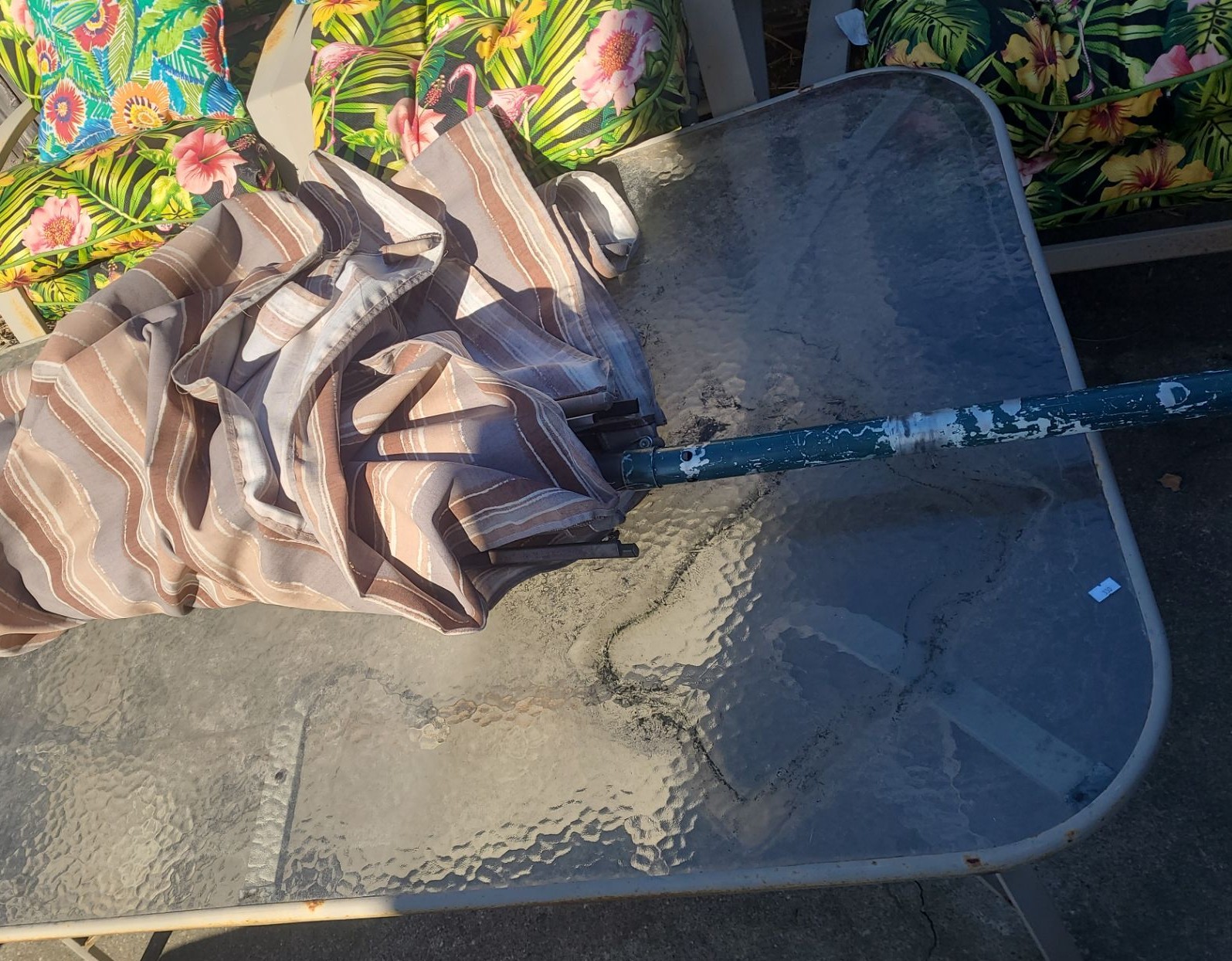 Patio Table 66 W, 39 D, 28 T and 6 Chairs 26 W, 24 D, 40 T, Includes Umbrella/ Stand and Cushions