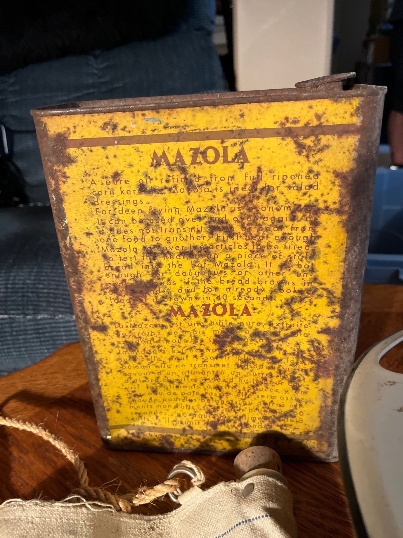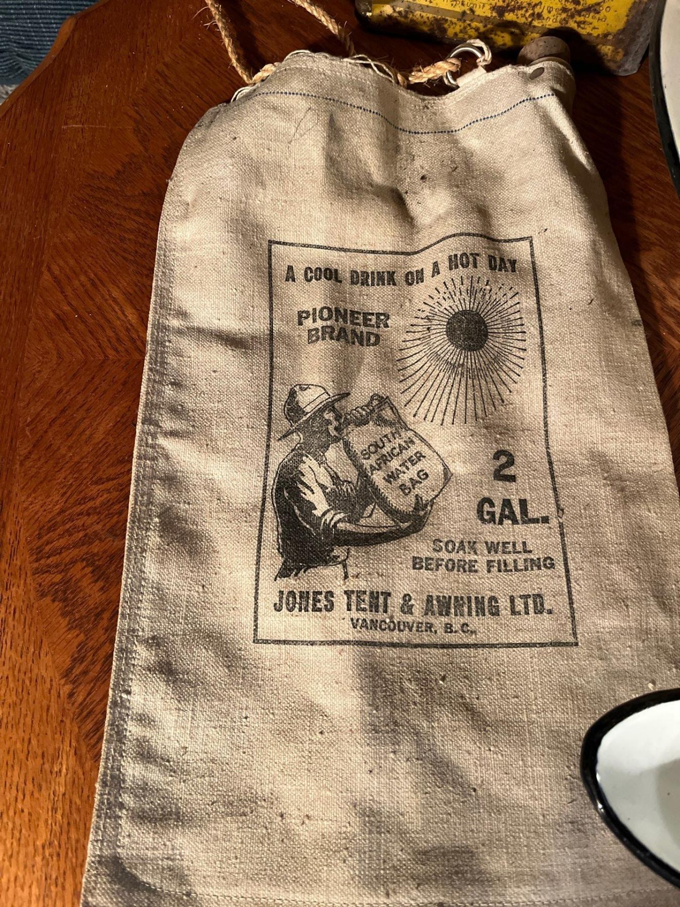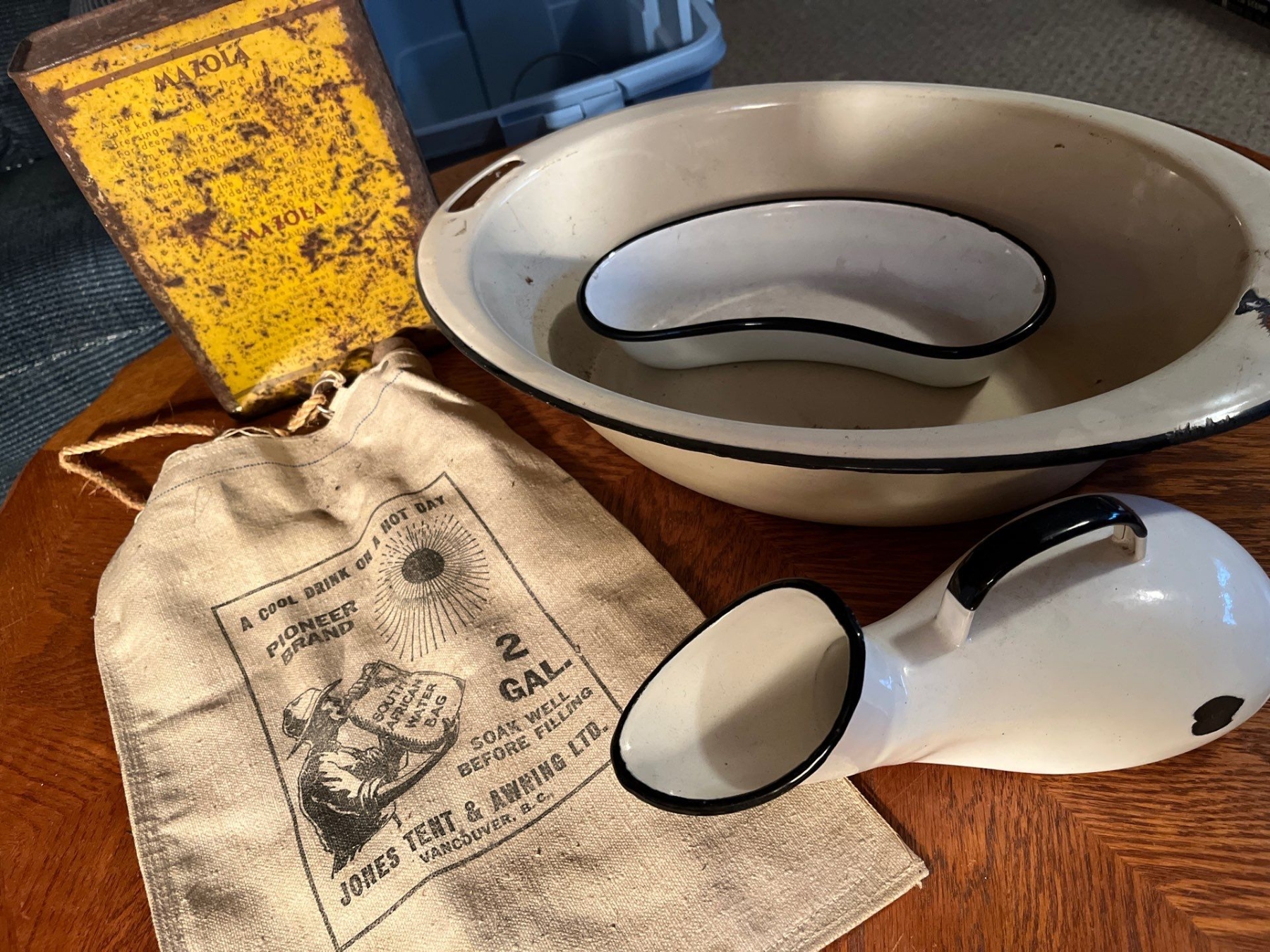 Pee bottles and wash basins along with a vintage tin and South African water bag