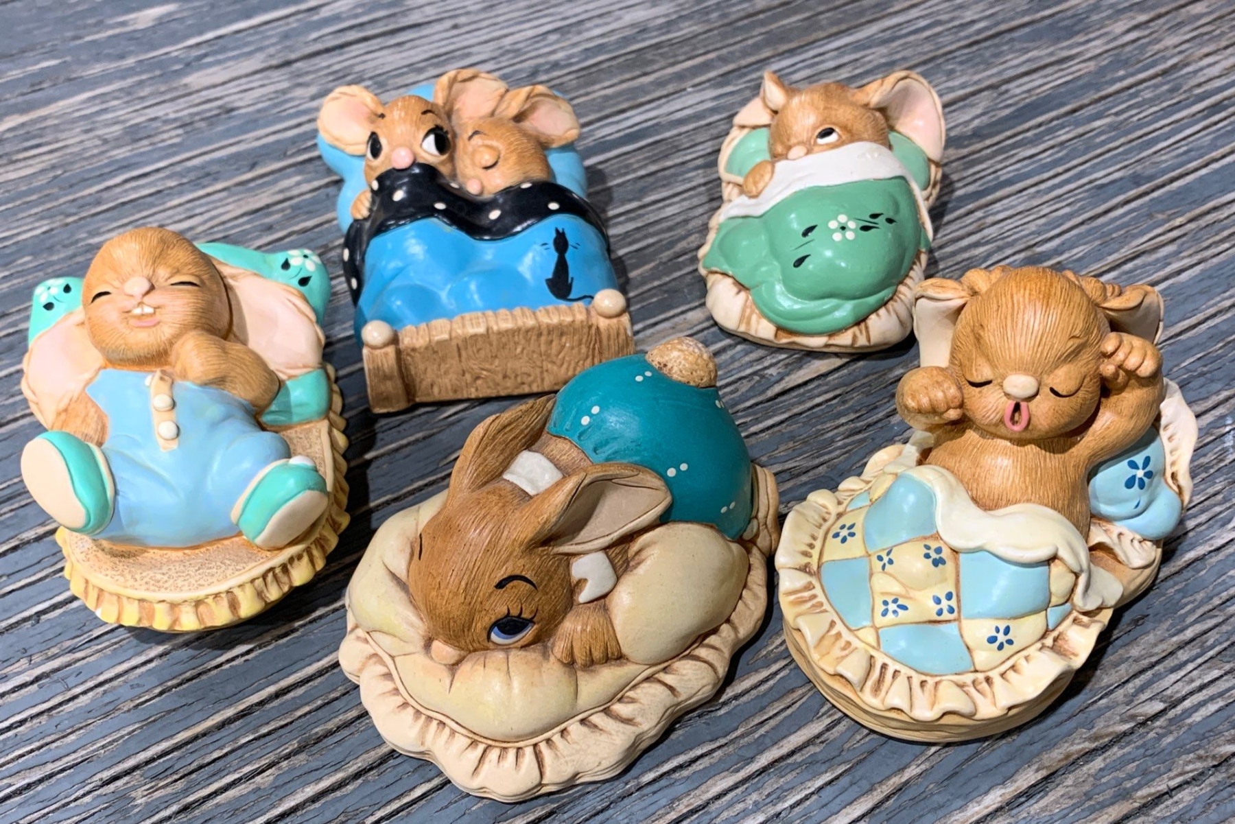 Pendelfin Turquoise Sleeping Rabbits: 'Snuggles Awake', 'Peeps', 'Sunny', 'Dodger', 'Twins'