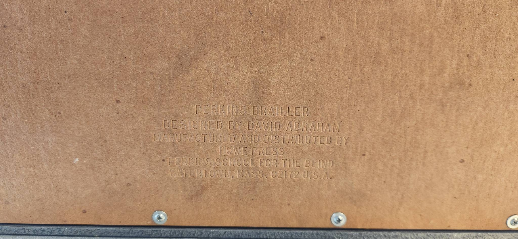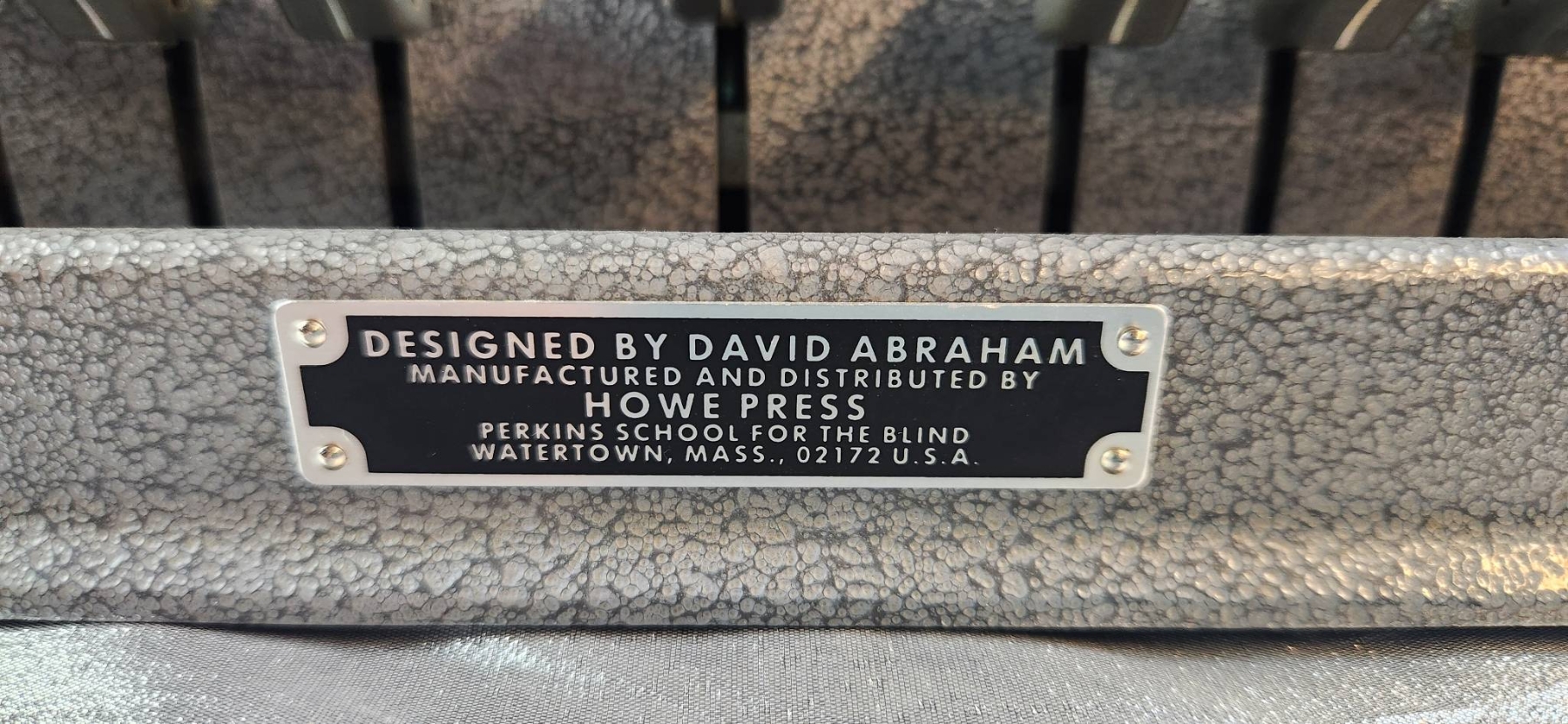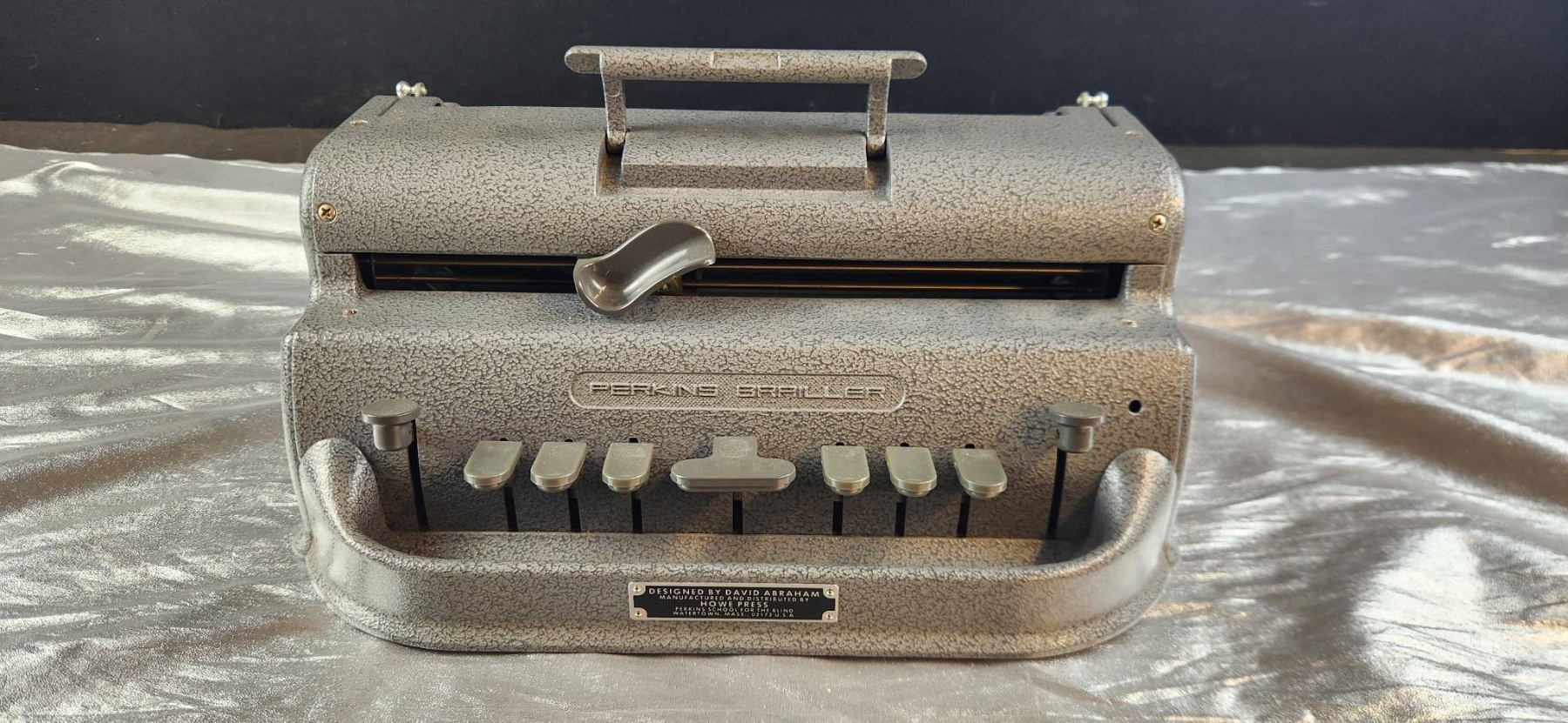 Perkins Braille press manufactured by Howe Press in 1952. This durable and functional piece was originally used in a historic residential school for the blind. Designed by David Abraham, it features six keys, a space bar, and a sturdy metal construction for longevity. | | | Includes a clear maker's mark and functional components. Dimensions: approximately 12 inches wide, 10 inches deep, and 6 inches high.