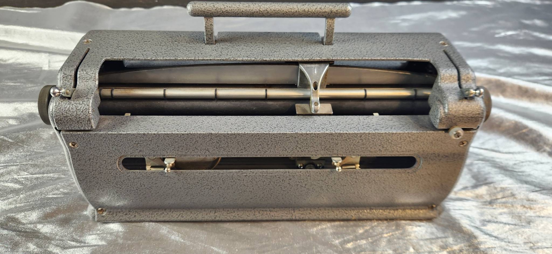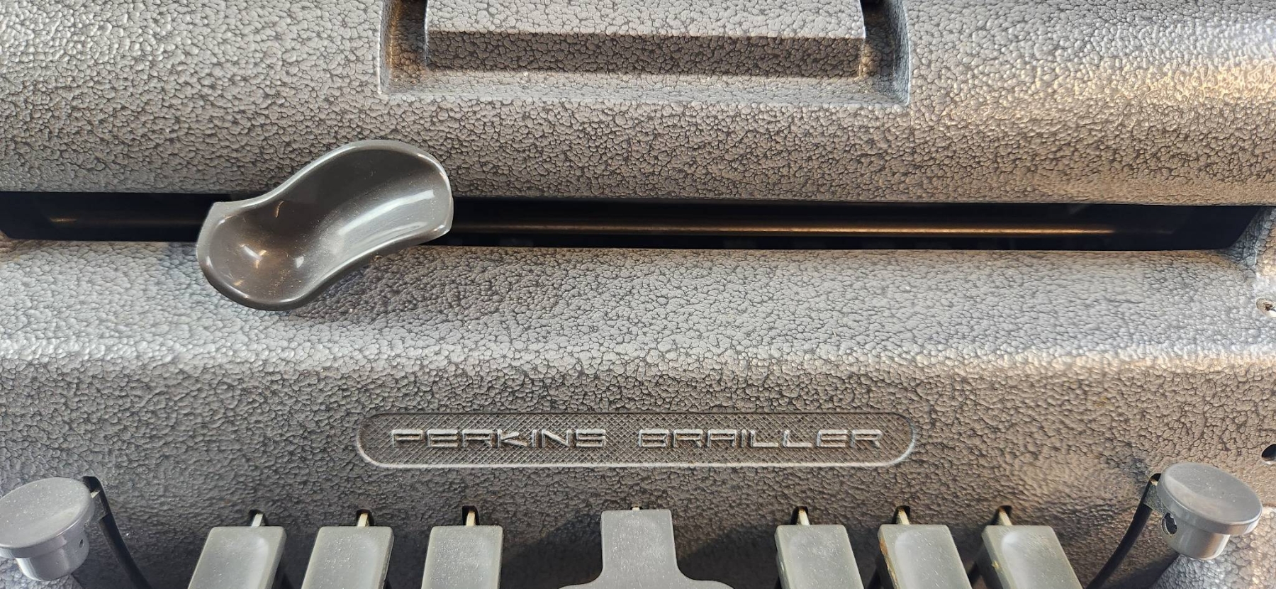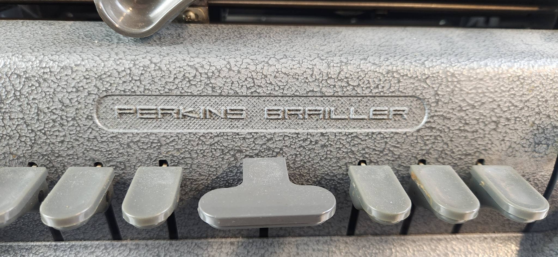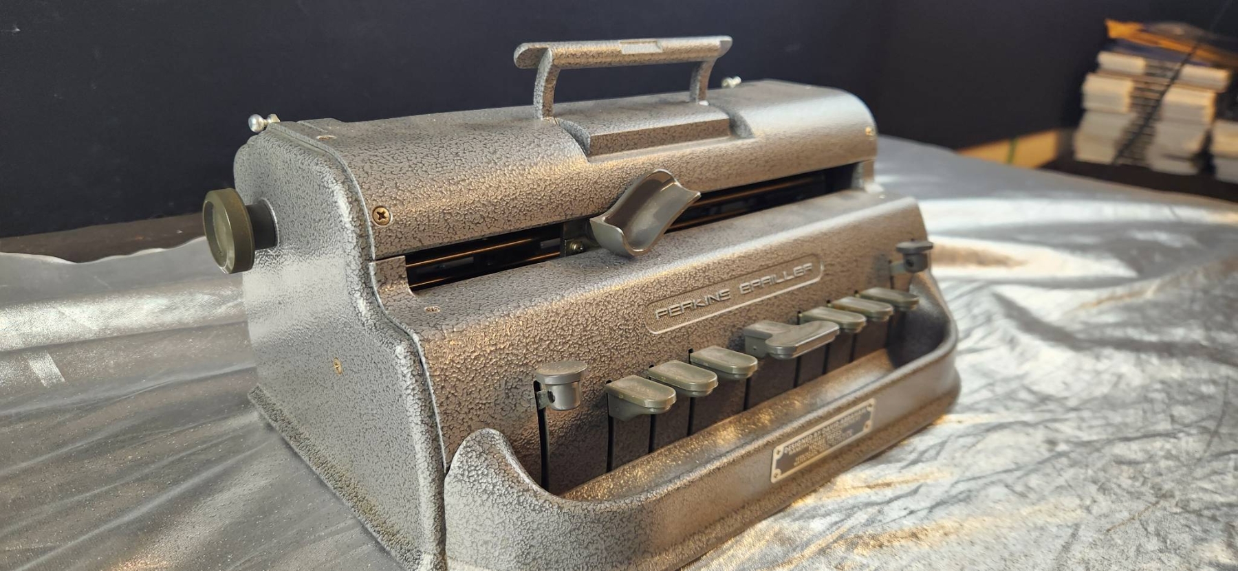 Perkins Braille press manufactured by Howe Press in 1952. This durable and functional piece was originally used in a historic residential school for the blind. Designed by David Abraham, it features six keys, a space bar, and a sturdy metal construction for longevity. | | | Includes a clear maker's mark and functional components. Dimensions: approximately 12 inches wide, 10 inches deep, and 6 inches high.