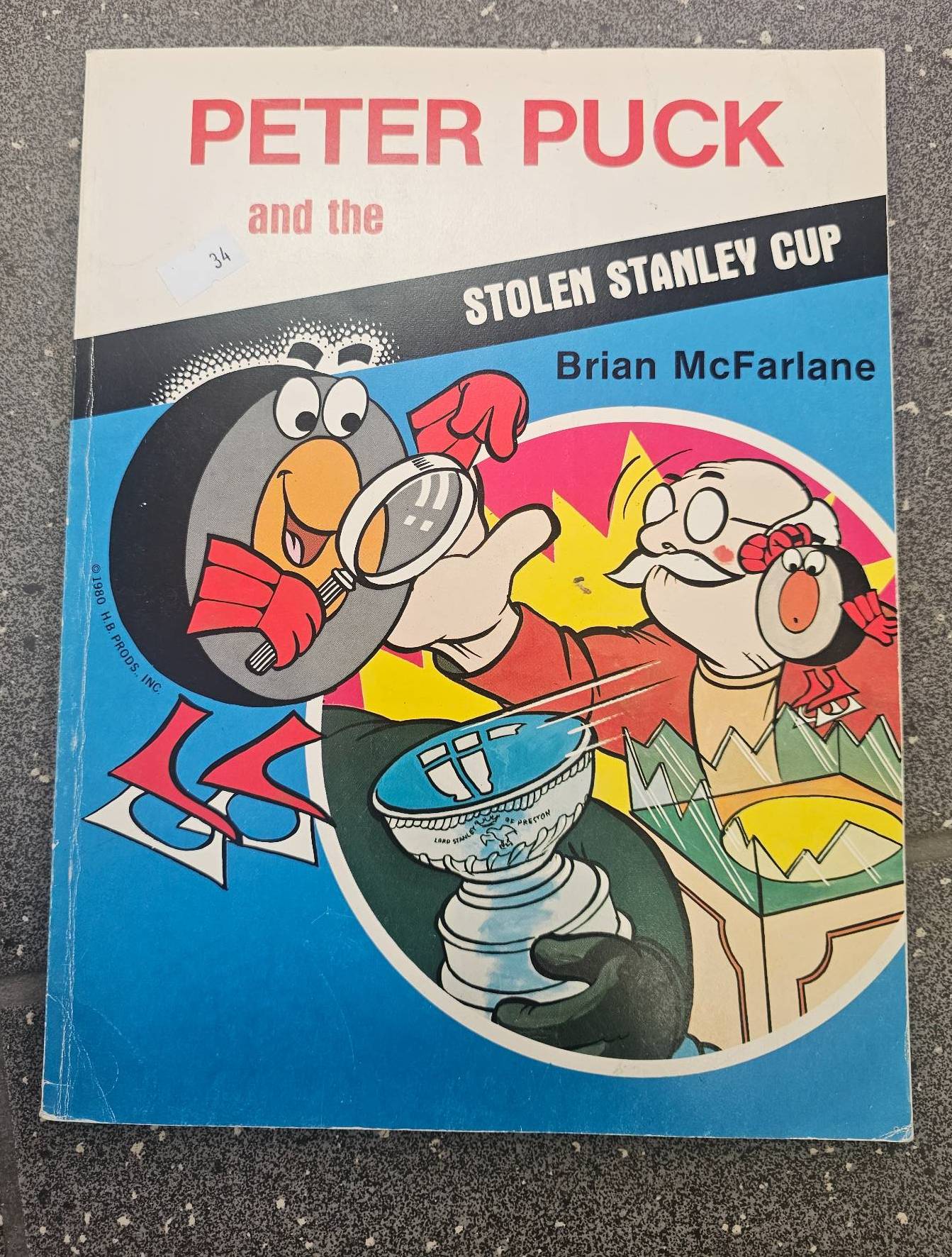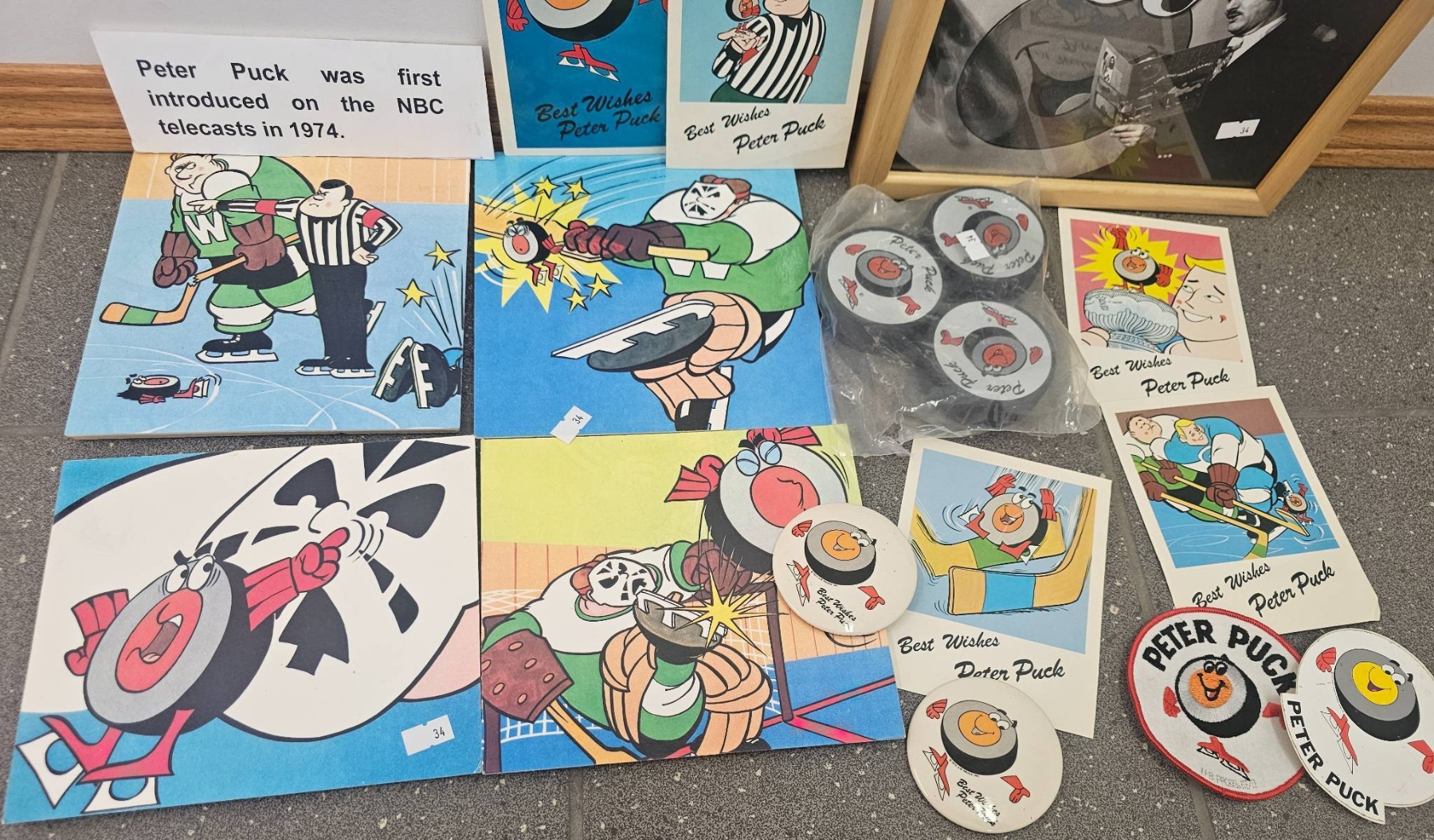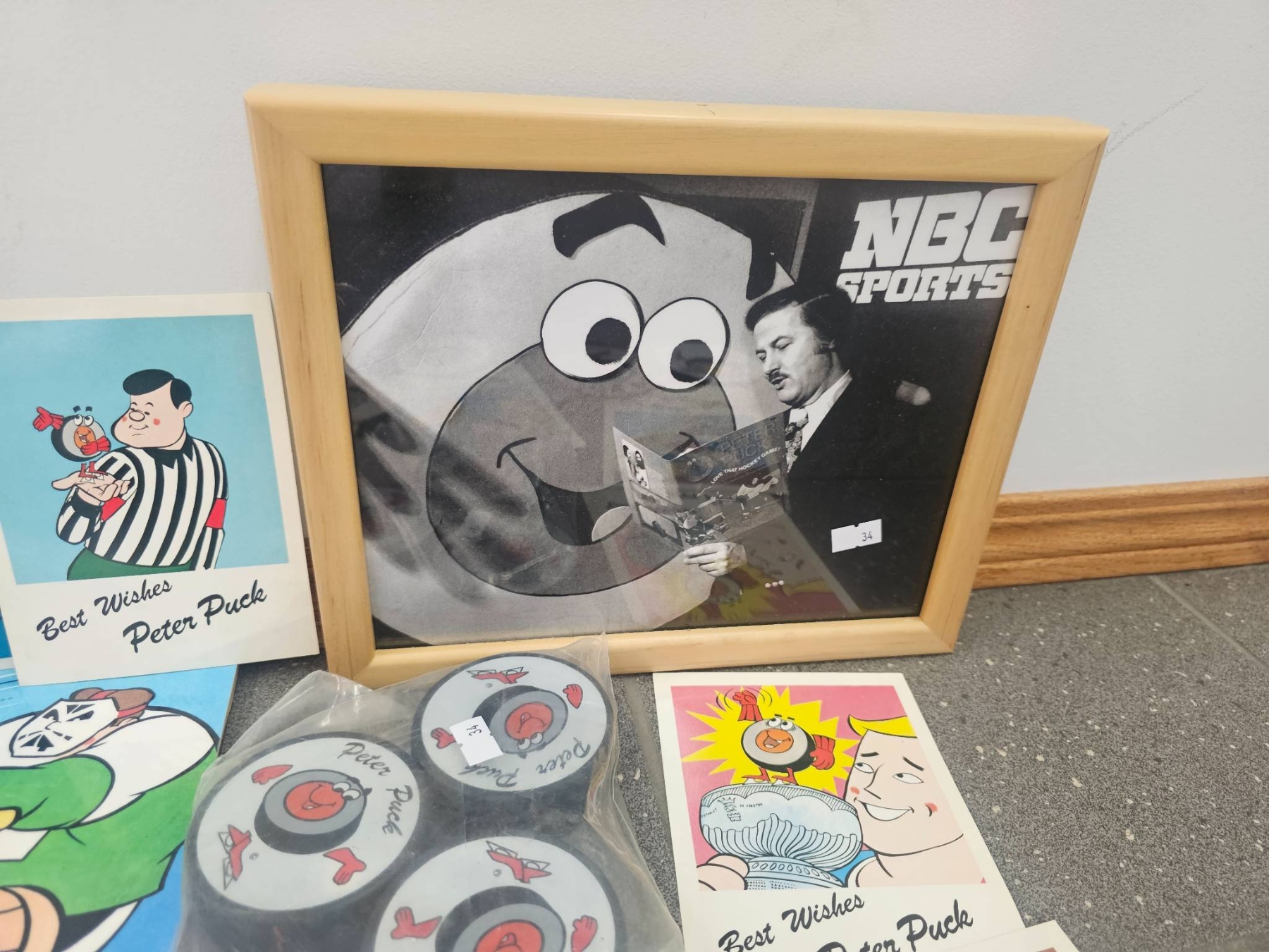 Peter Puck memorabilia including books, coloring books, decals, and other items. The set features titles written by Brian McFarlane, including 'Peter Puck and the Stolen Stanley Cup' and 'Peter Puck's Greatest Moments in Hockey'. Includes a framed NBC Sports photo and various promotional items. Items showcase colorful artwork featuring Peter Puck, a character from NBC's hockey programming introduced in 1974.