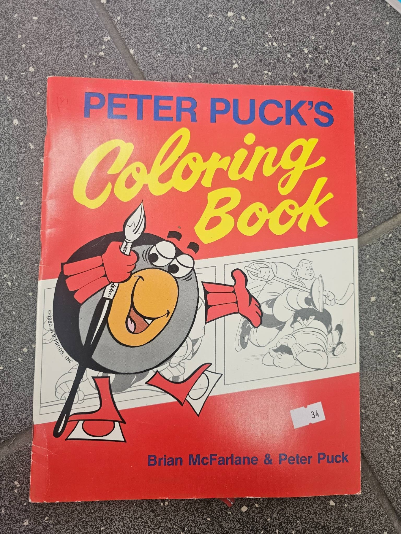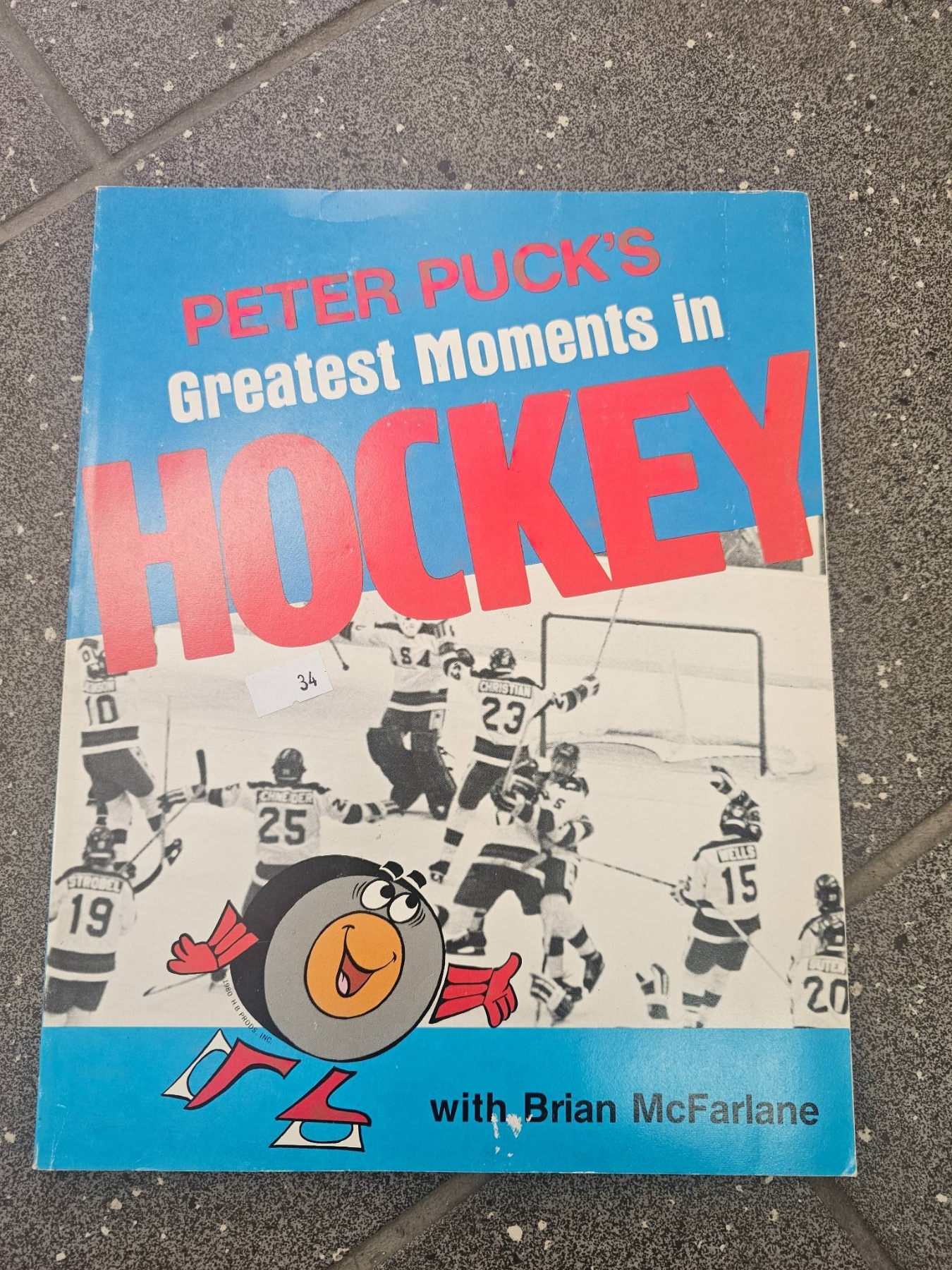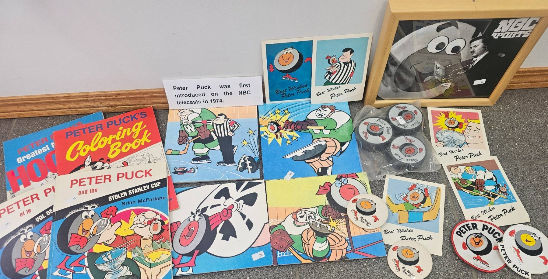 Peter Puck memorabilia including books, coloring books, decals, and other items. The set features titles written by Brian McFarlane, including 'Peter Puck and the Stolen Stanley Cup' and 'Peter Puck's Greatest Moments in Hockey'. Includes a framed NBC Sports photo and various promotional items. Items showcase colorful artwork featuring Peter Puck, a character from NBC's hockey programming introduced in 1974.