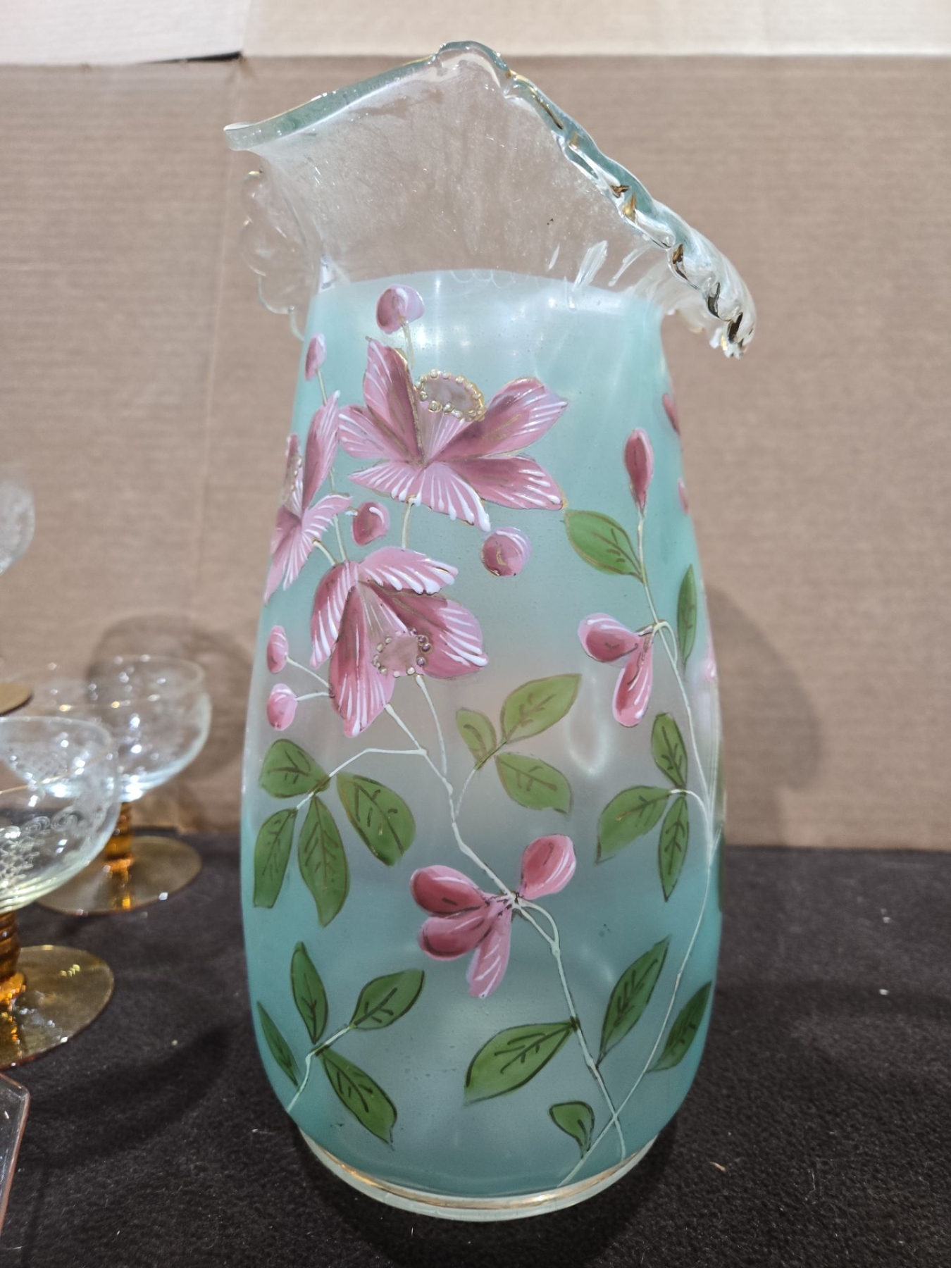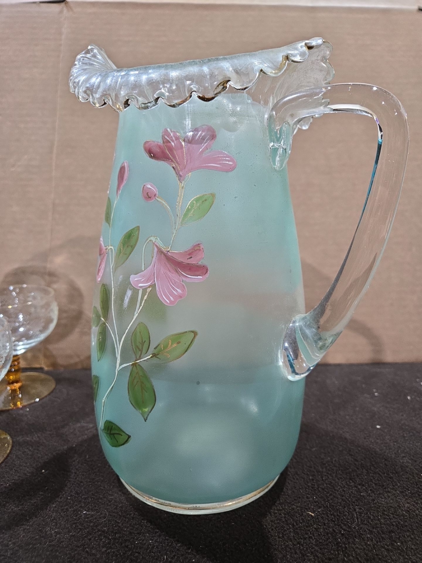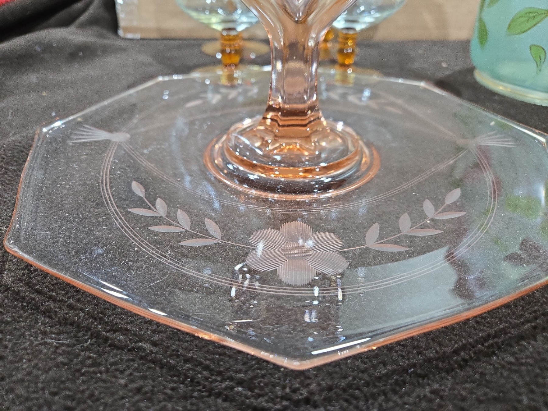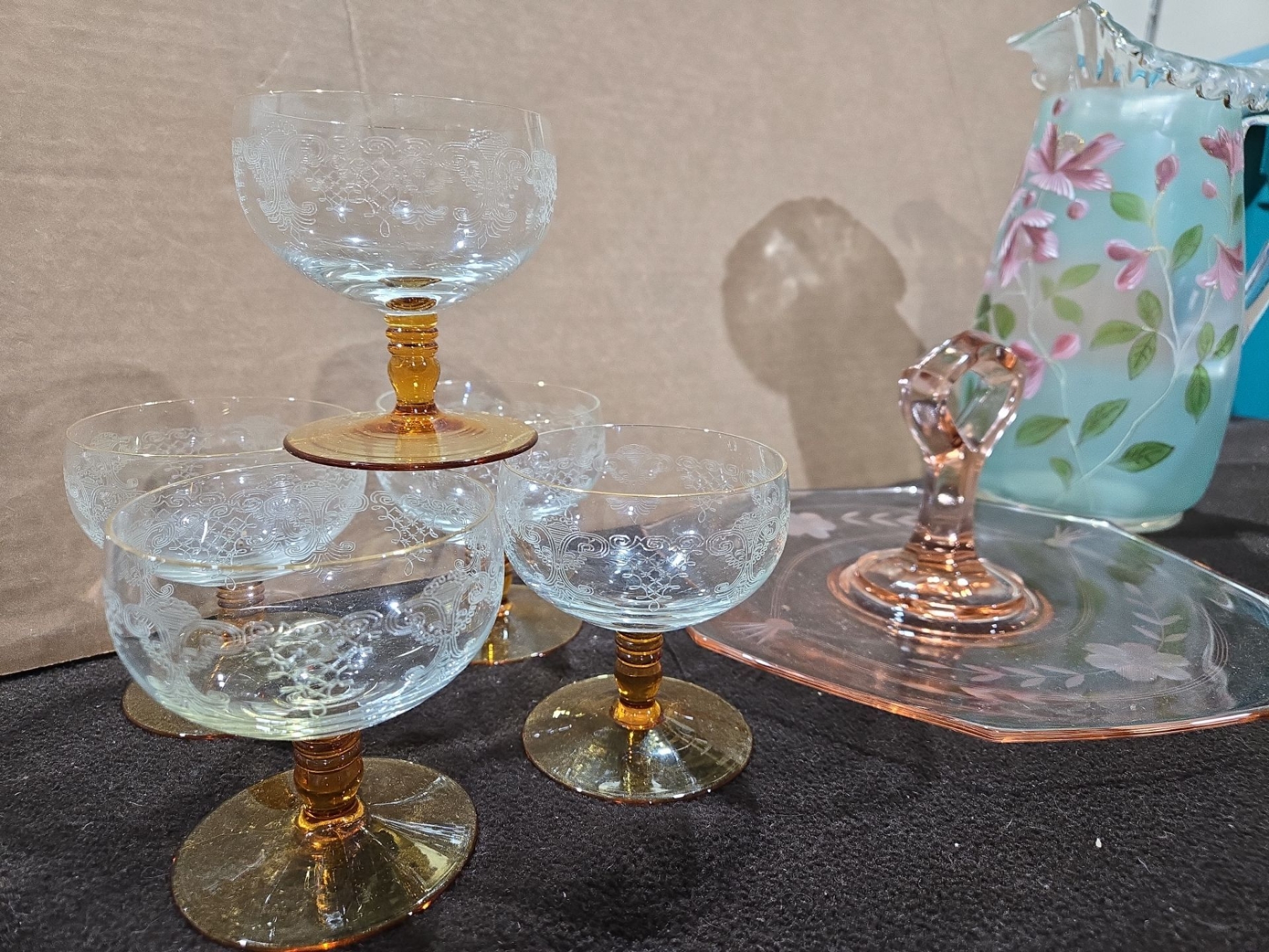Pink Depression Glass Cupcake Holder, Amber Based Liquor Glasses + Handmade + Painted Pitcher/Jug