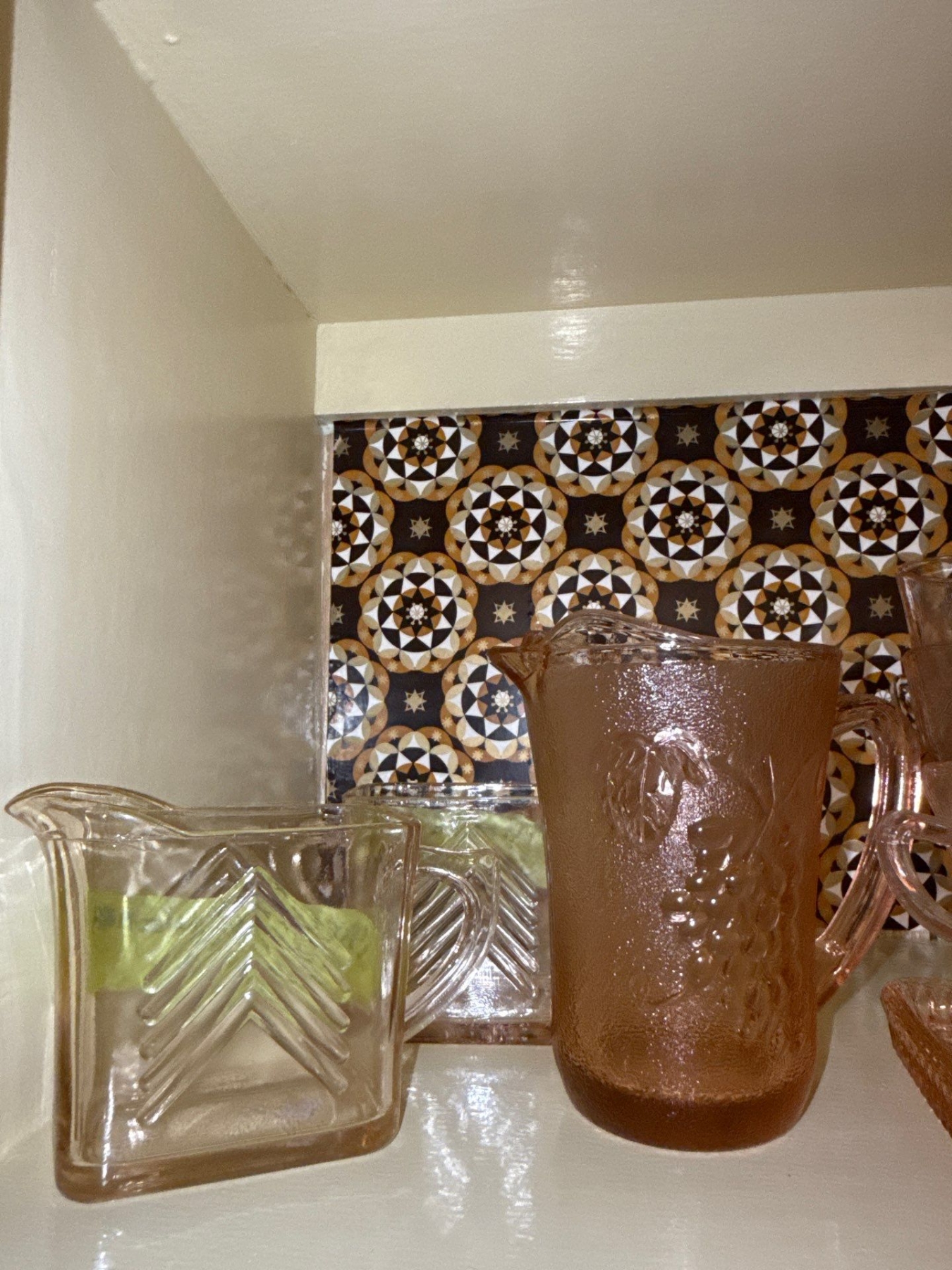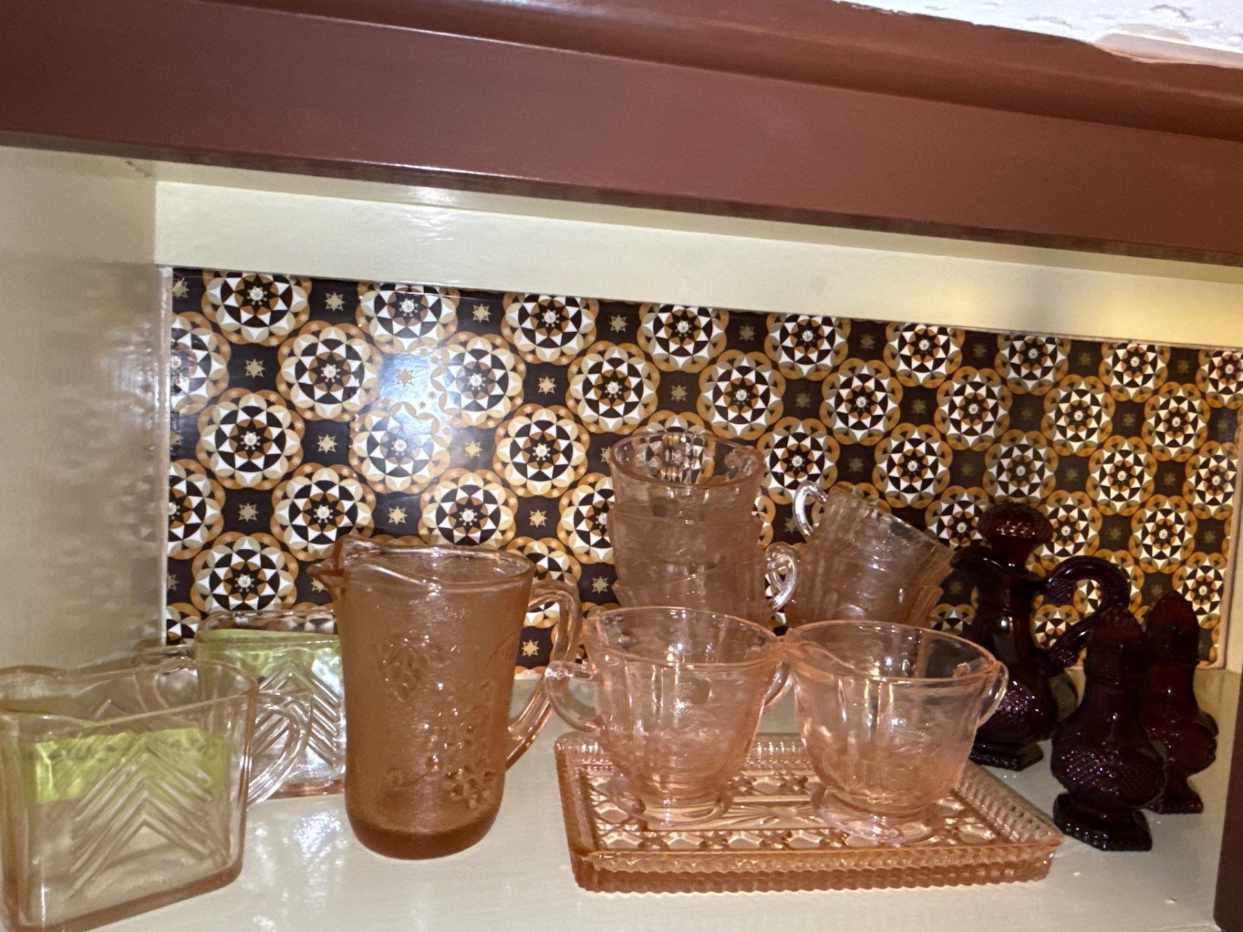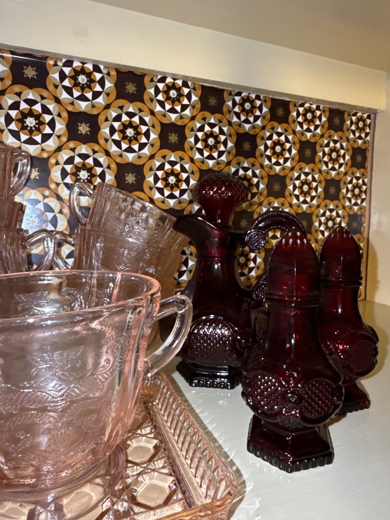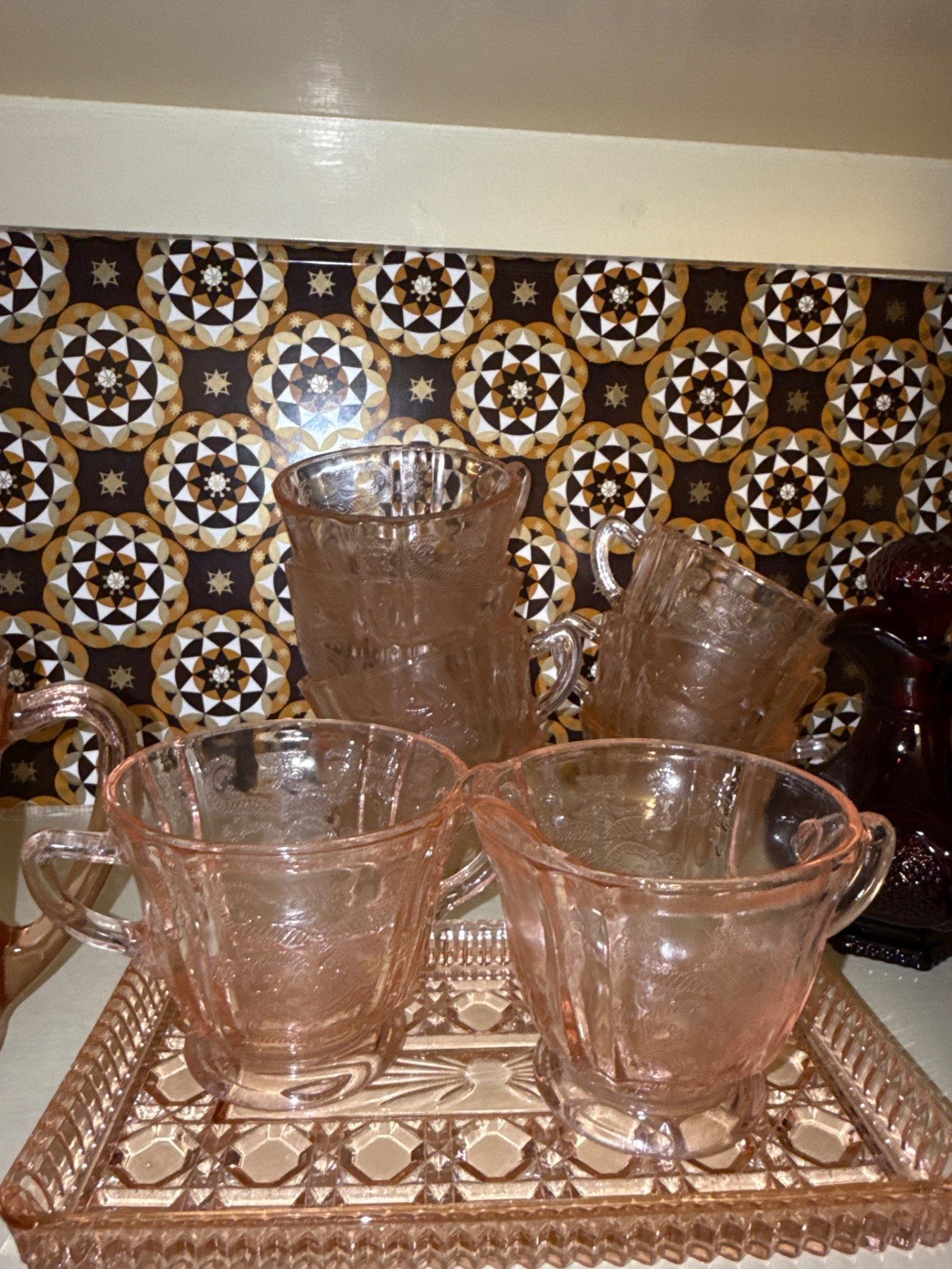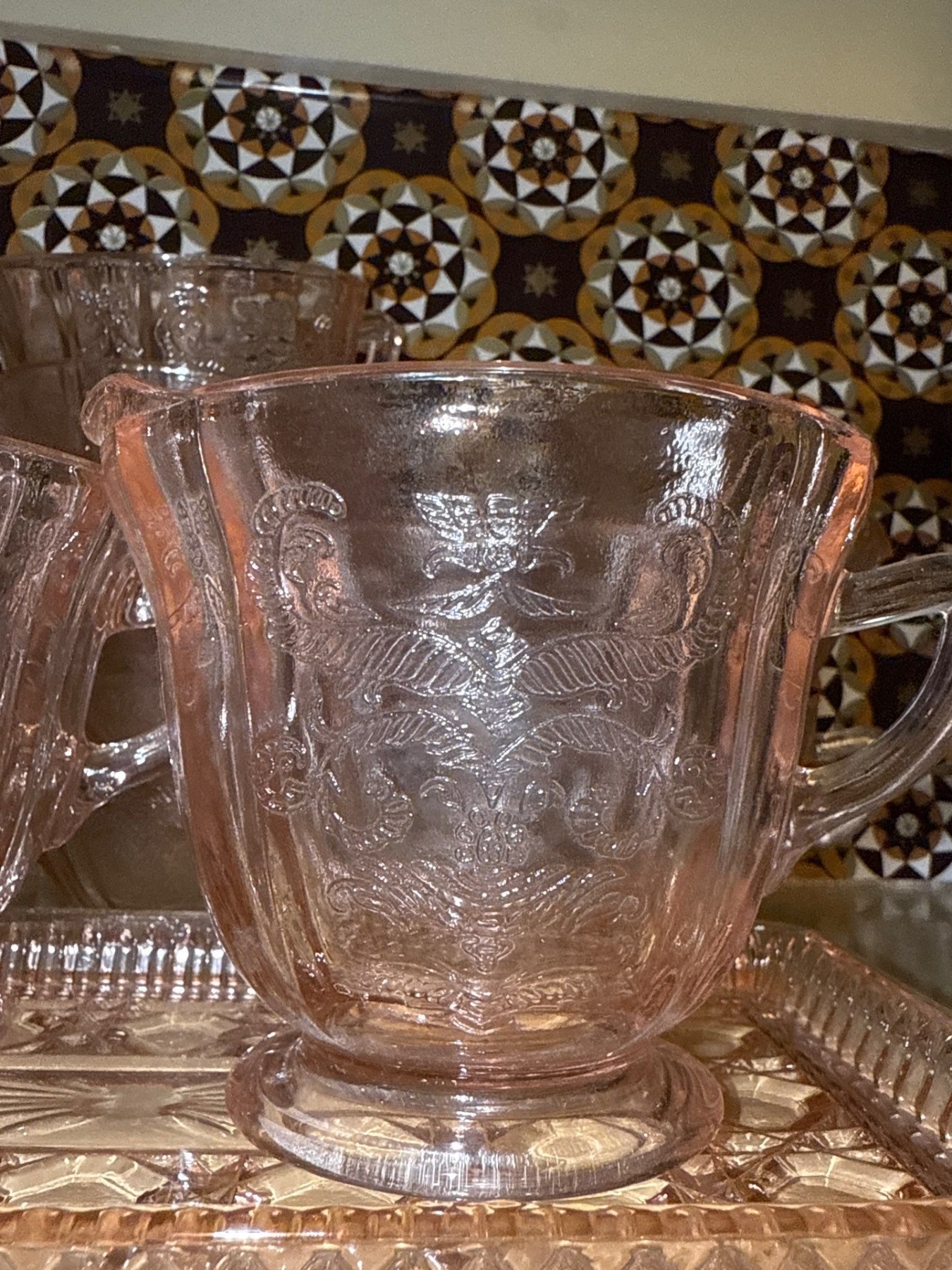 Pink Depression Glassware Set (Cups, Sugar & Creamer), Floral Pink Pitcher, Avon Red Collectables