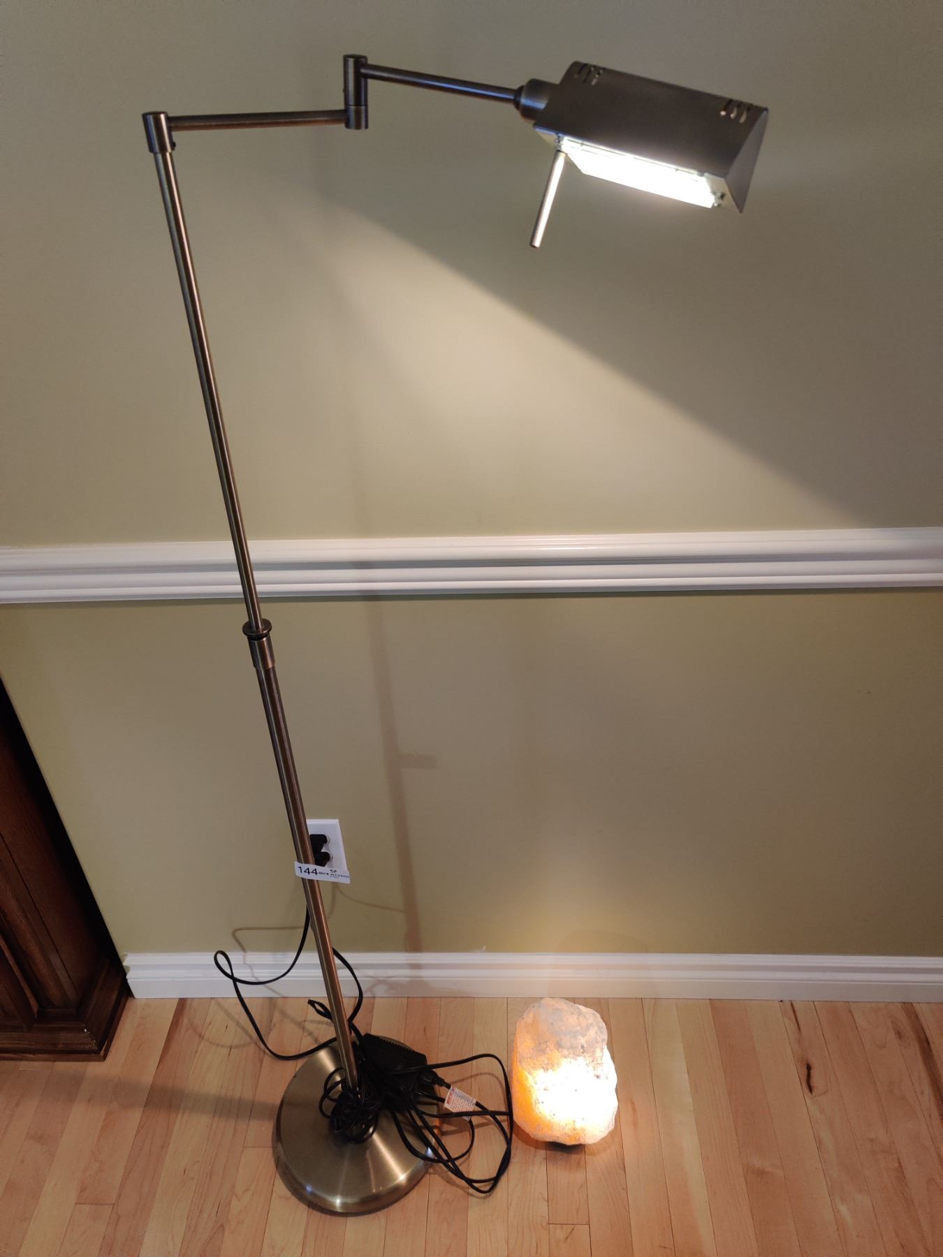 Brushed metal floor lamp with beautiful little pink Himalayan salt lamp. Both in great working condition.