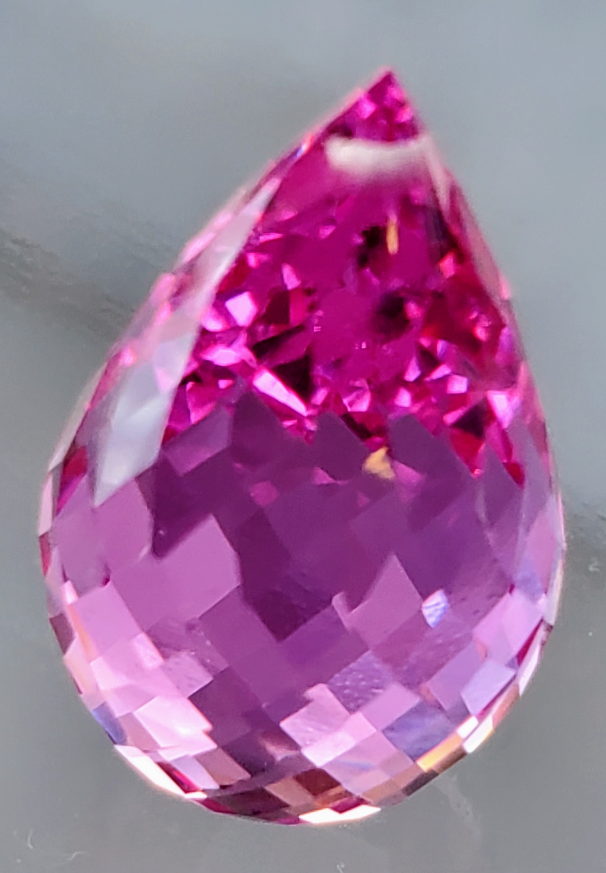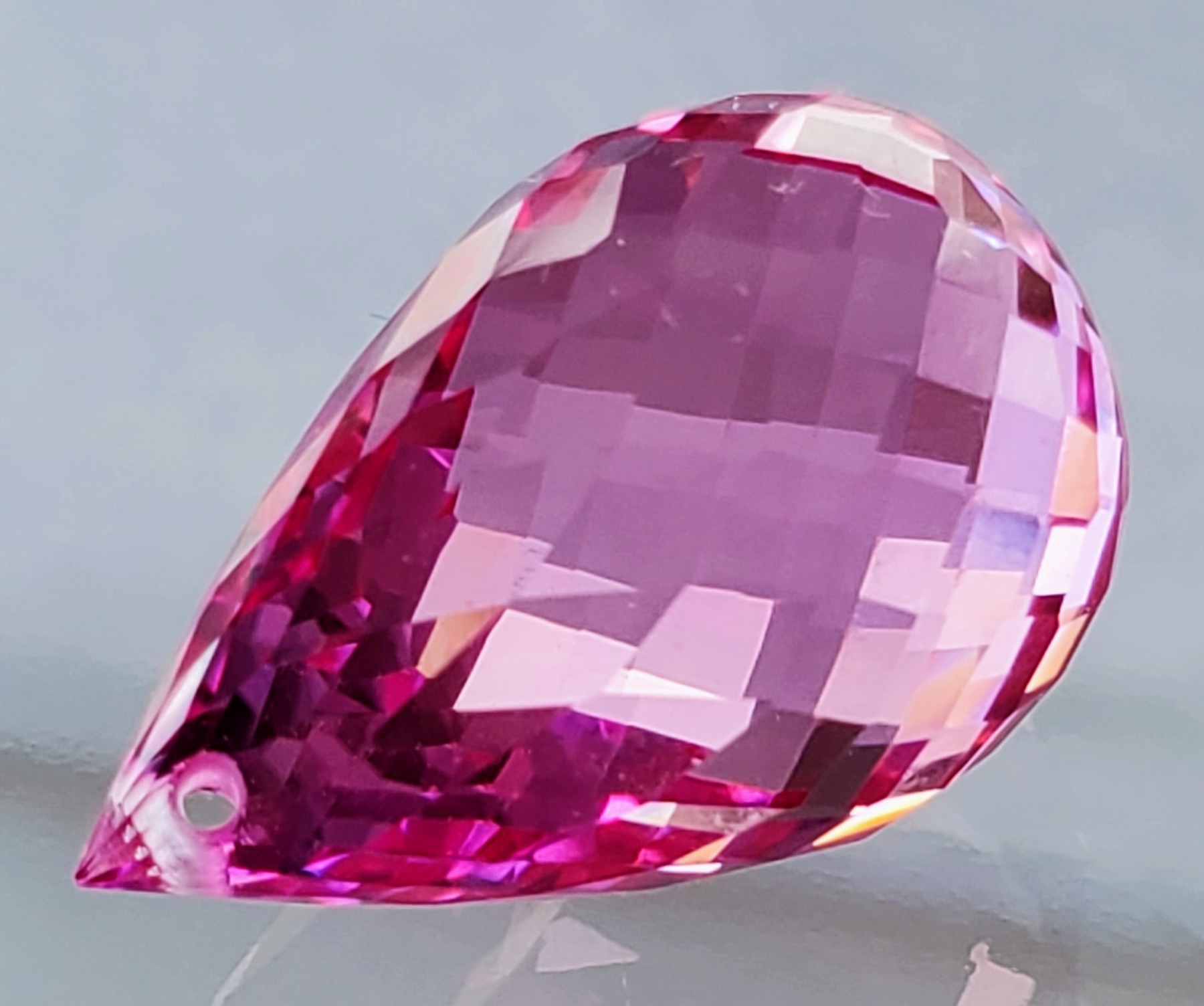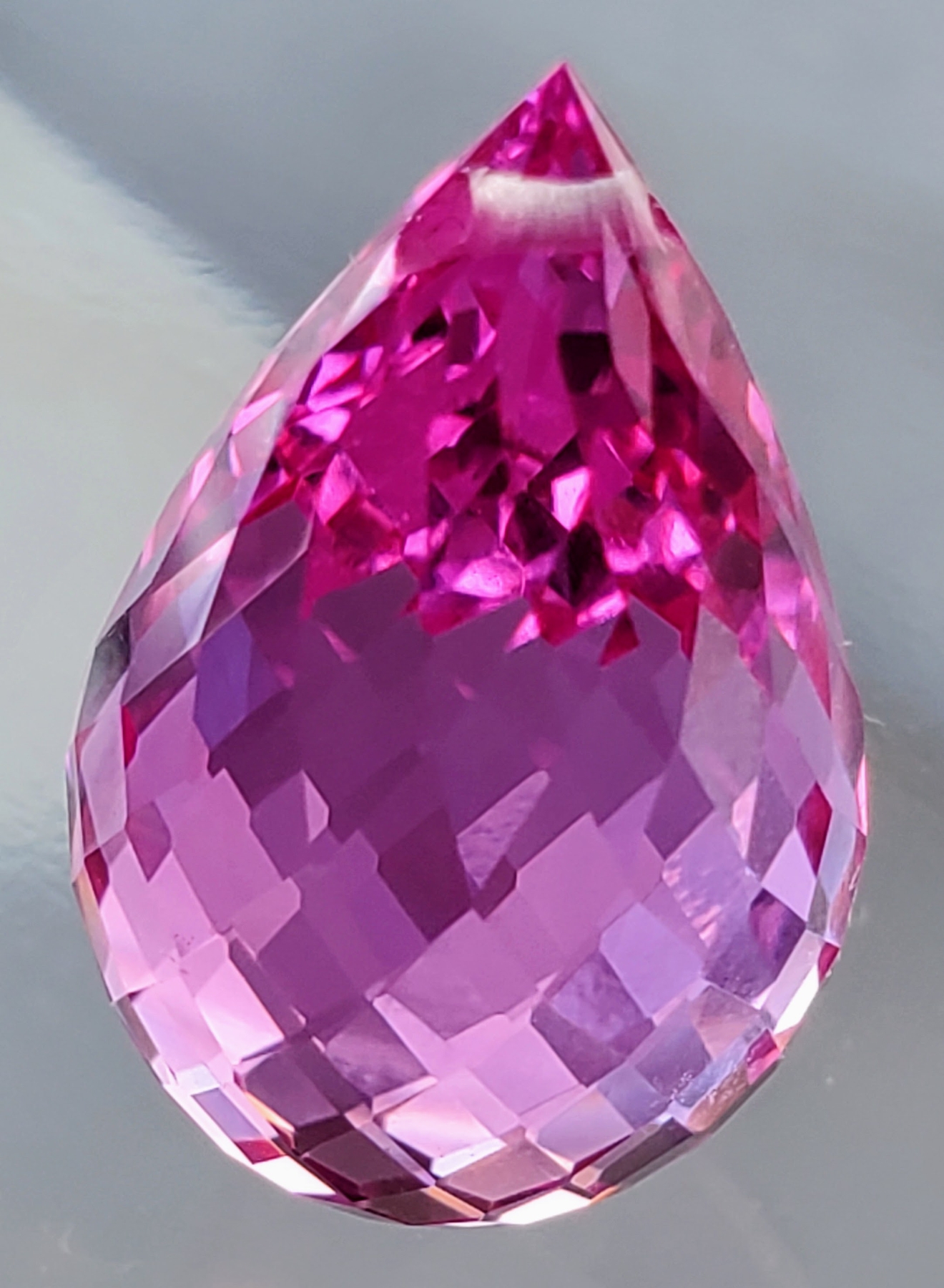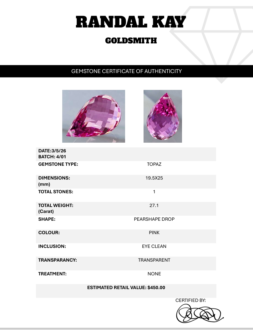 A vibrant 27.1-carat pink topaz with eye-clean clarity, transparent body, and elegant pear-drop cut. Untreated and brilliantly colored, it offers striking presence and sparkle. Estimated retail price is $450.