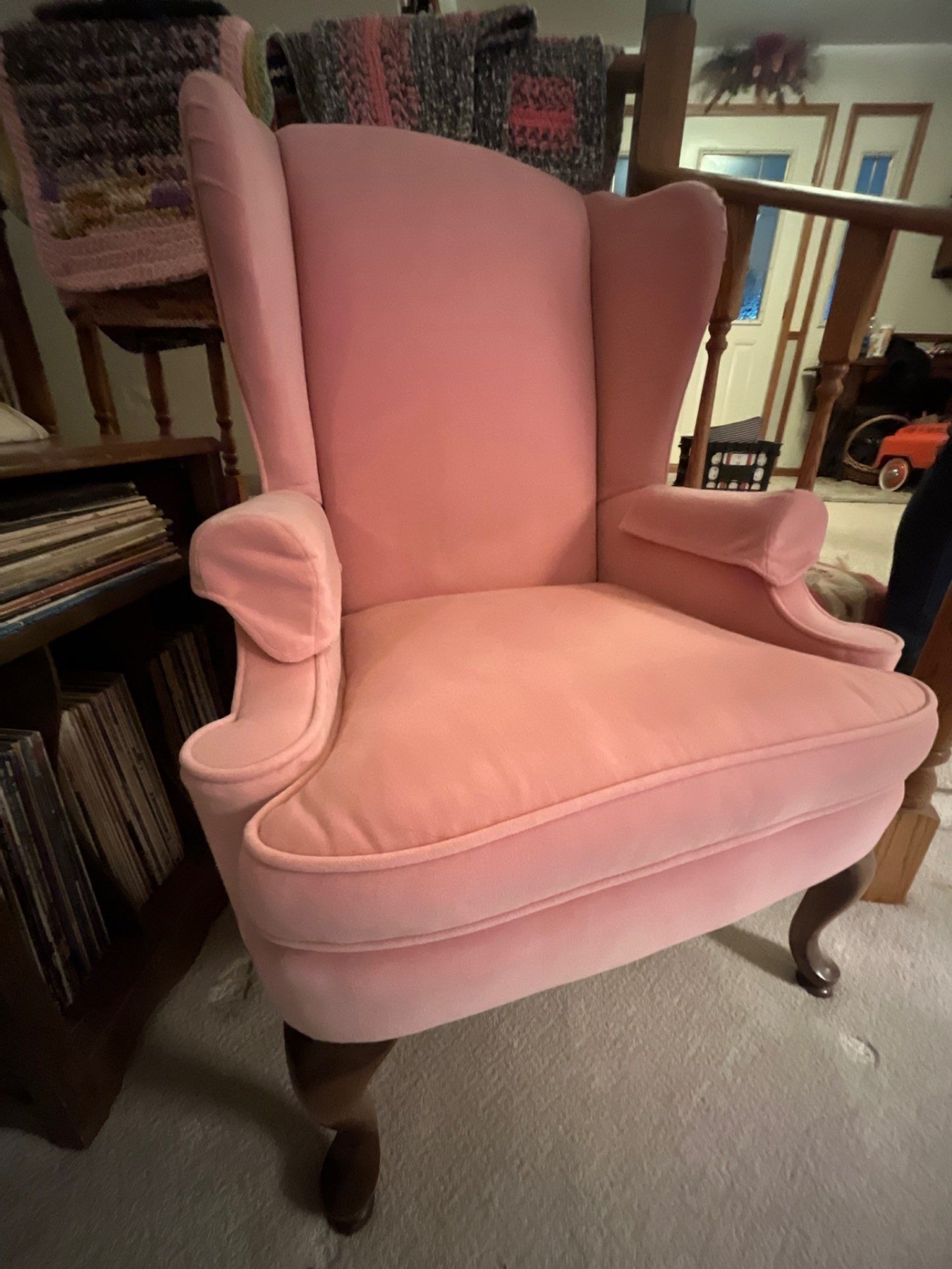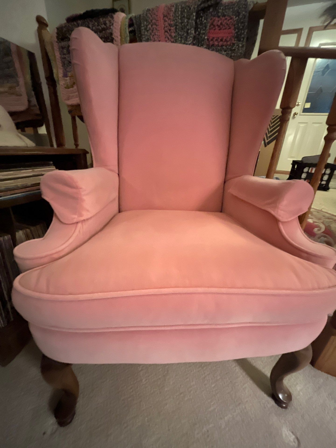 Pink velvet high back chair with wood legs in amazing condition