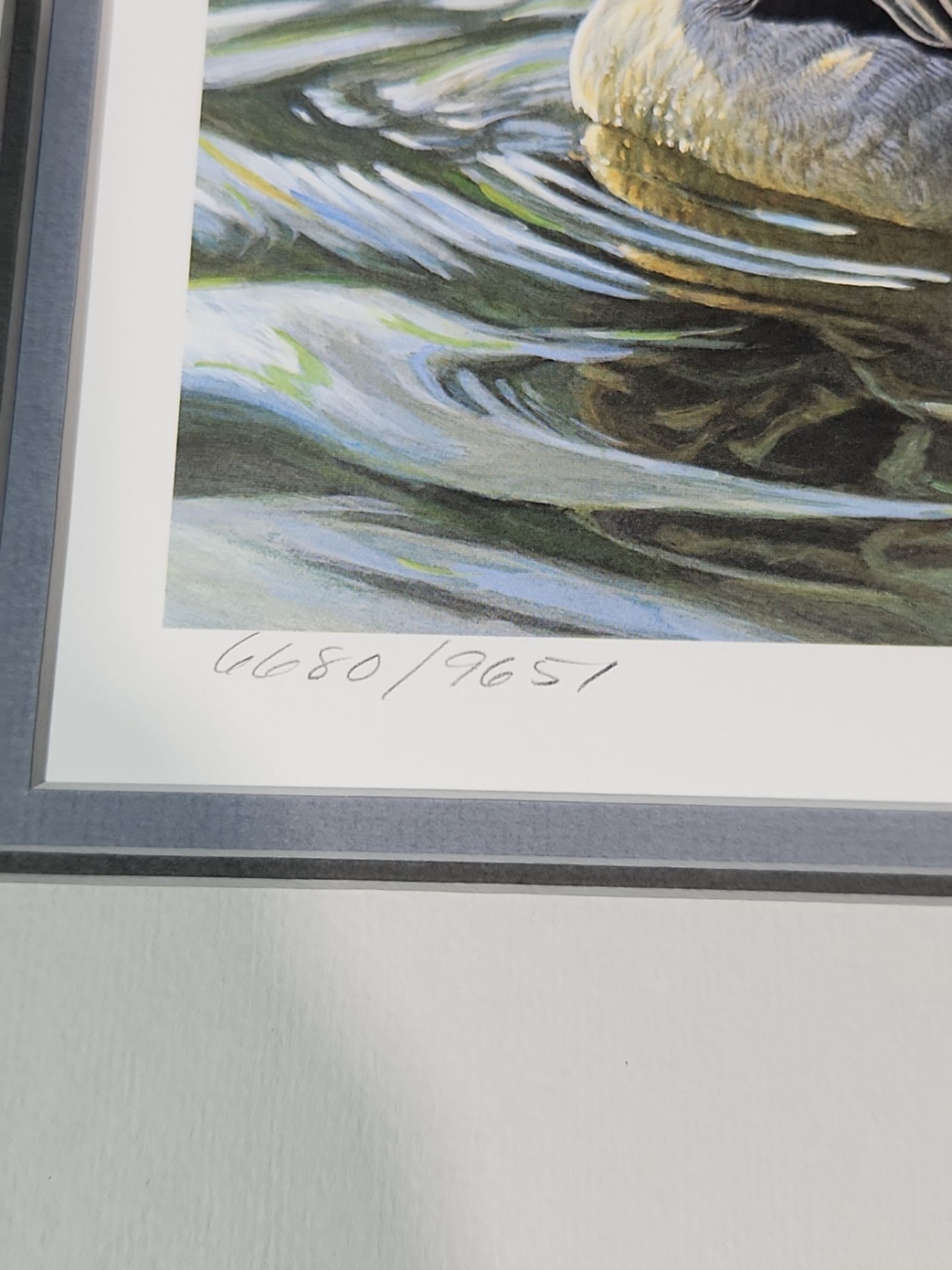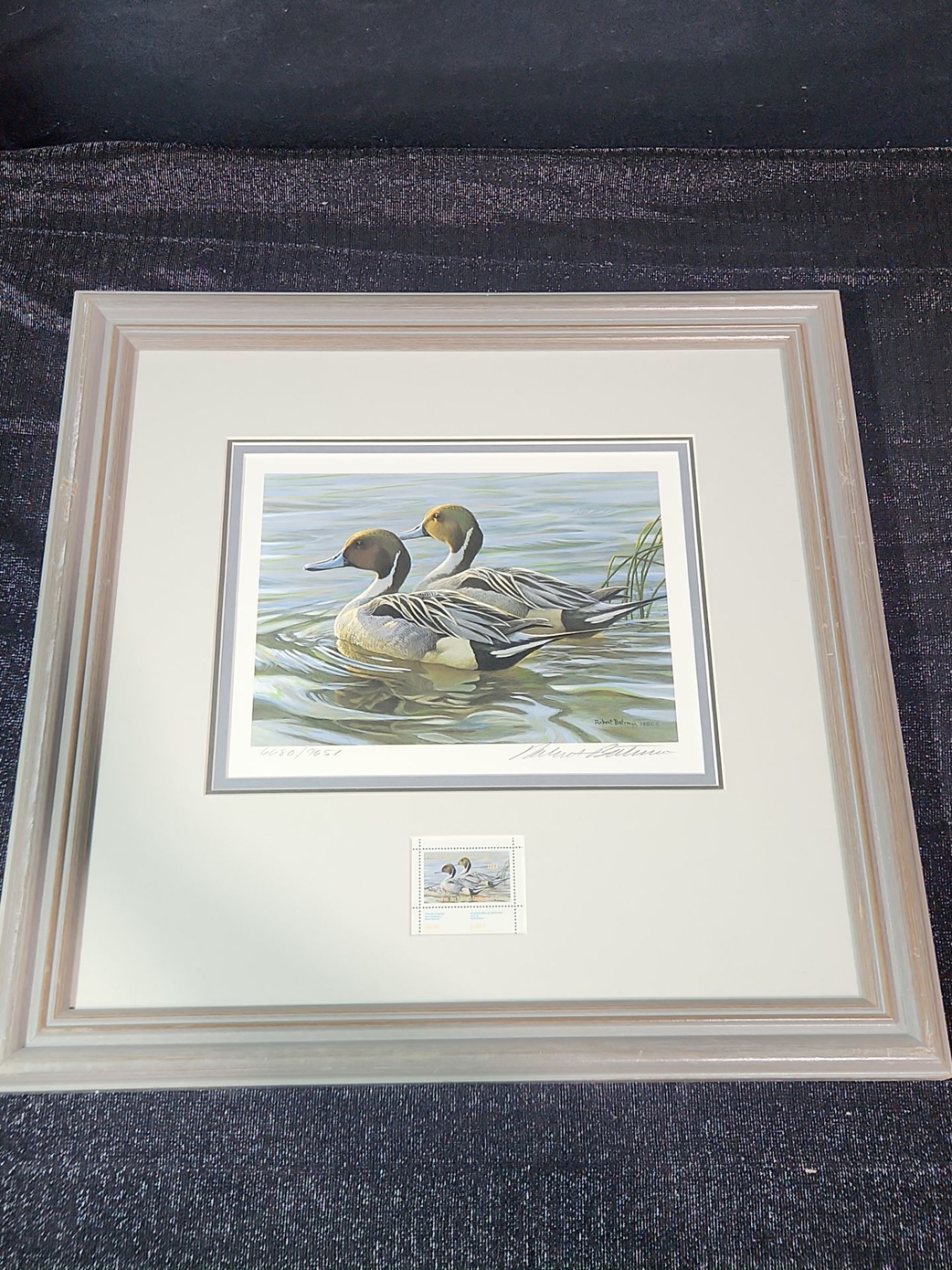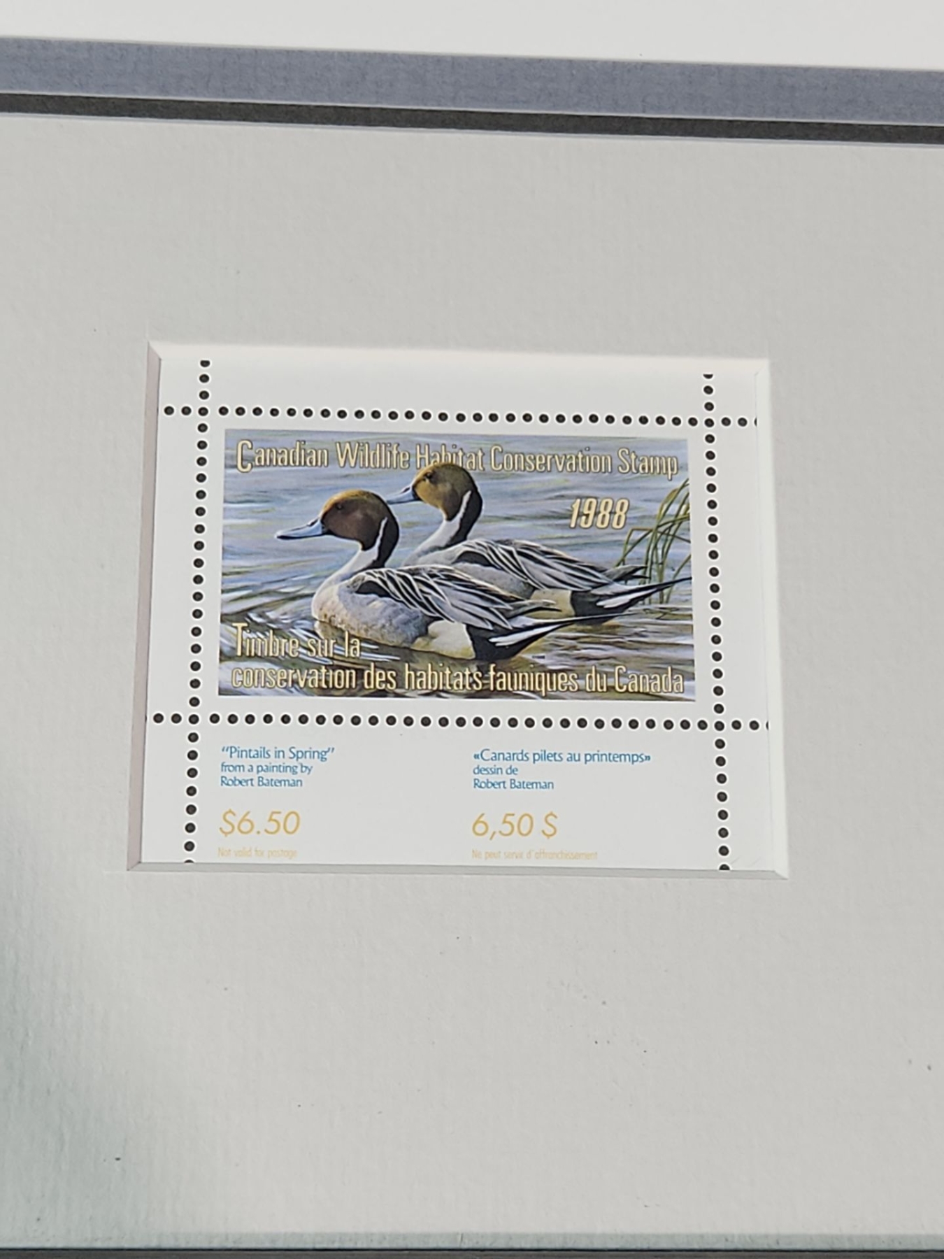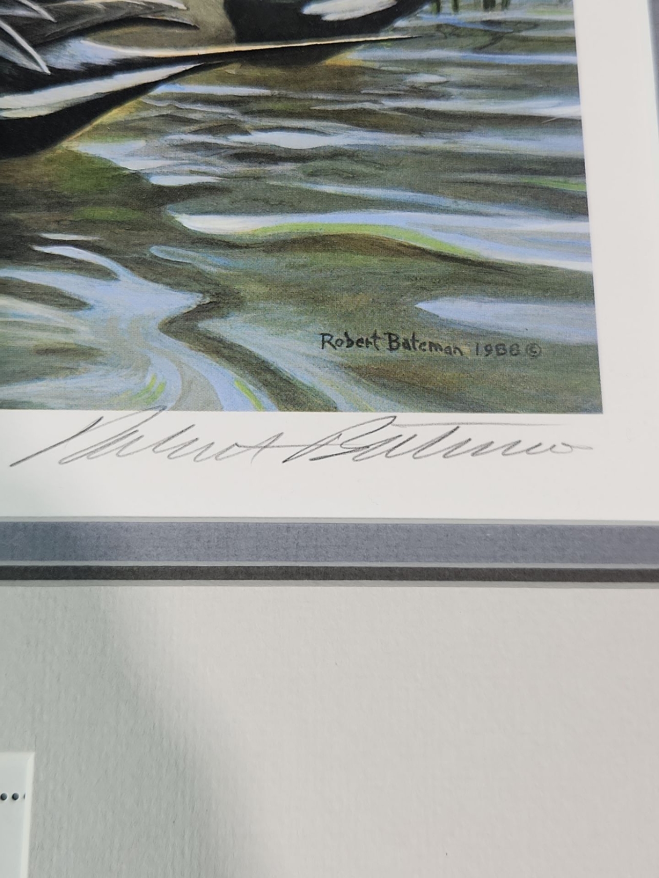 This is a framed , signed print by Robert Bateman. attached is a corresponding 1988 postage stamp of the same image.
