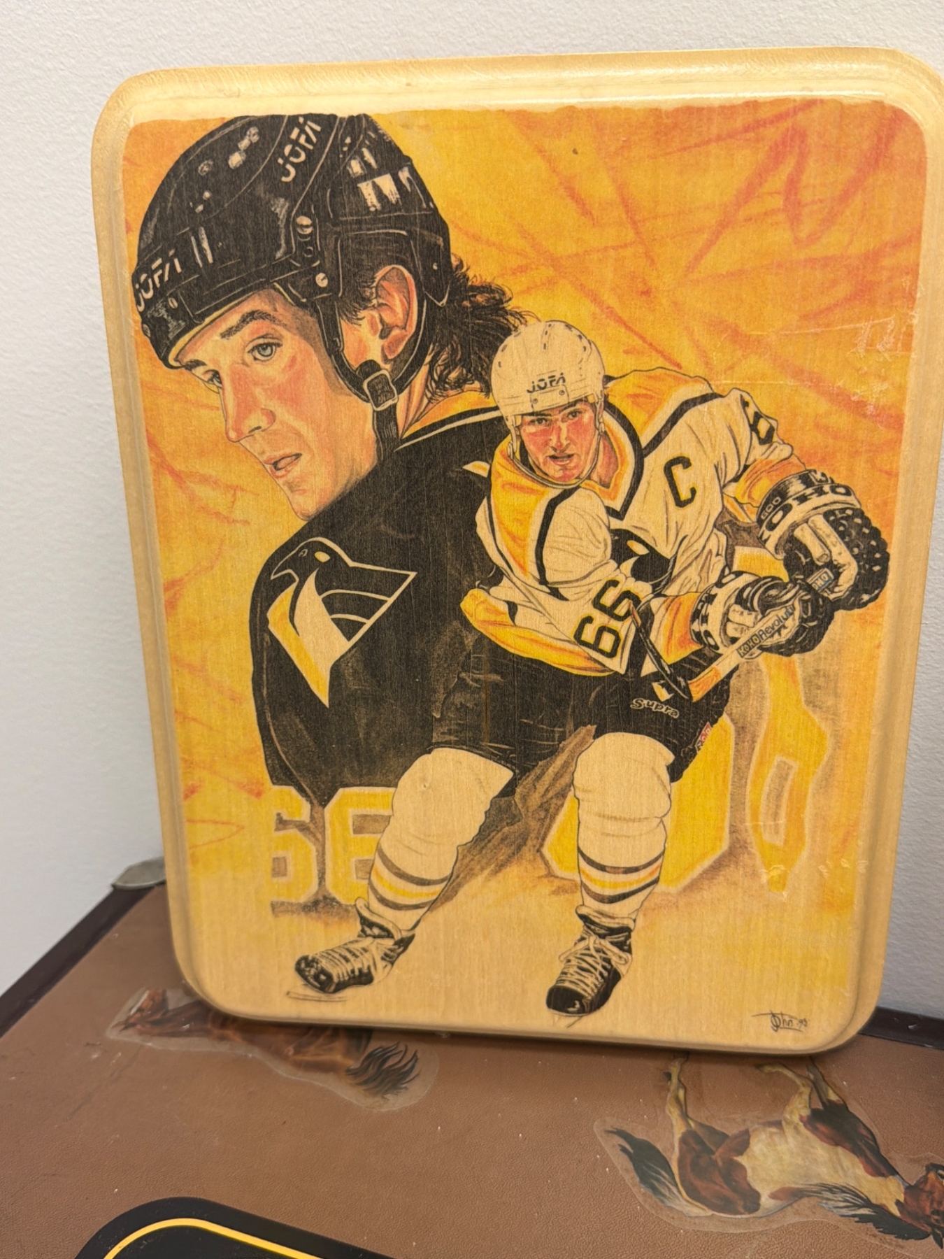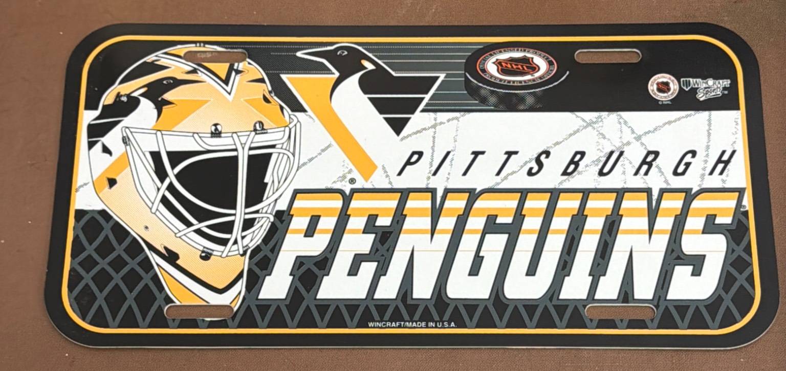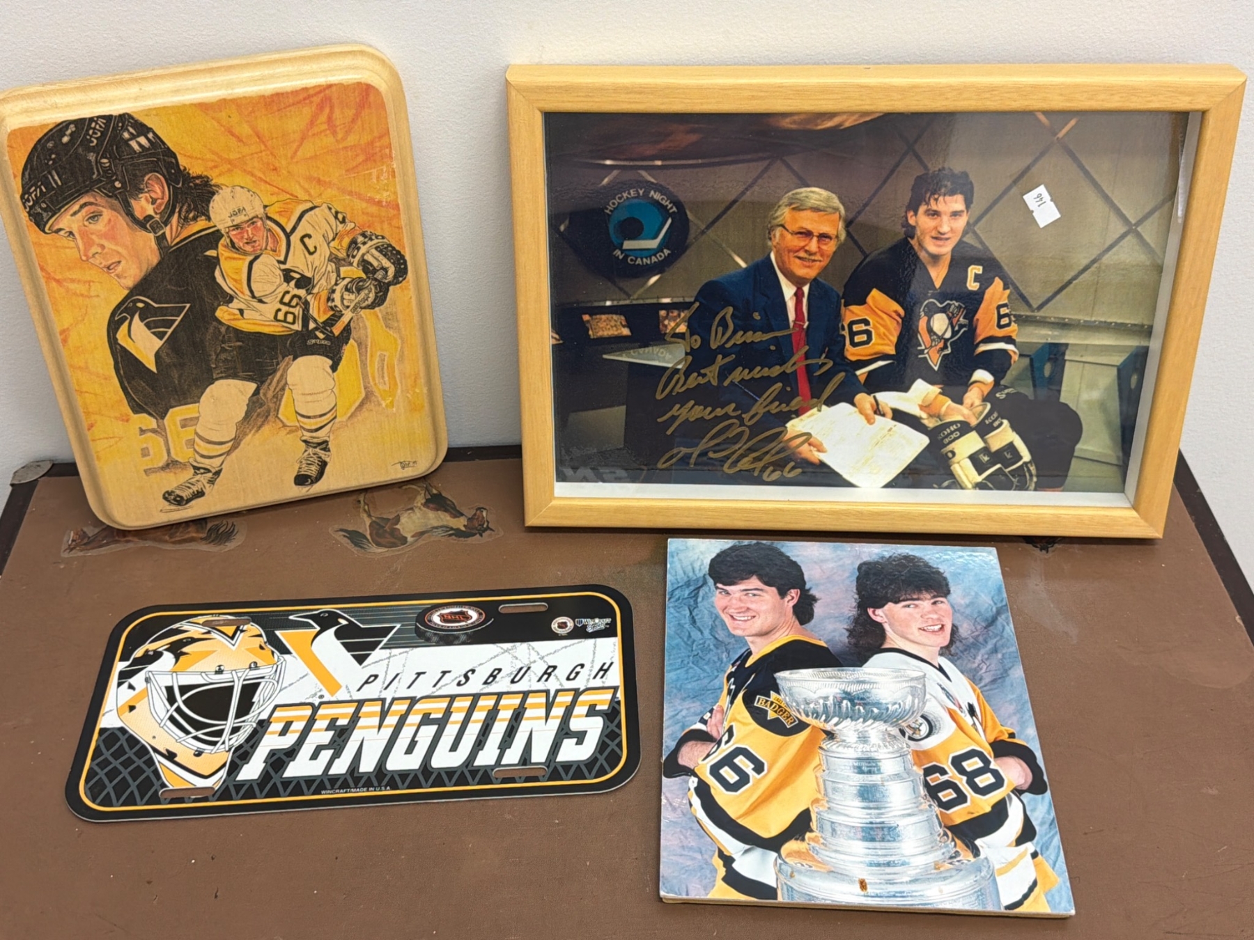 Pittsburgh Penguins-themed memorabilia, including a wooden plaque with engraved illustrations of a player, an autographed framed photo dedicated to ˜Bill", a decorative license plate with the Penguins logo and colors, and a color photo featuring two players with the Stanley Cup. Items show varying degrees of wear, with the autographed photo in a wooden frame.