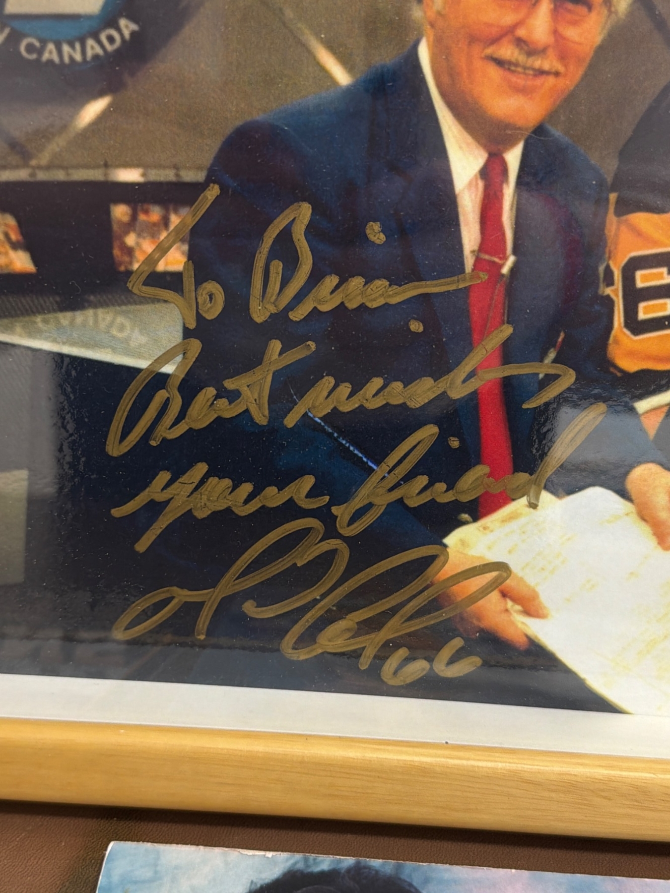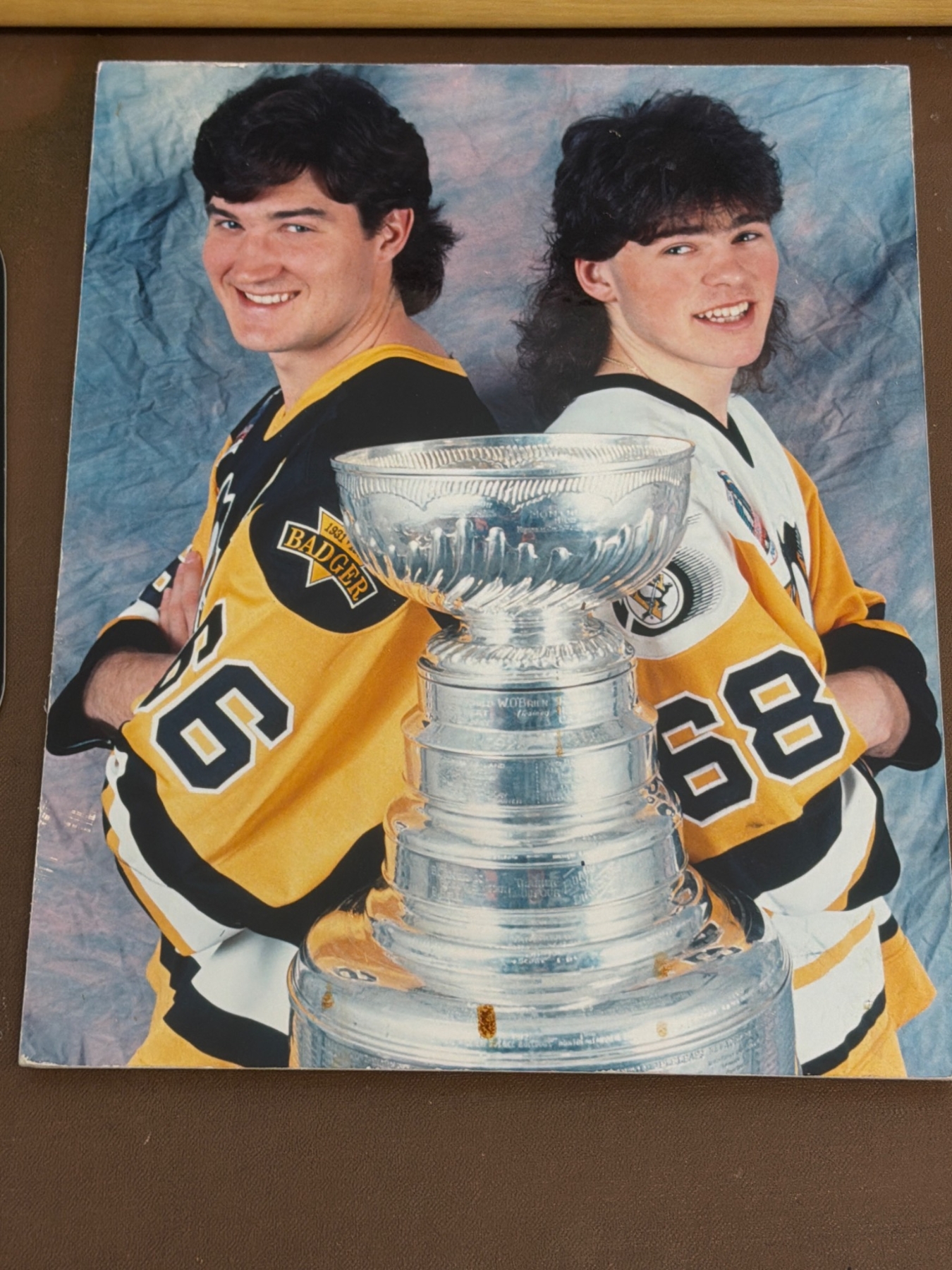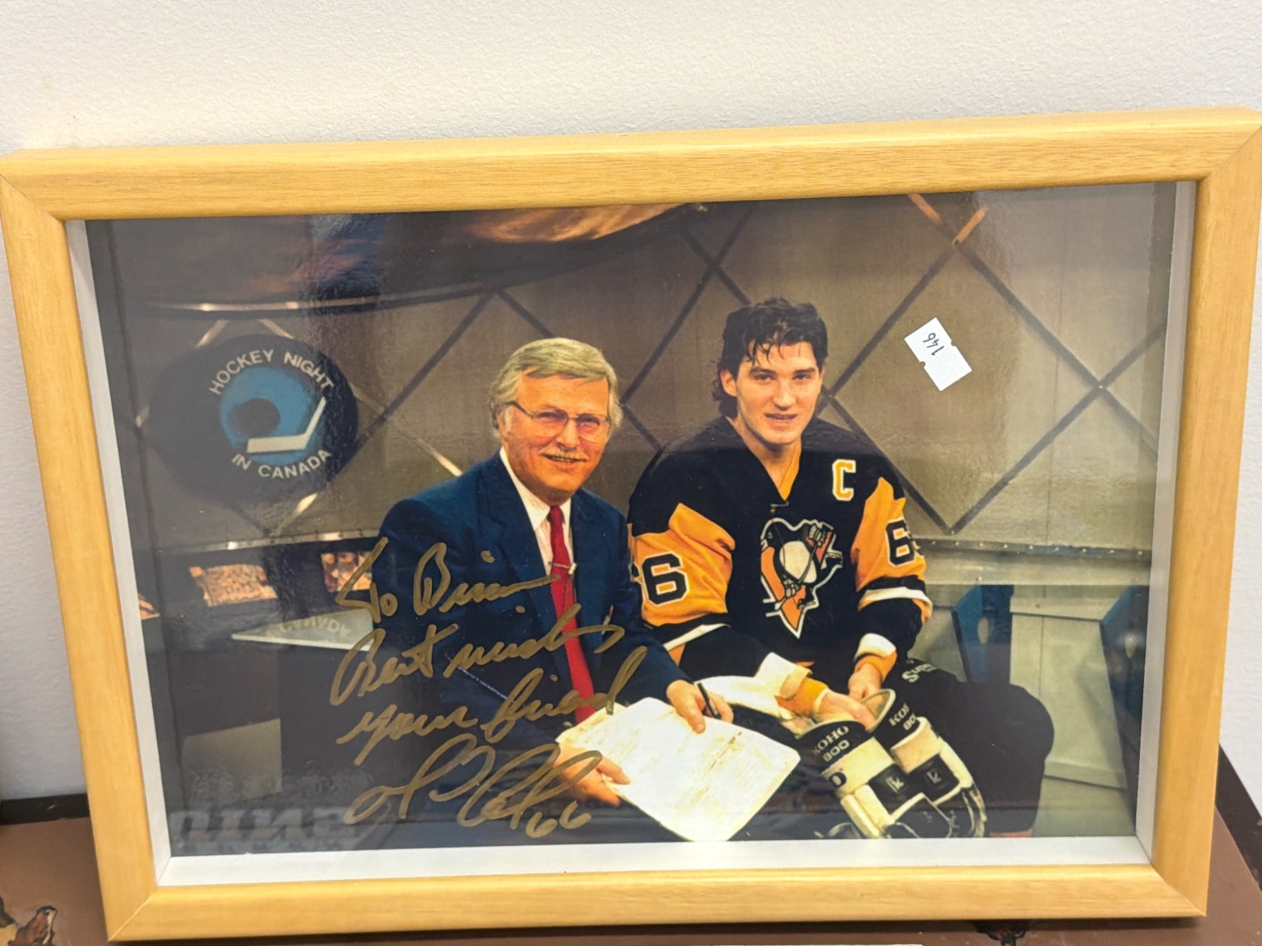 Pittsburgh Penguins-themed memorabilia, including a wooden plaque with engraved illustrations of a player, an autographed framed photo dedicated to ˜Bill", a decorative license plate with the Penguins logo and colors, and a color photo featuring two players with the Stanley Cup. Items show varying degrees of wear, with the autographed photo in a wooden frame.