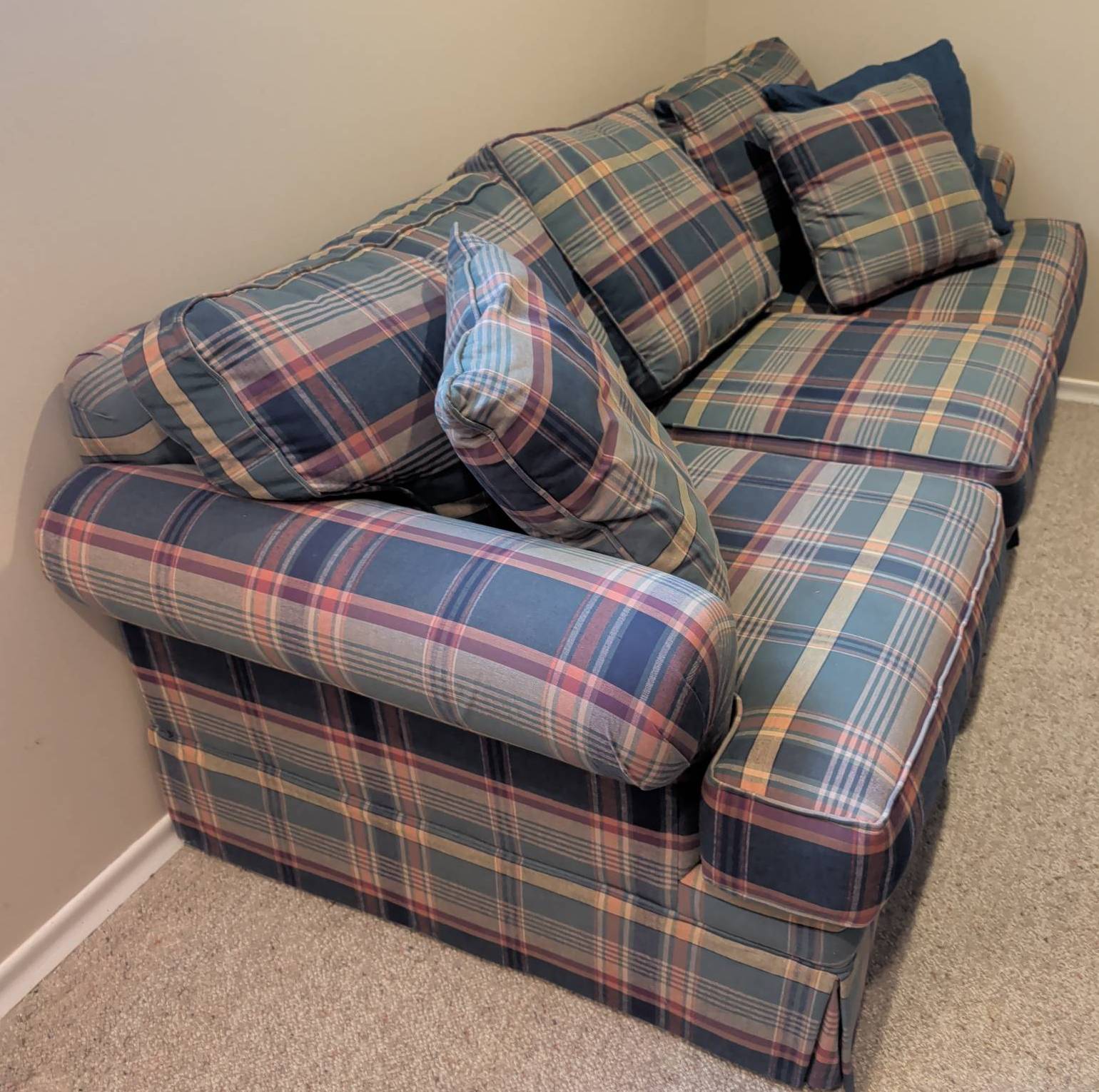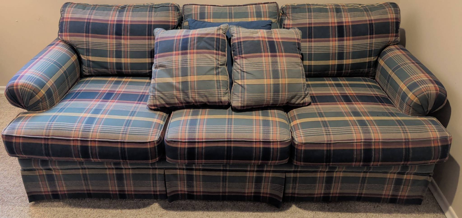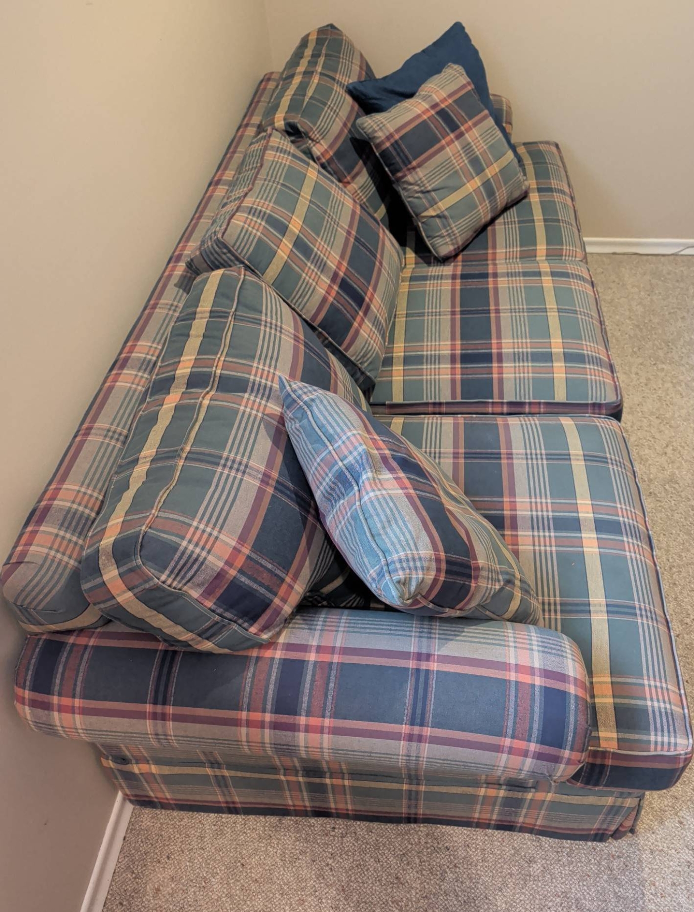 Blue plaid upholstered sofa featuring a cozy padded design, including armrests and three removable seat cushions. The sofa comes with matching scatter cushions for added comfort and style. Some signs of wear are visible. Sofa dimensions: 78 inches (length) x 36 inches (depth) x 35 inches (height). Perfect for a family room or den.