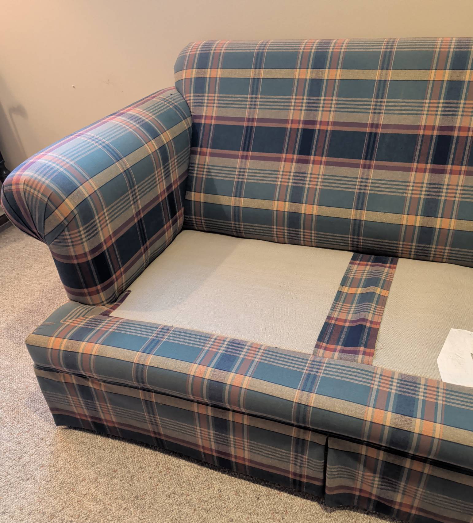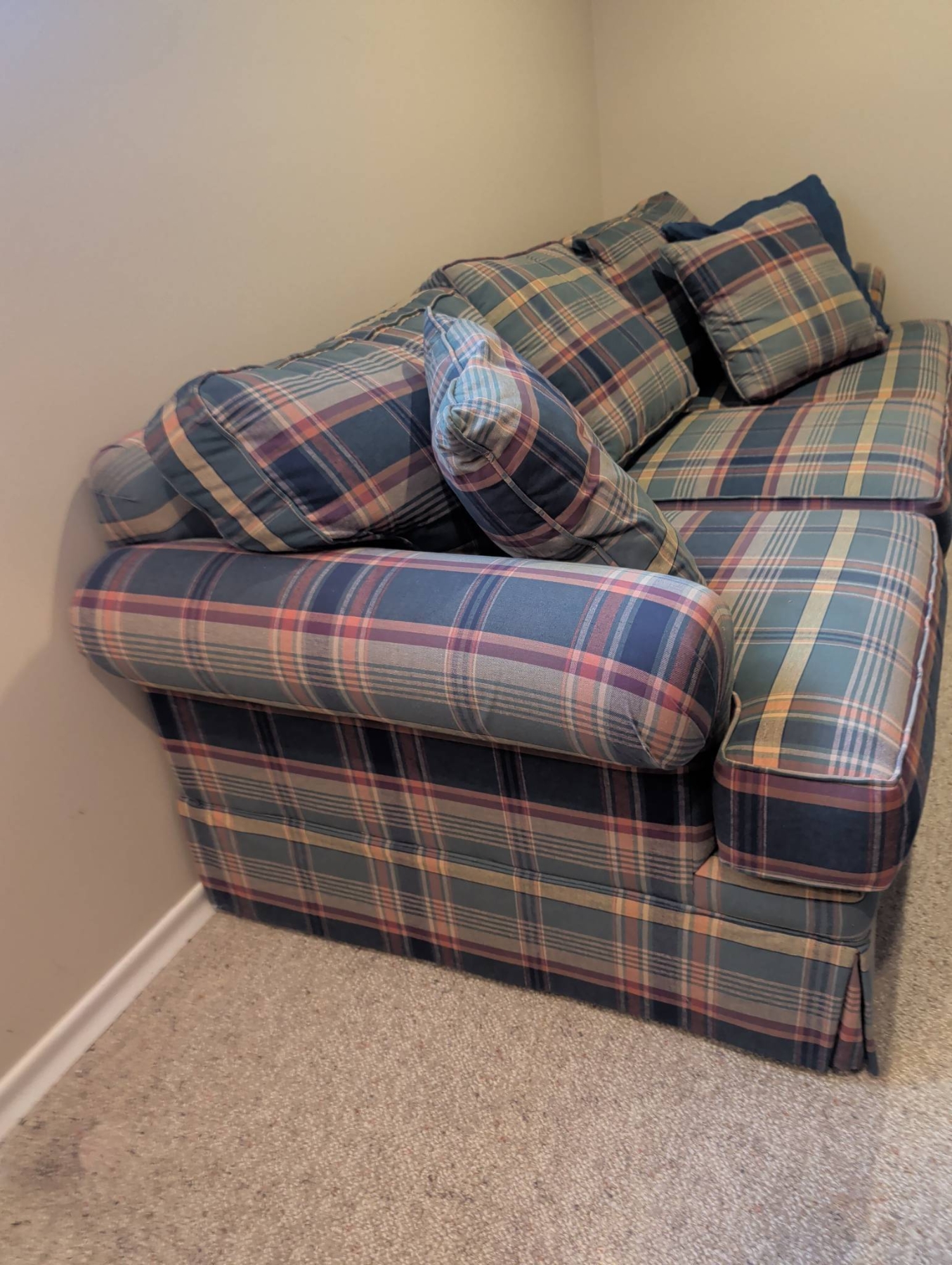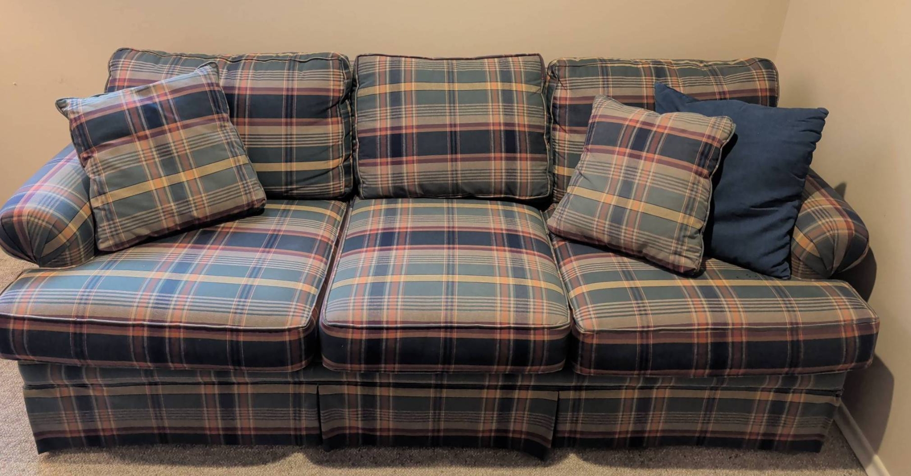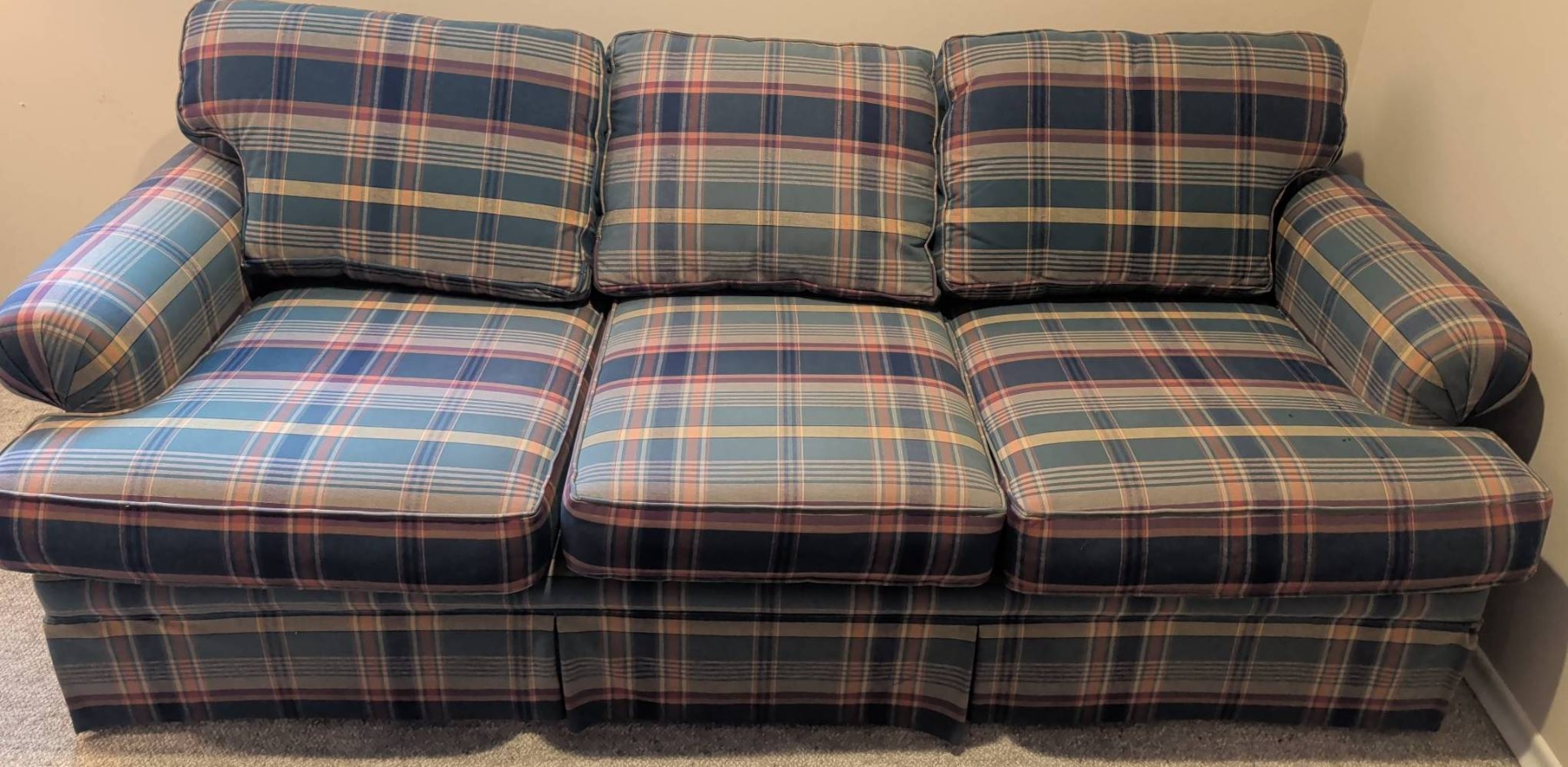Blue plaid upholstered sofa featuring a cozy padded design, including armrests and three removable seat cushions. The sofa comes with matching scatter cushions for added comfort and style. Some signs of wear are visible. Sofa dimensions: 78 inches (length) x 36 inches (depth) x 35 inches (height). Perfect for a family room or den.