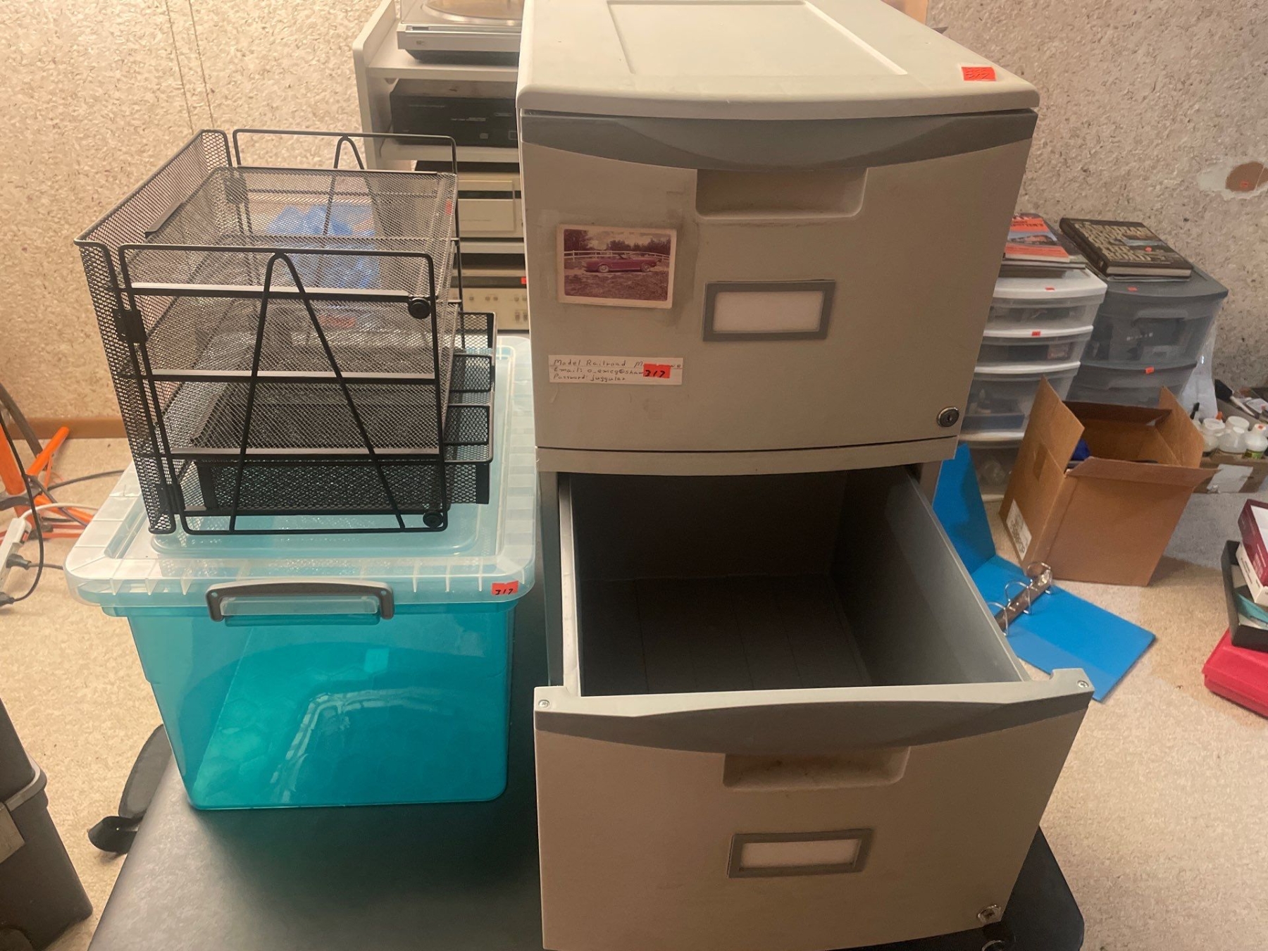 Plastic Locking File Cabinet (26" High x 14.5" Wide x 18" Depth) , 2 Drawer, Plastic Storage Tub (12" High x 12" x 14" Wide x 12" Depth, Metal Organizer
