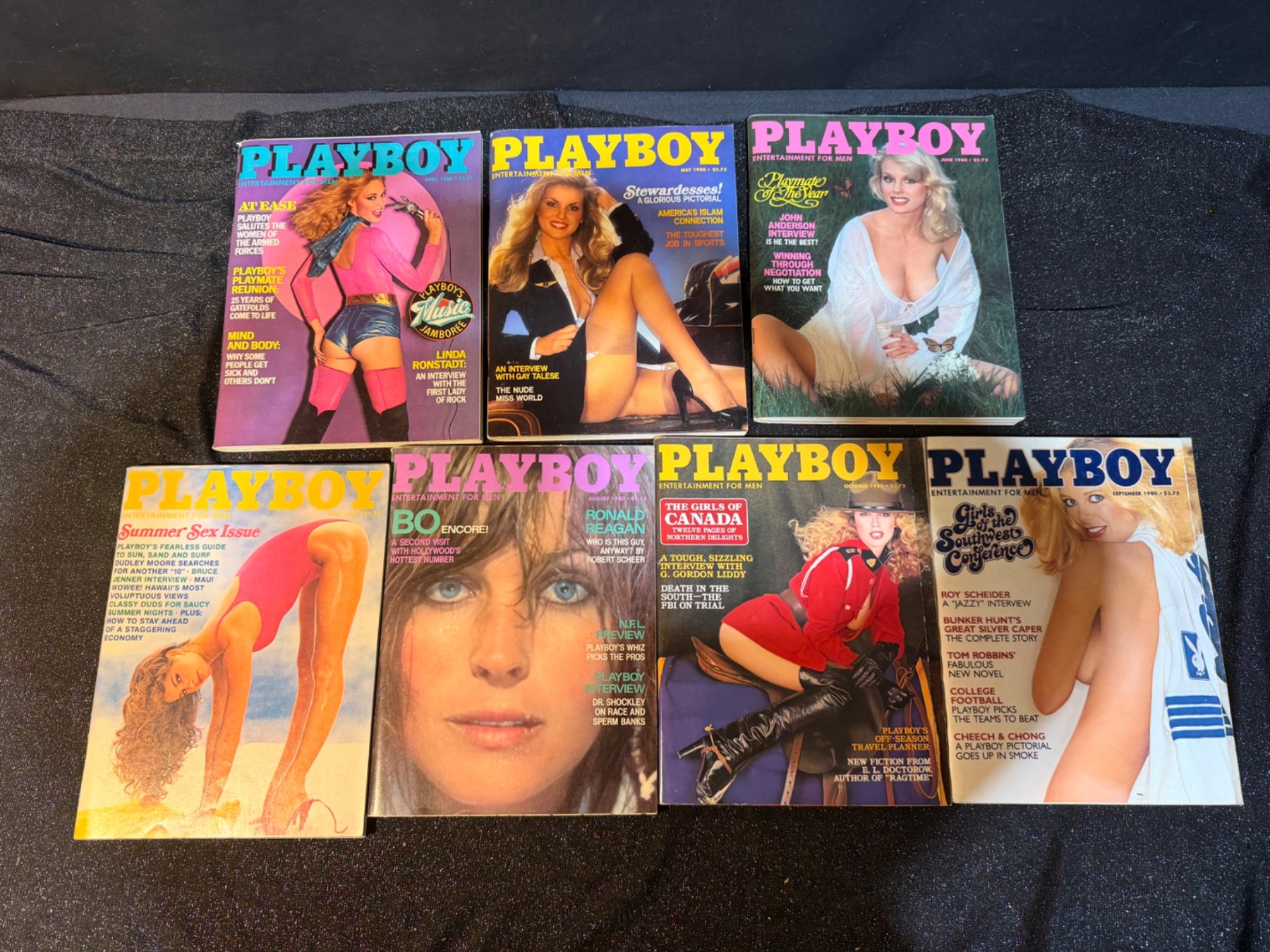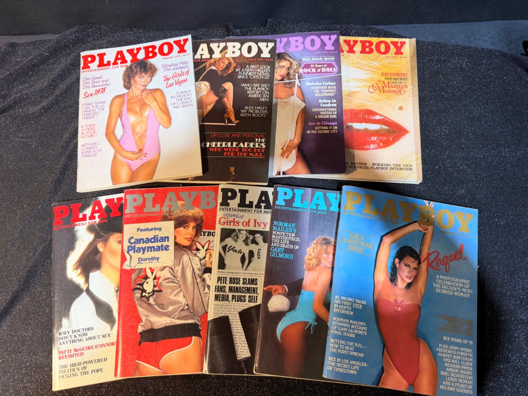 Playboy magazines spanning 1974 to 1982, showcasing iconic covers and content from the era. Includes approximately 40 issues in good vintage condition, highlighting cultural and artistic styles. Also features a bonus item: 'The Joy of Sex: A Gourmet Guide to Love Making,' complete and illustrated edition. Ideal for collectors and enthusiasts of 20th-century periodicals.
