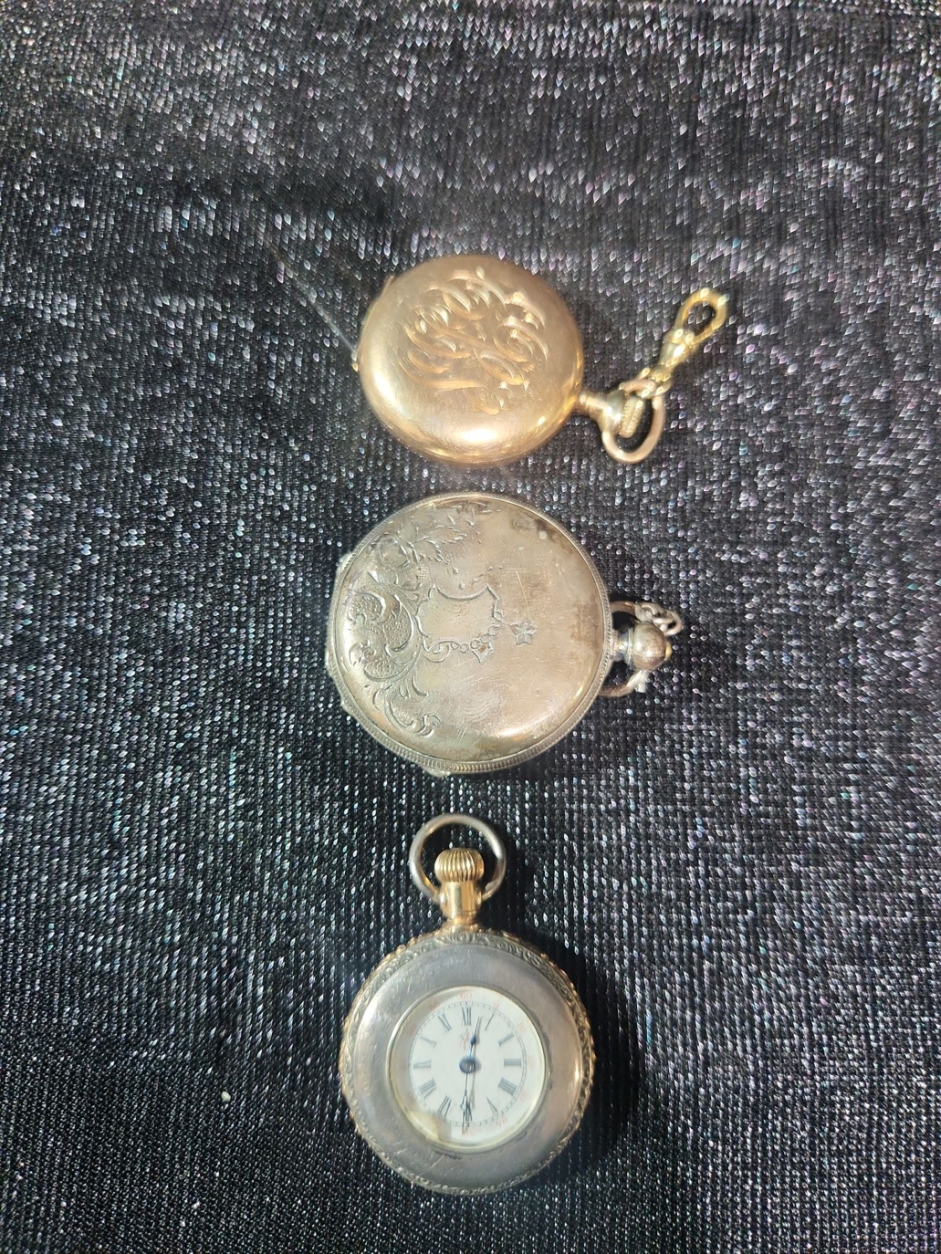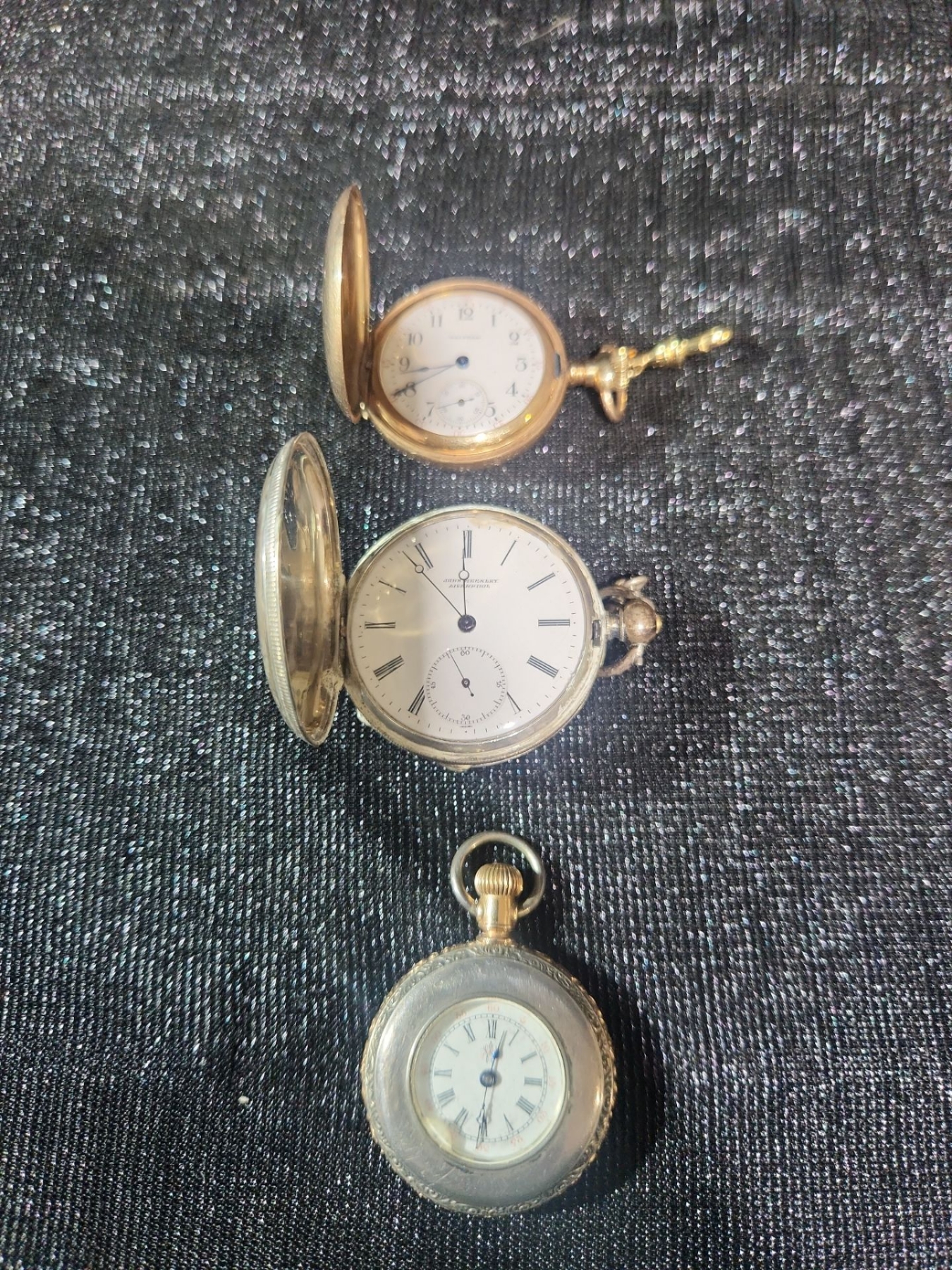 3 different pocket watches. Batteries will need to be replaced. Nice decorative etchings on the cases