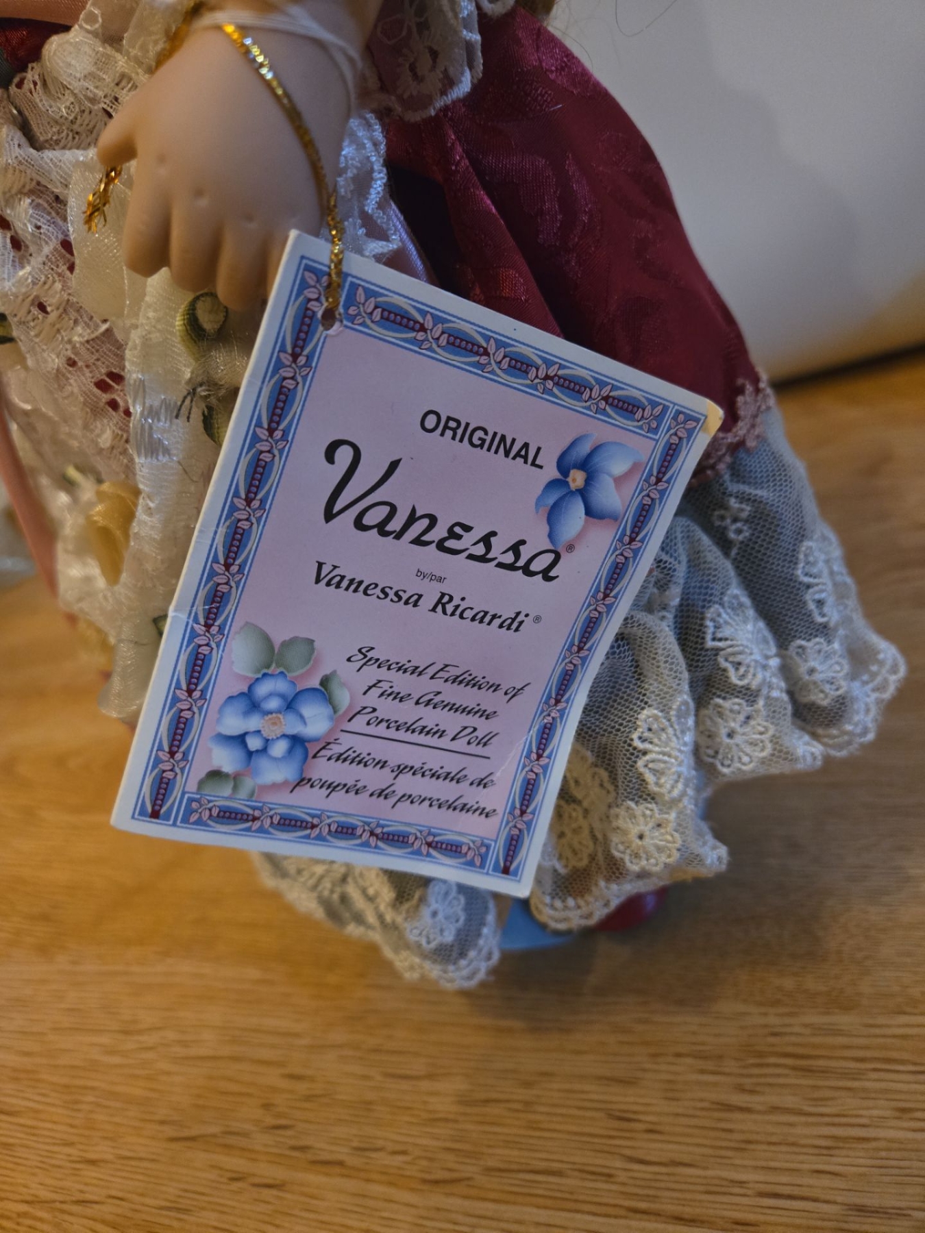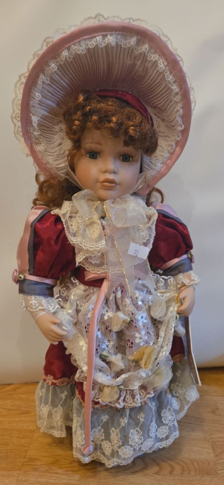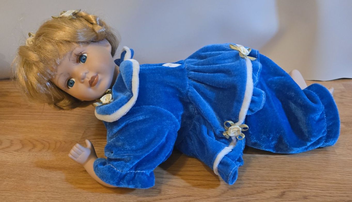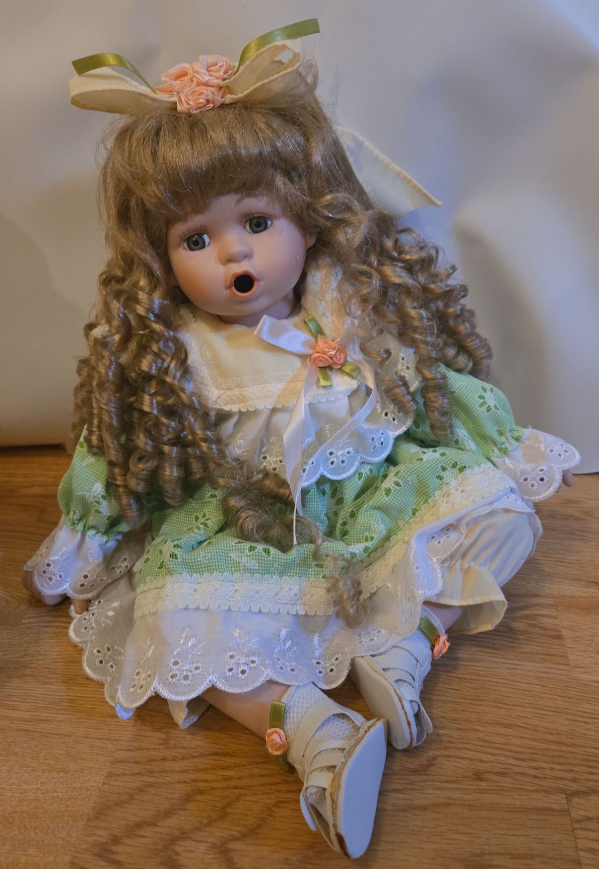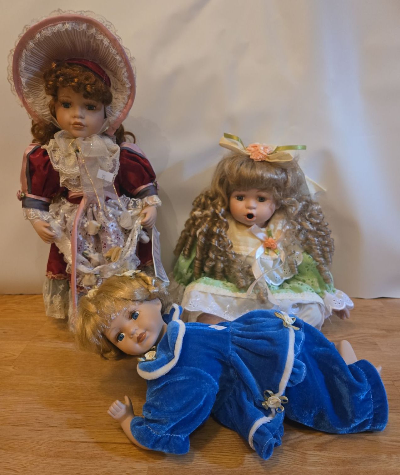 Porcelain Doll Collection: Vanessa, Baby in Blue PJ's, Girl in Green. Tallest is 17T