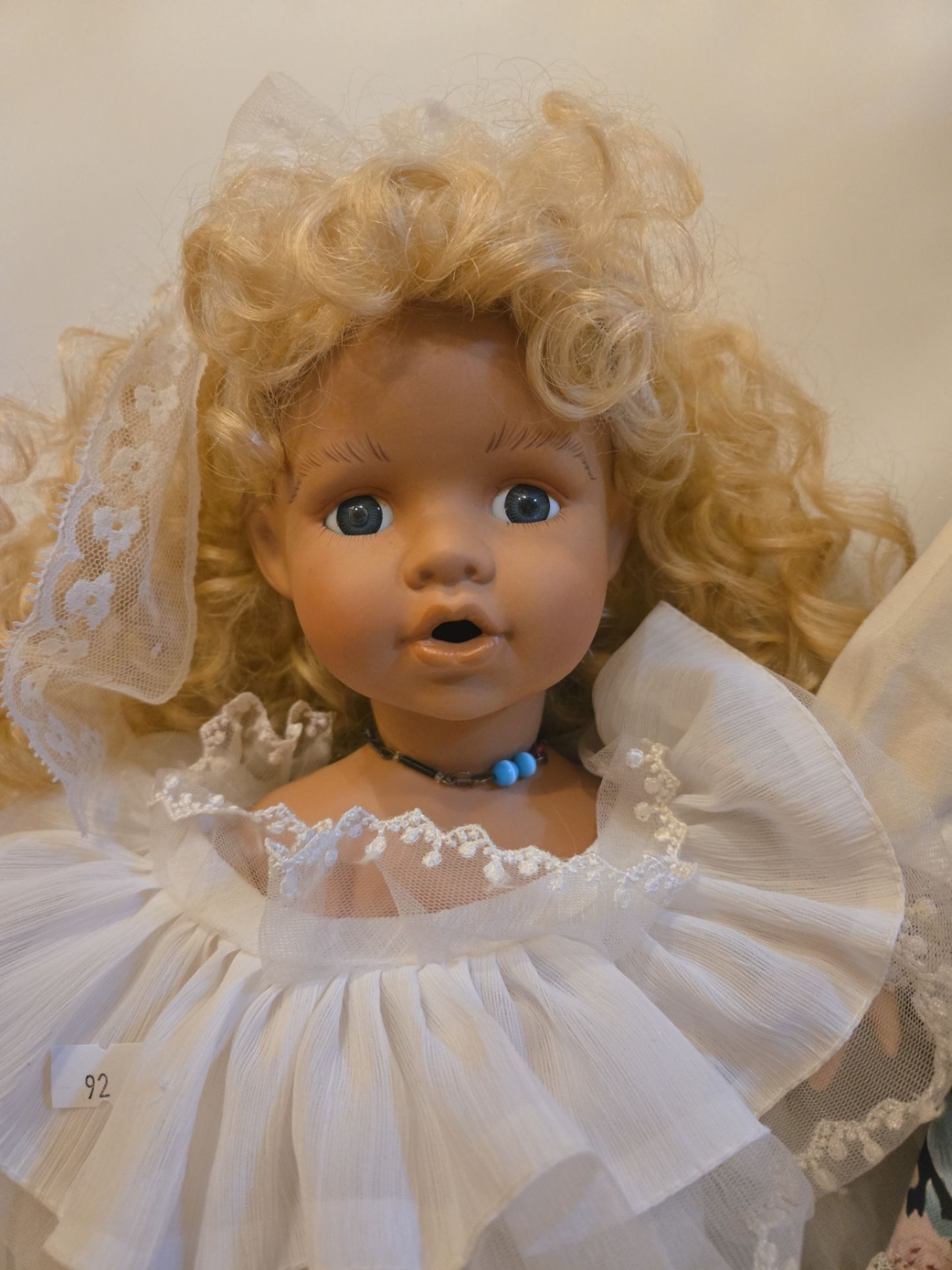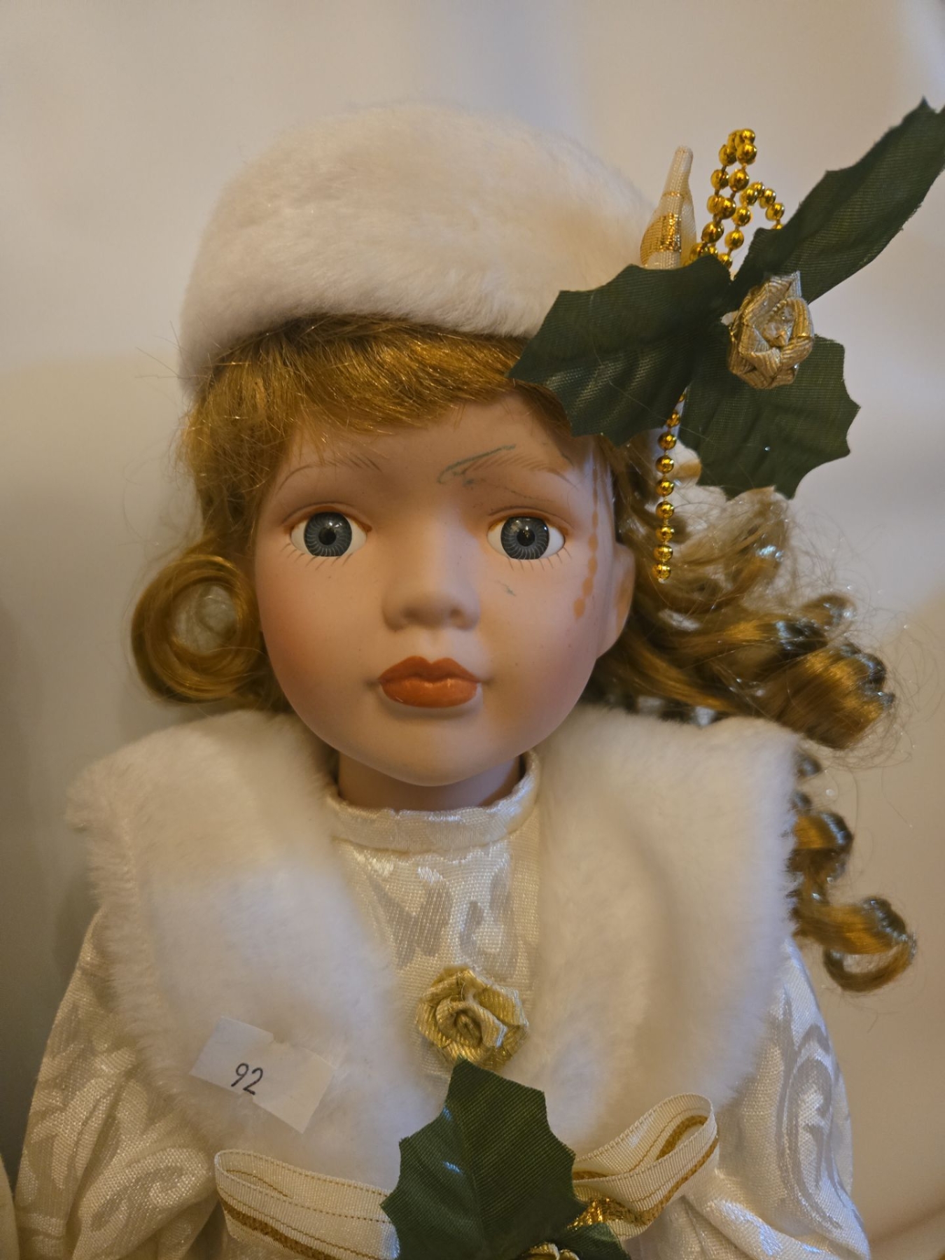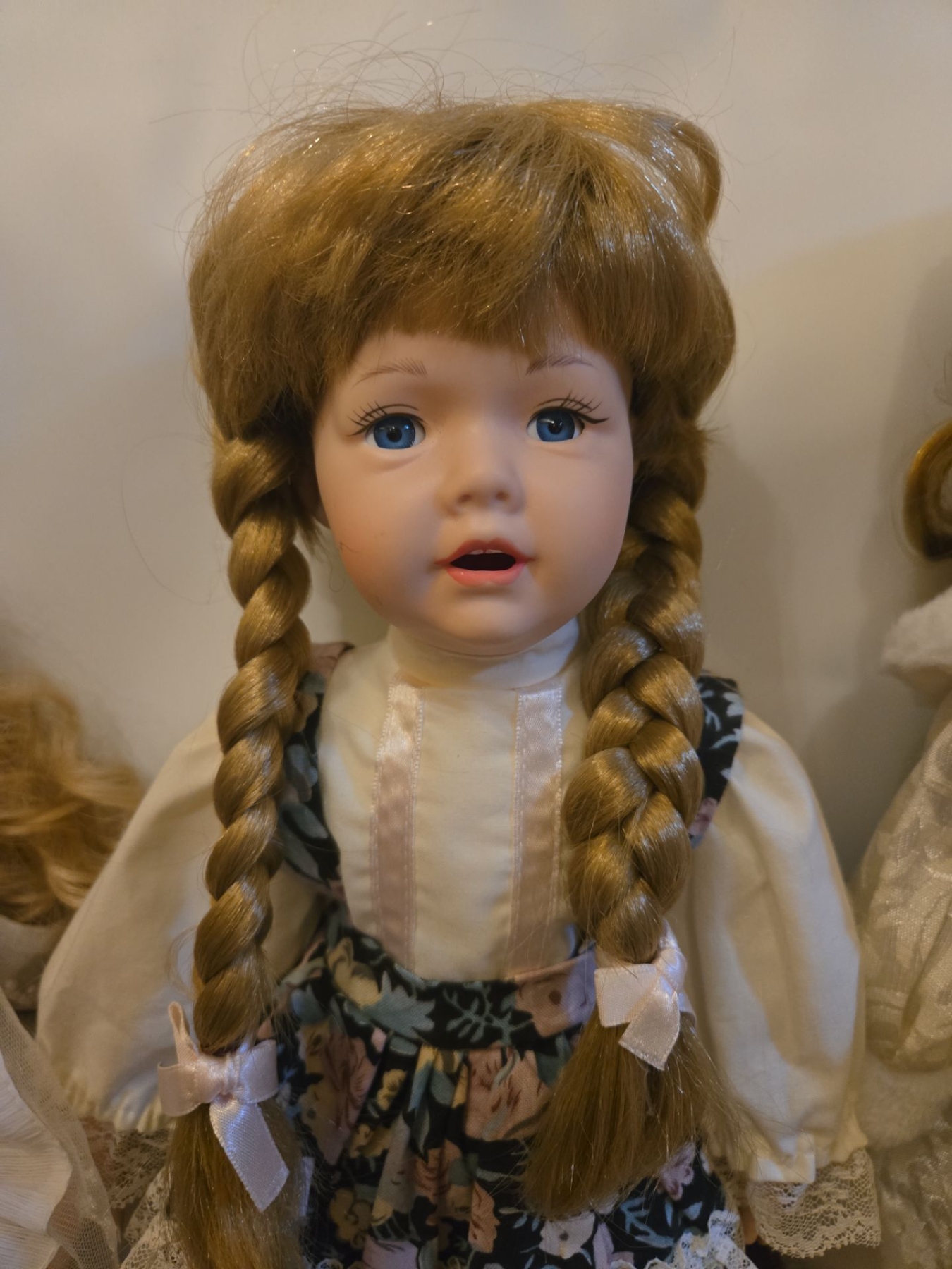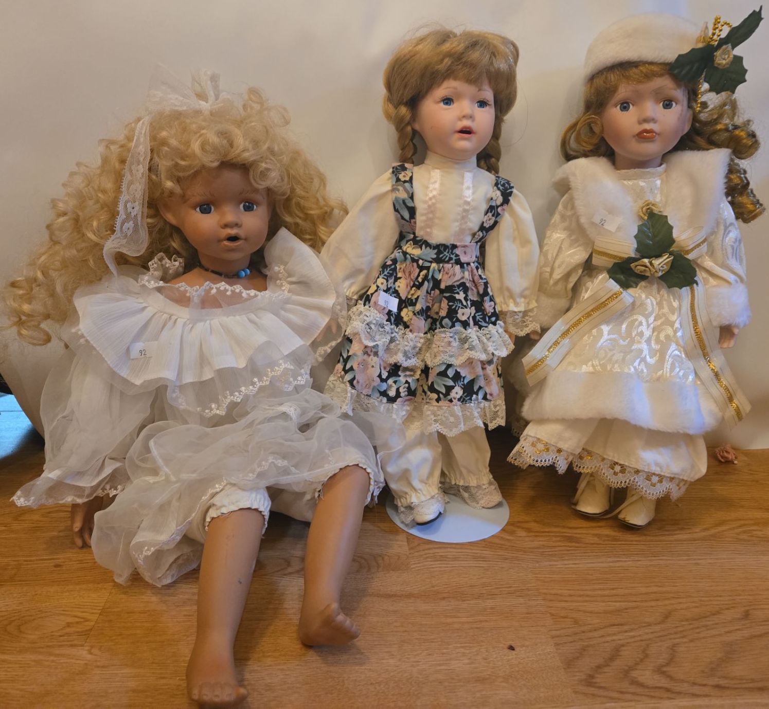 Porcelain Dolls: Caroler, Cottage Chic, Farm Girl. Tallest is 21T