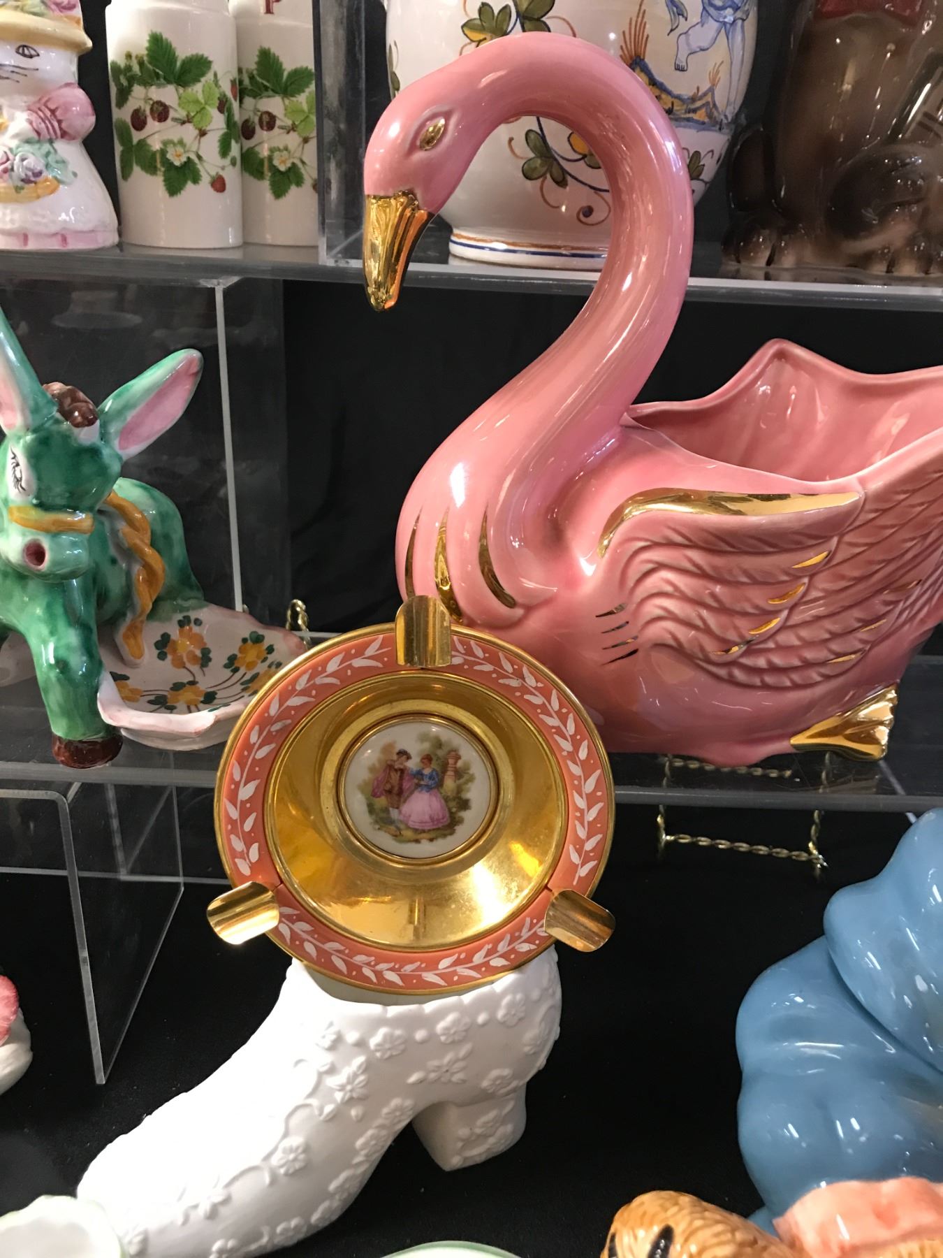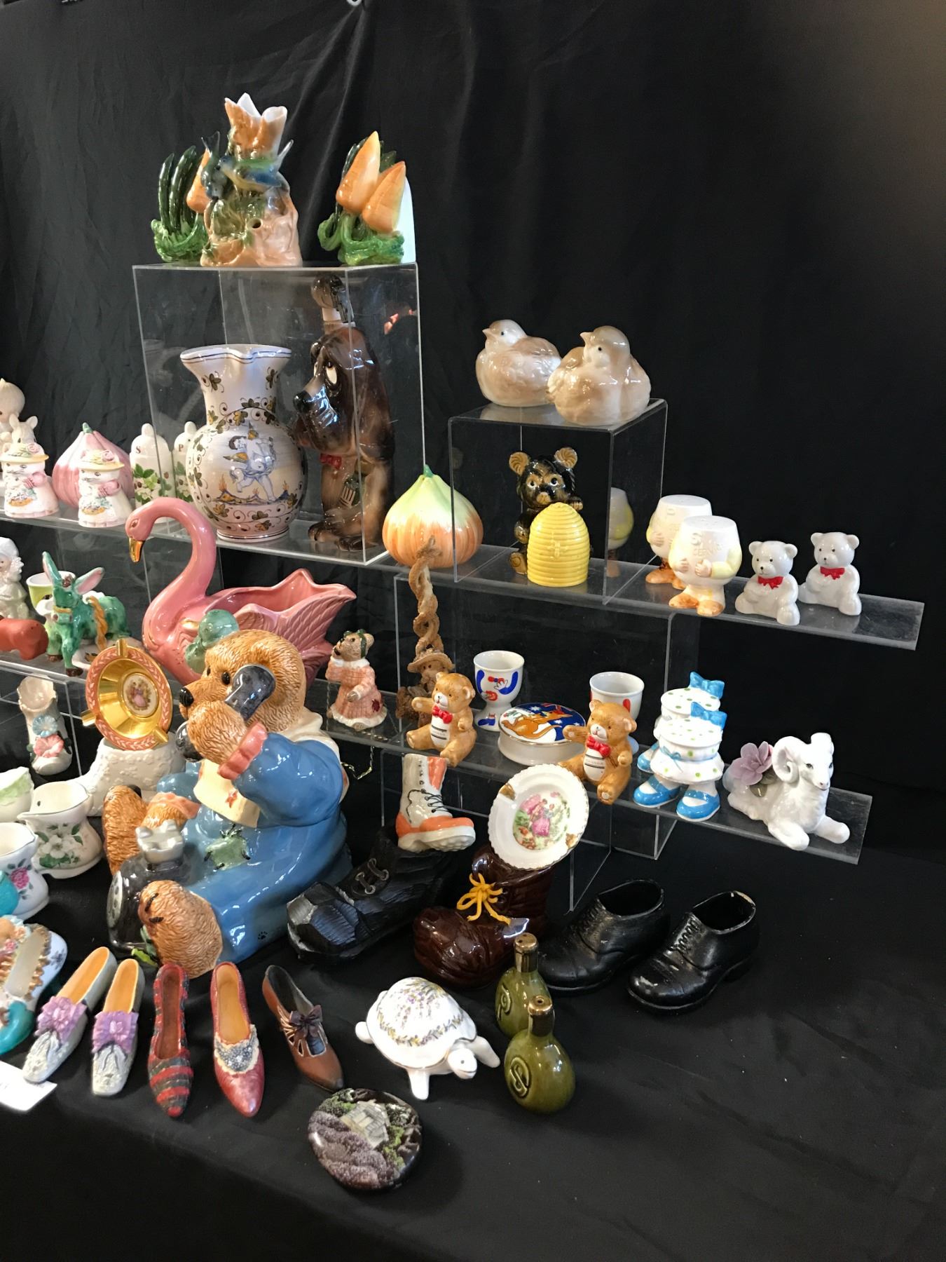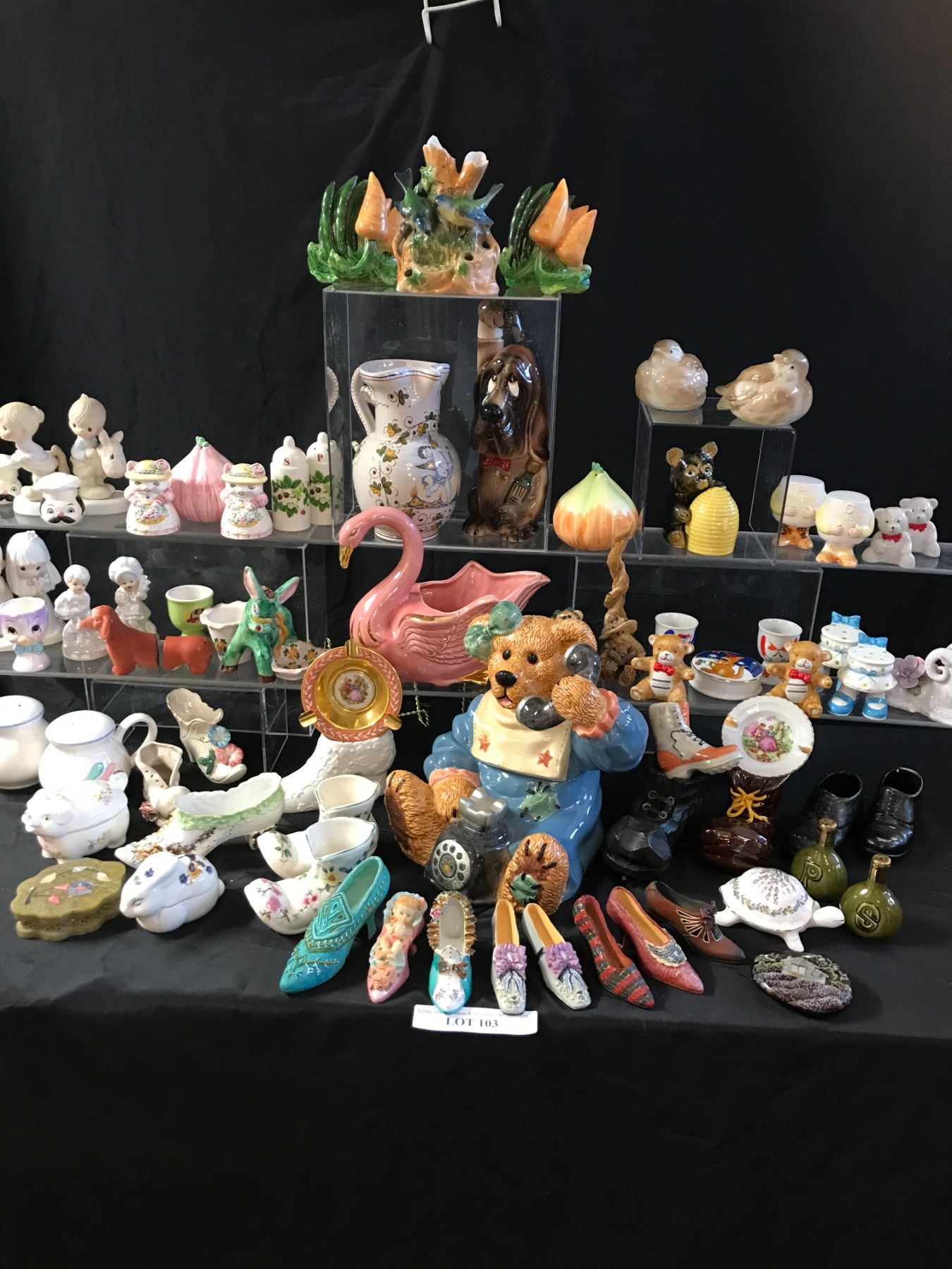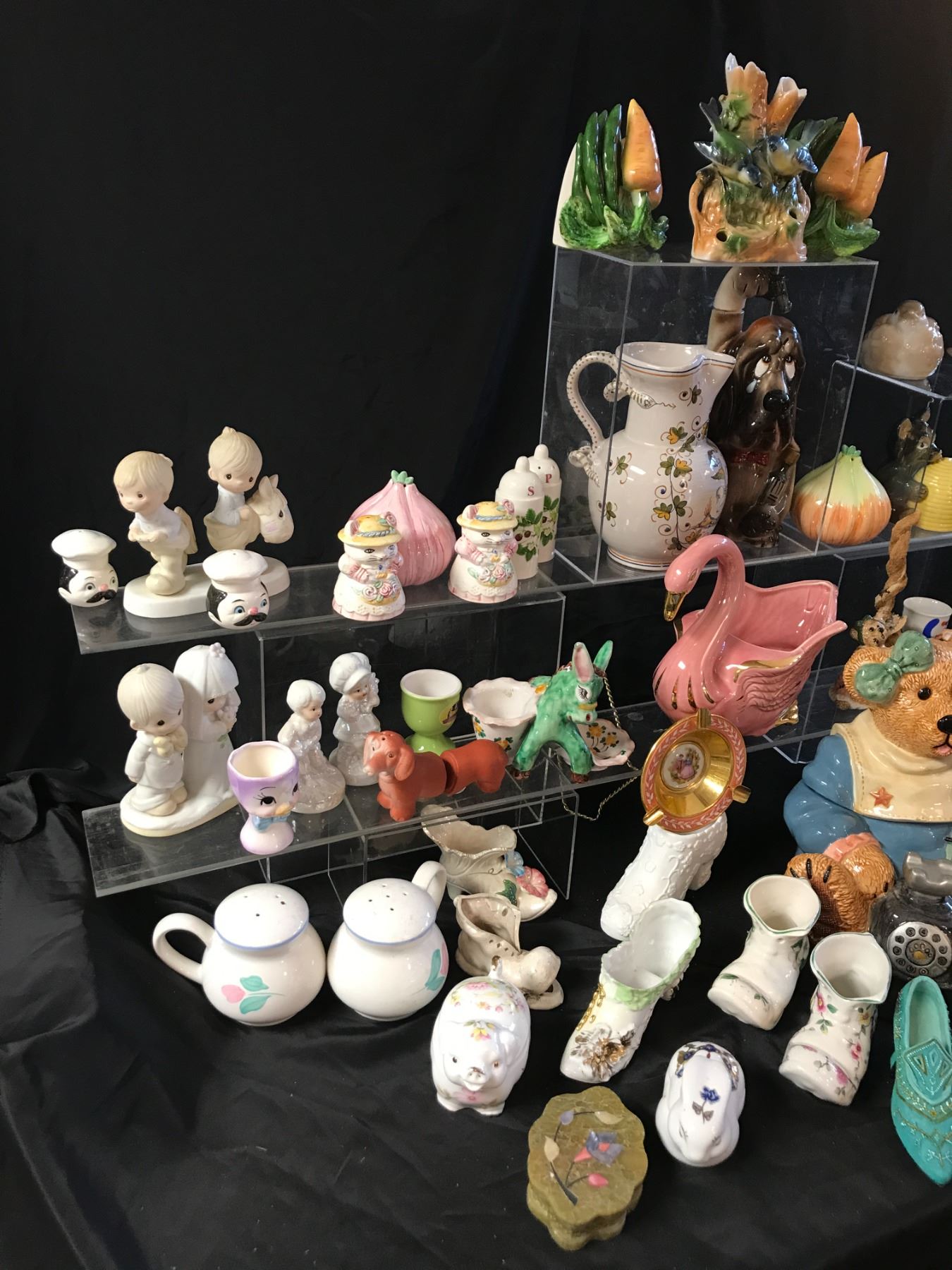 Precious Moments Figurines, Porcelain Shoe Collection, Egg Cups, Salt & Pepper Shakers, Vintage Teddy Bear Cookie Jar, Limoges Ashtrays, Swan Dish, Vintage Hound Dog Decanter, Pitcher, Various Bird, Carrot. Ram Figurines etc