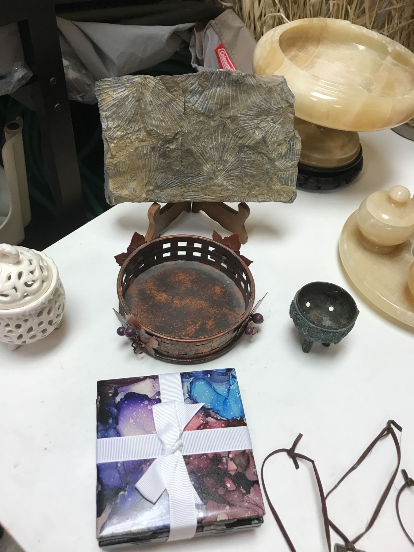 Prehistoric Palm Fossil, Elephant Candle Holder, Coasters, Soapstone Set, 2 Baskets, Metal Owl Holde