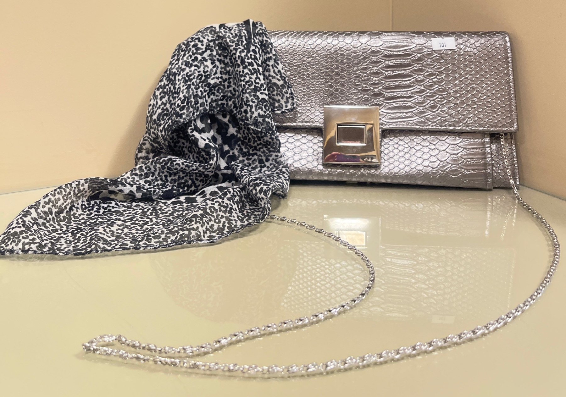 Pretty Silver Snake Skin Patterned Clutch/Purse w/ Printed Scarf