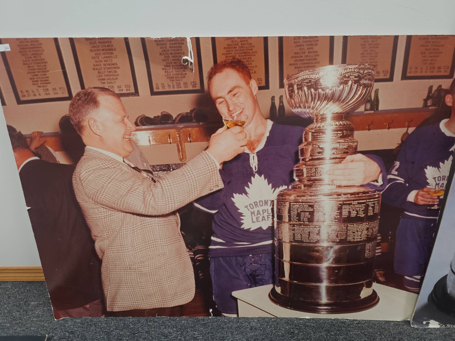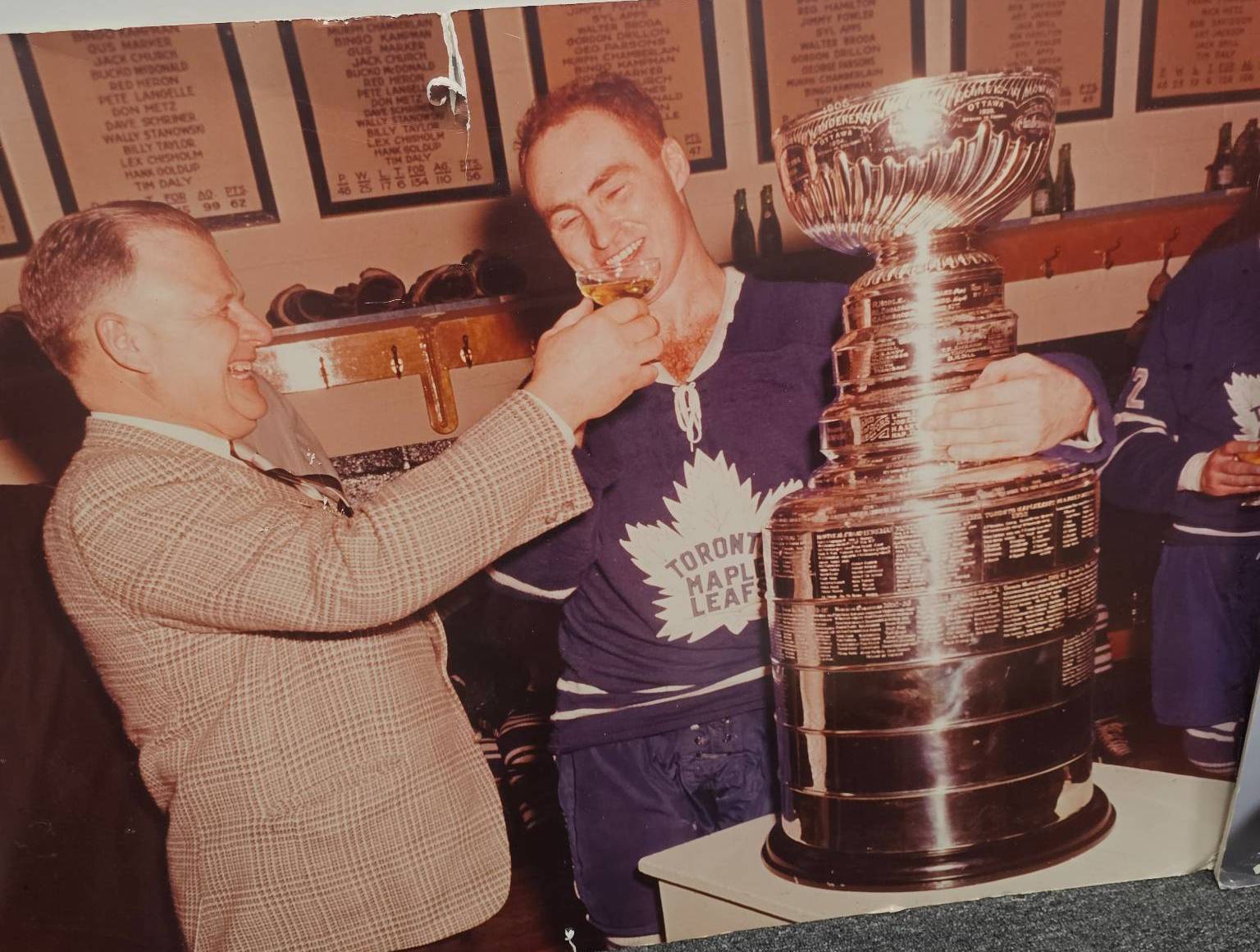 Framed photo print measuring 36" X 27" depicting a joyful Toronto Maple Leafs player celebrating with the iconic Stanley Cup. This piece captures a timeless moment of hockey history, making it a compelling addition for sports memorabilia collectors and NHL enthusiasts.