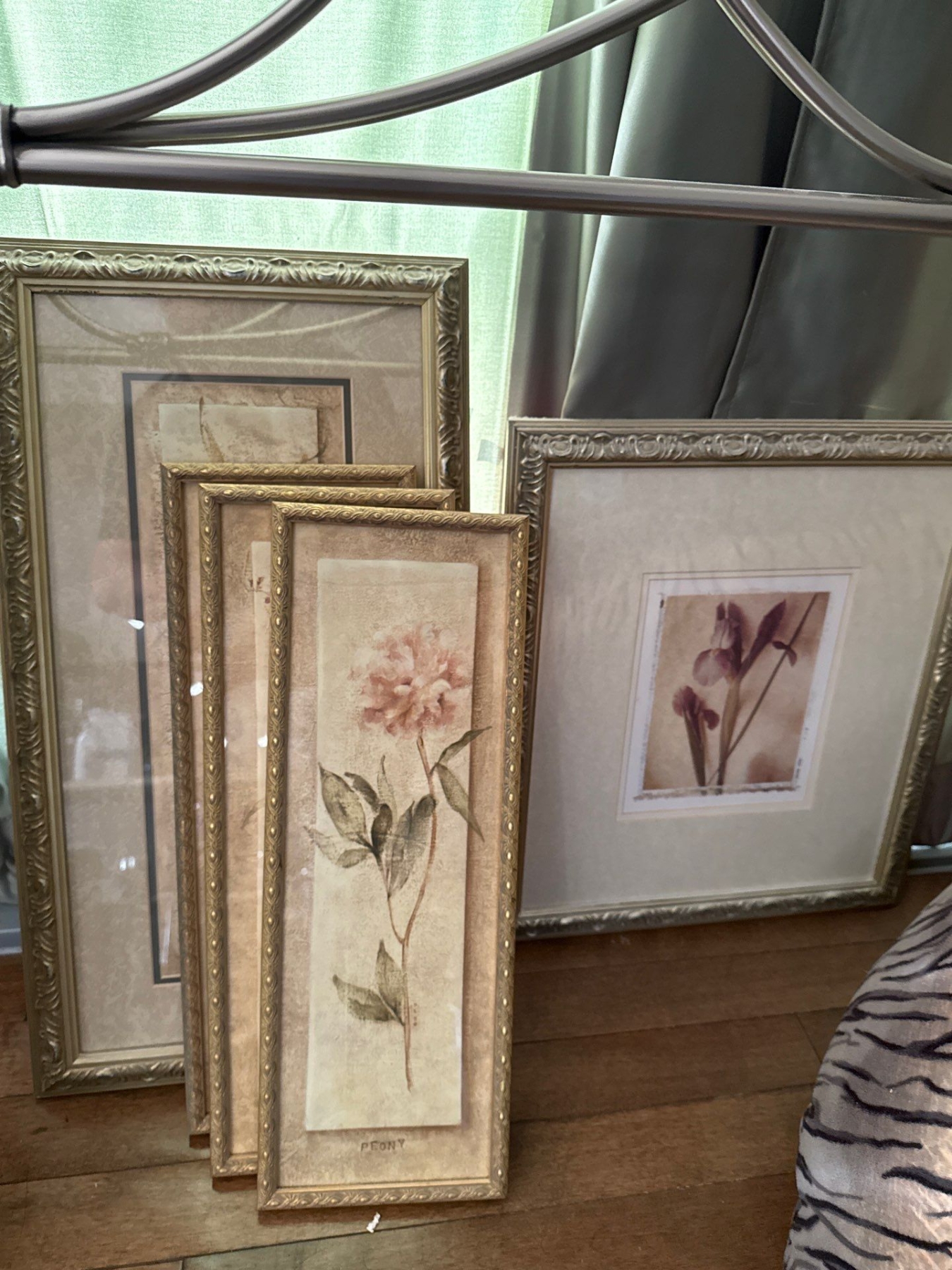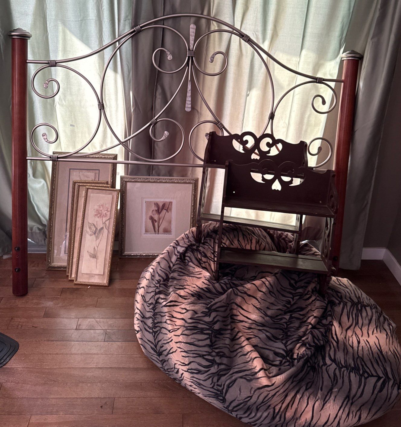 Queen Head Board Tiger Print Bean Bag Chair Pair of Shelves & Assorted Art Prints